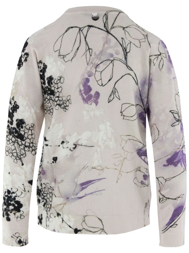 A pullover by High with a graphic floral print in various shades of black and lilac on an off-white background. The pullover has a V-neck with a finely ribbed knitted trim along the edge. This pullover can be hand-washed.