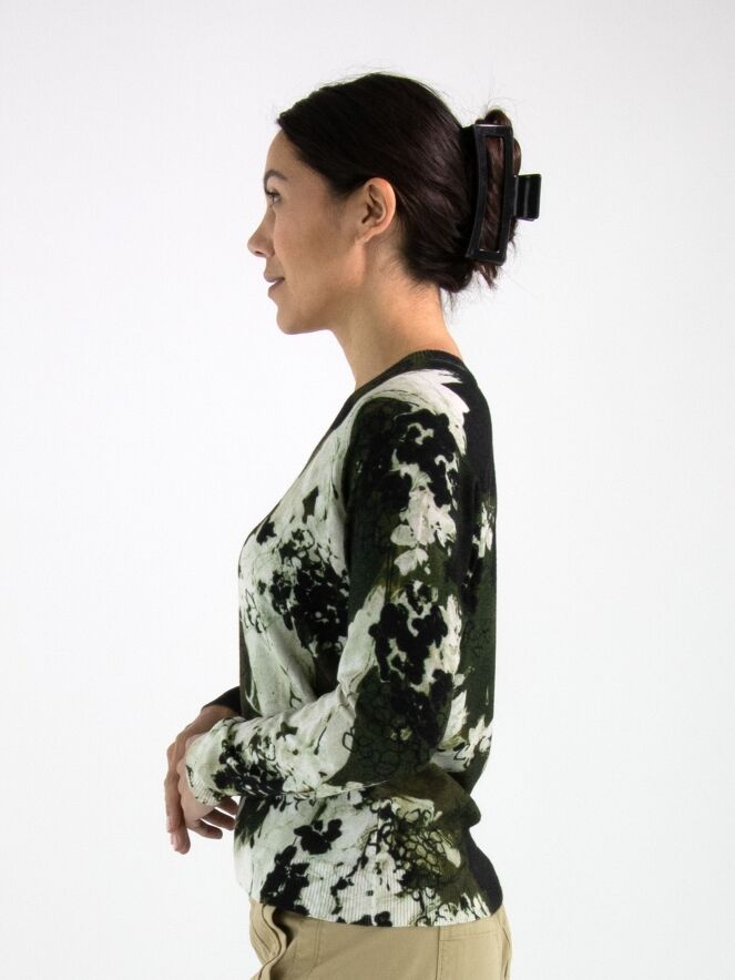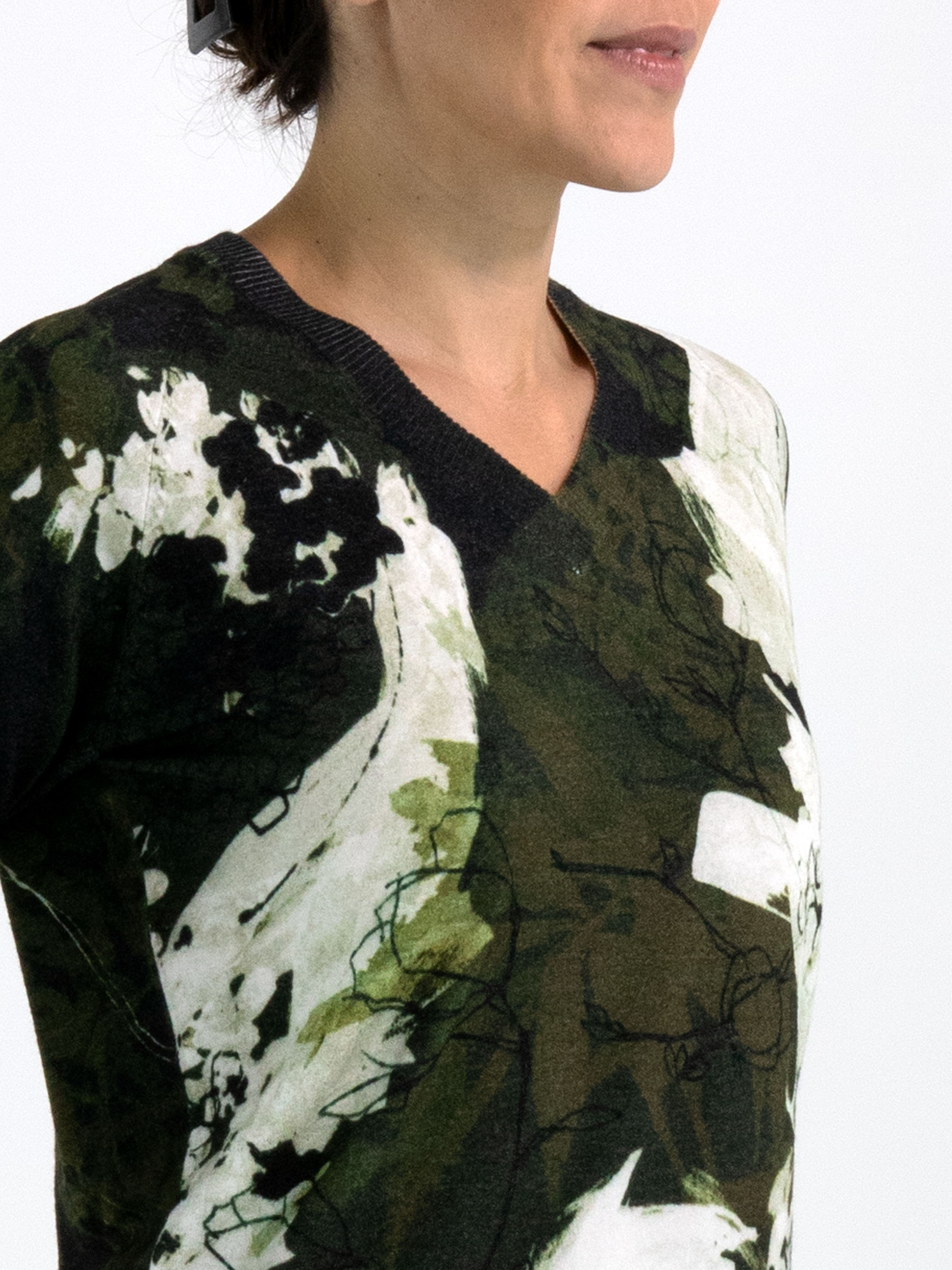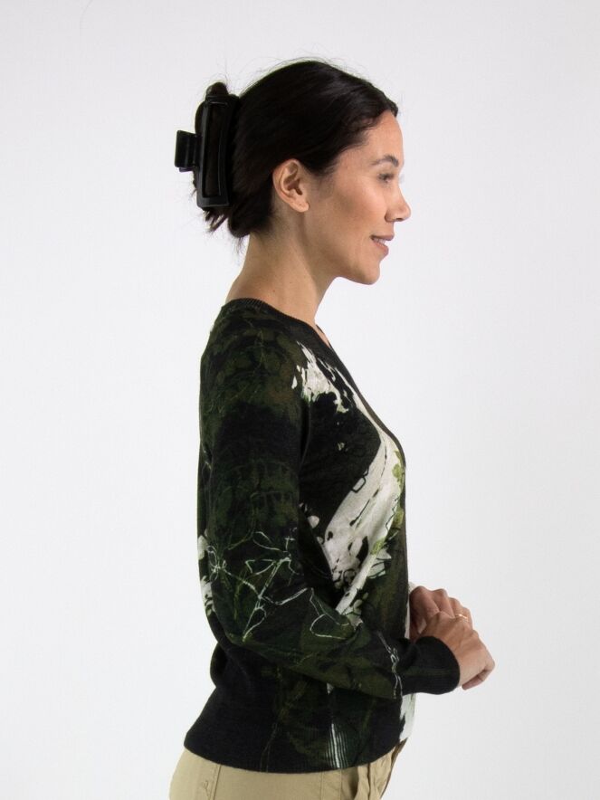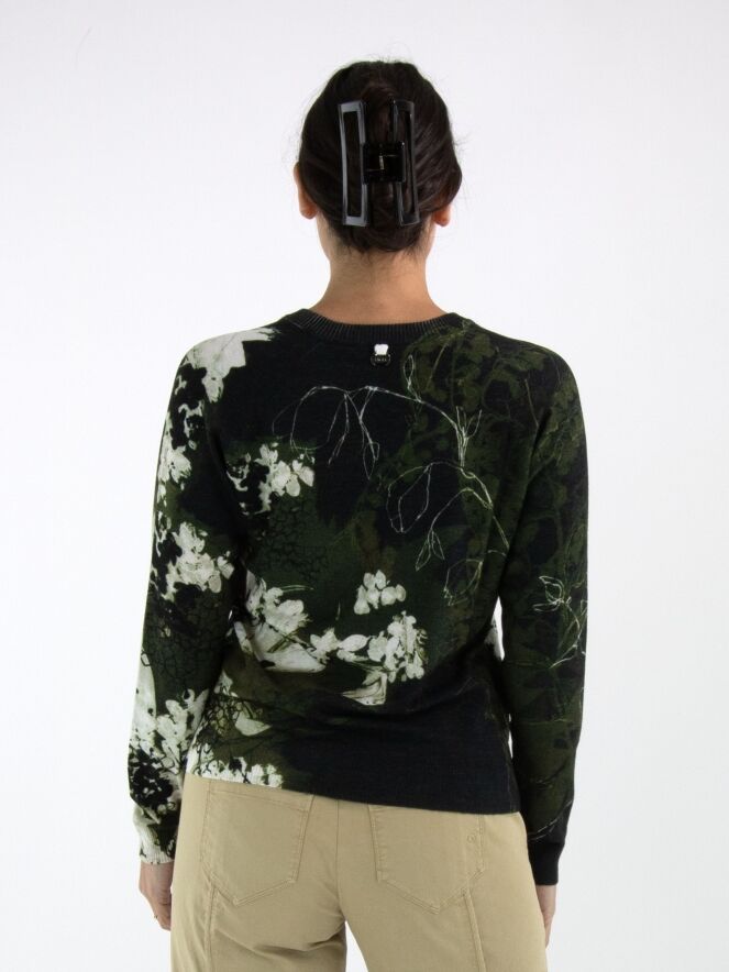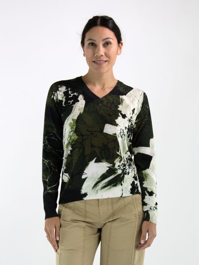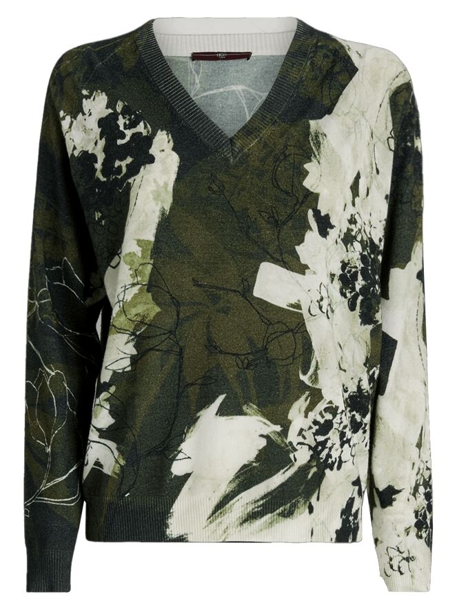 A pullover by High featuring a graphic floral print in shades of black and olive green on an off-white background. The V-neckline is finished with a finely ribbed knitted trim. This pullover should be hand-washed.