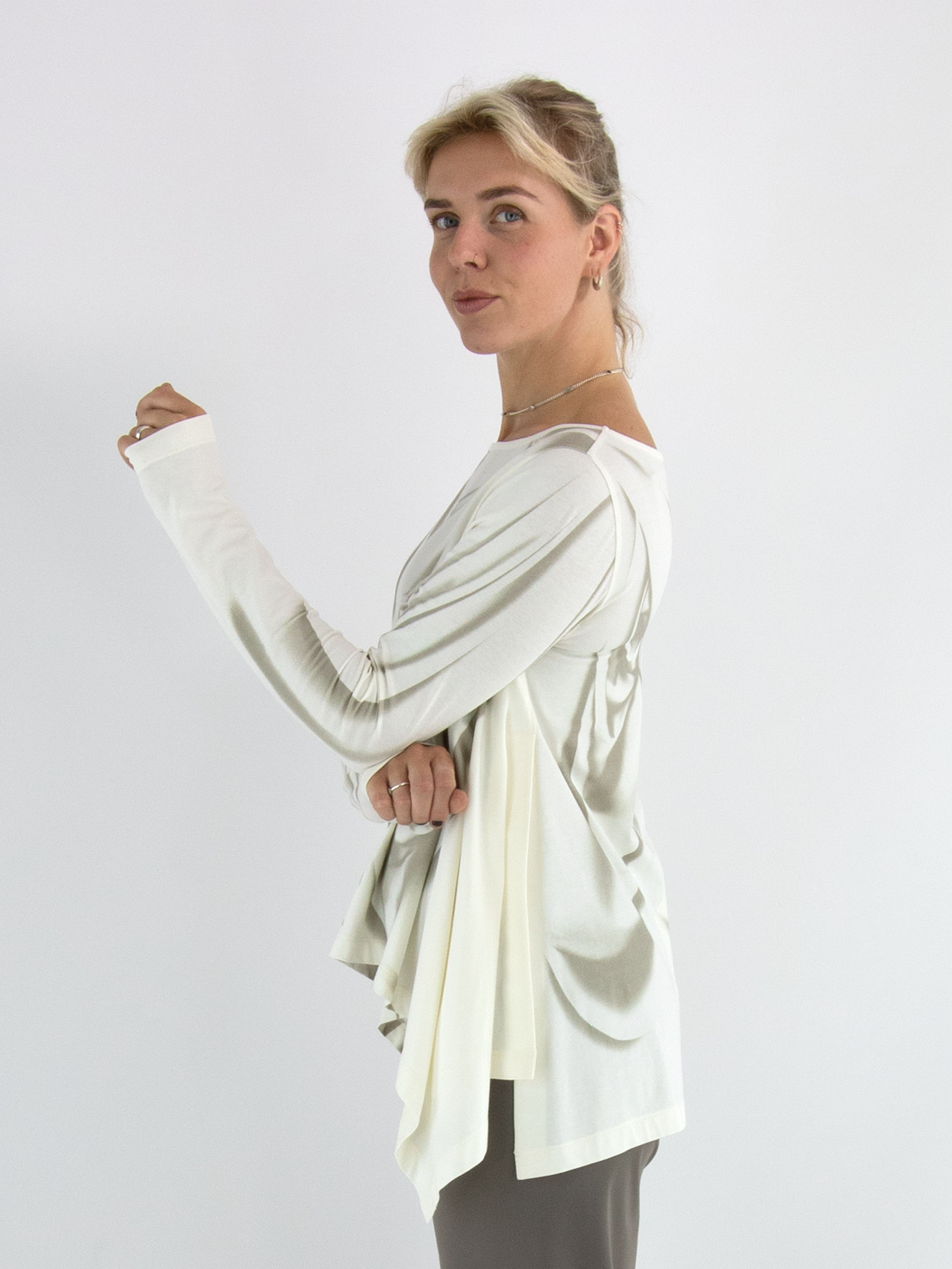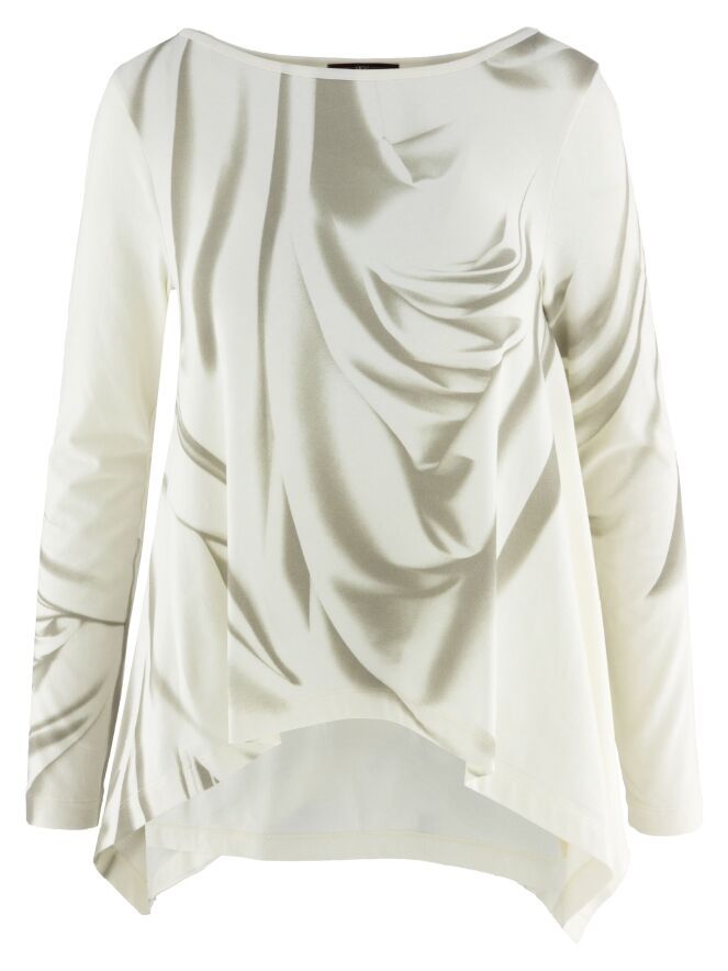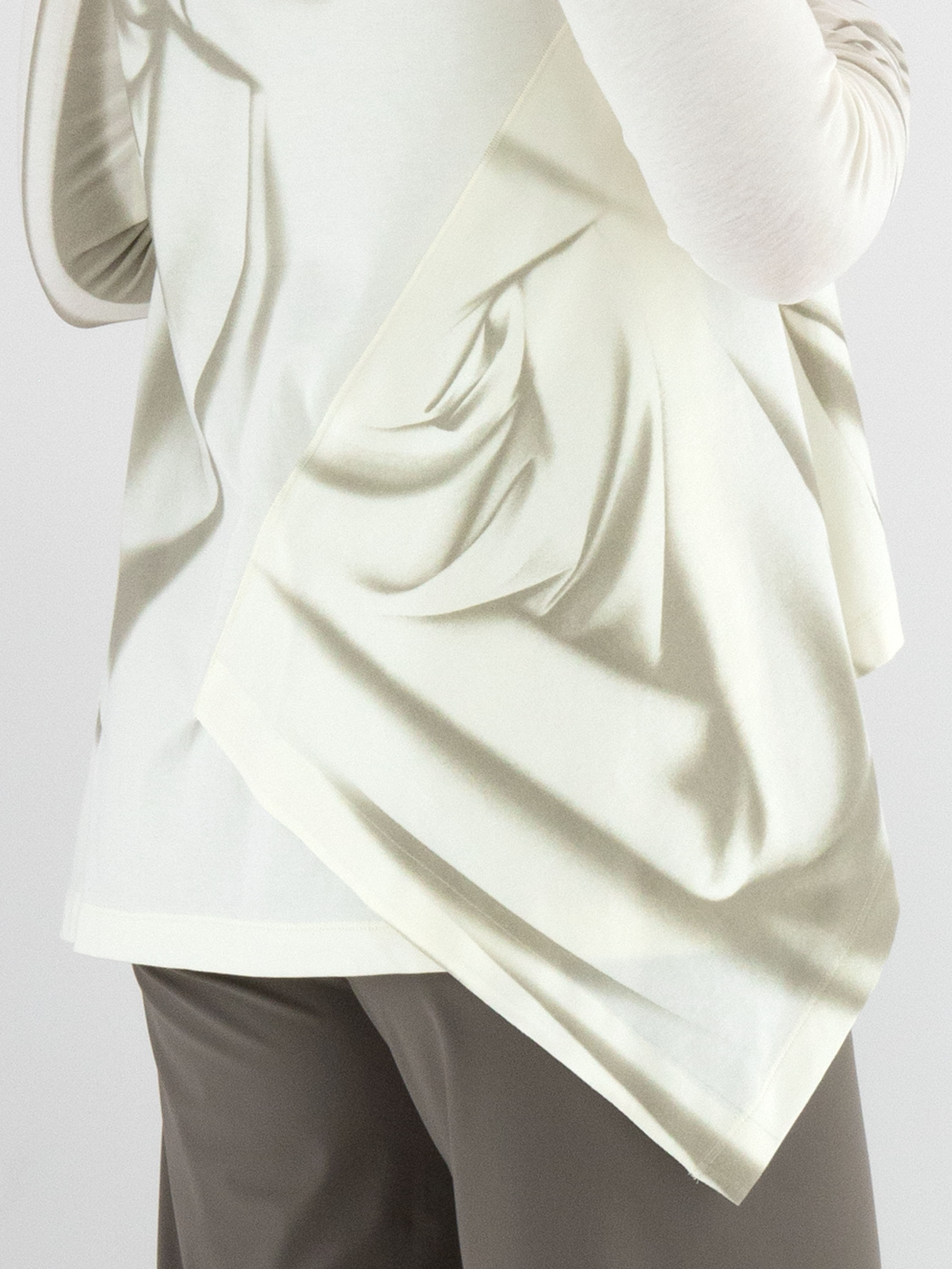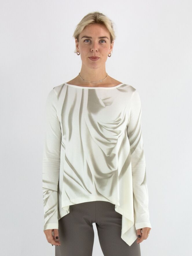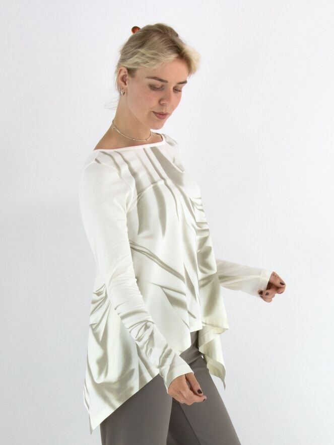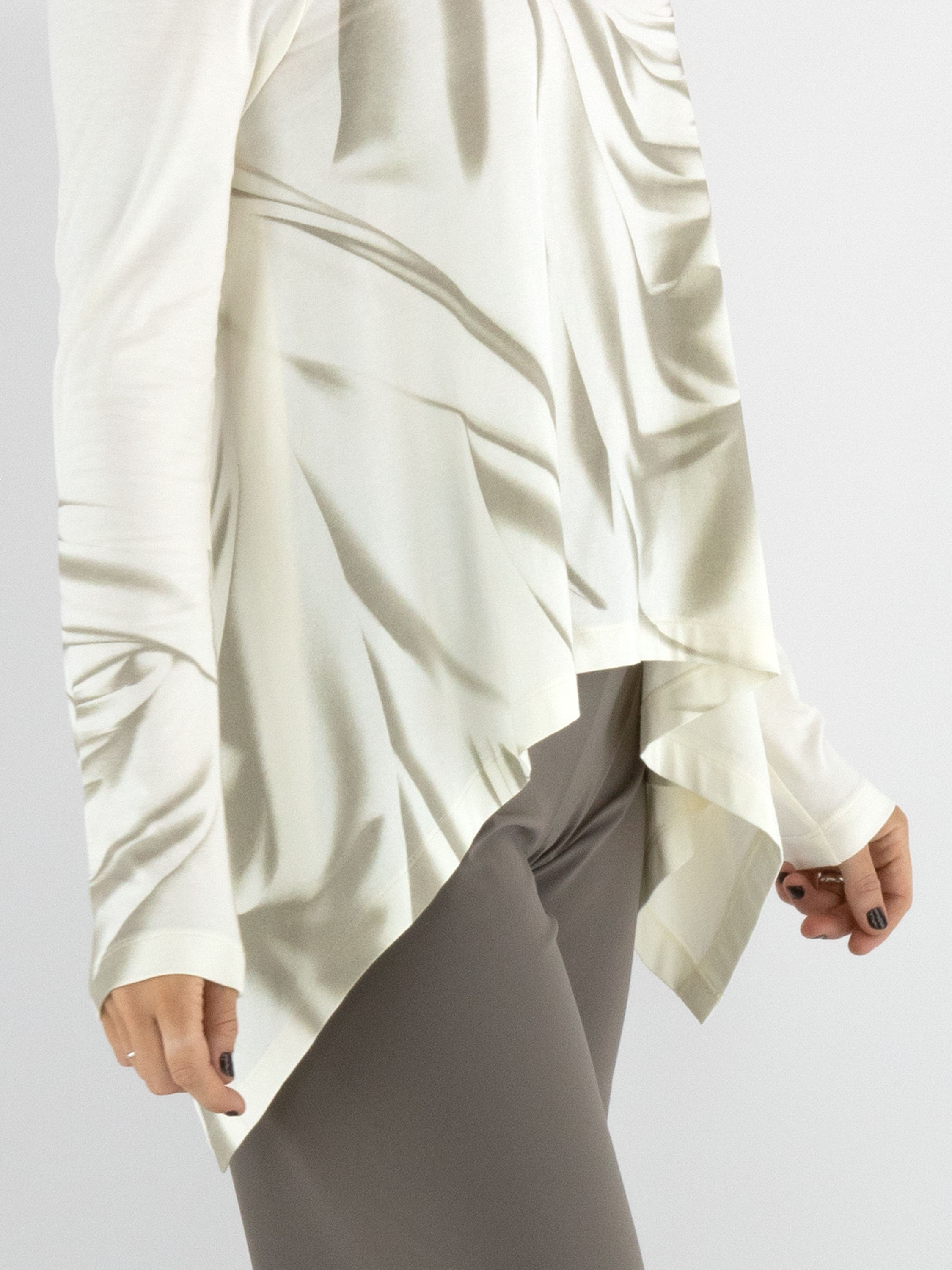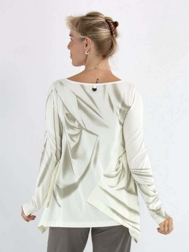 An A-line shirt by High with a marbled print in various shades of taupe on an off-white background. On the left side, there is a slit that reaches up to the armhole. This shirt should be hand-washed.