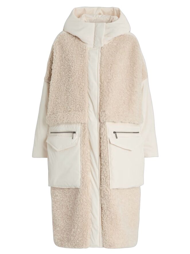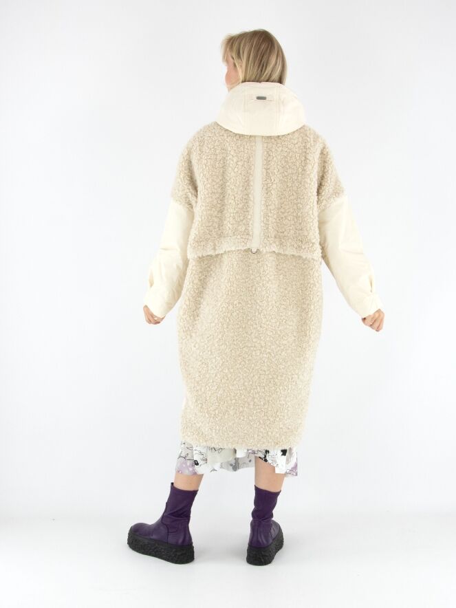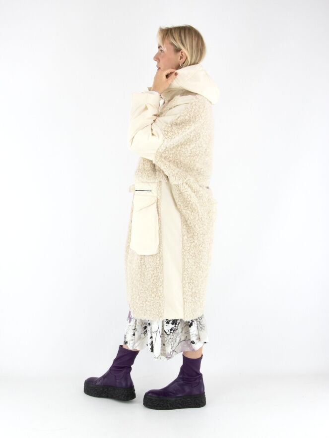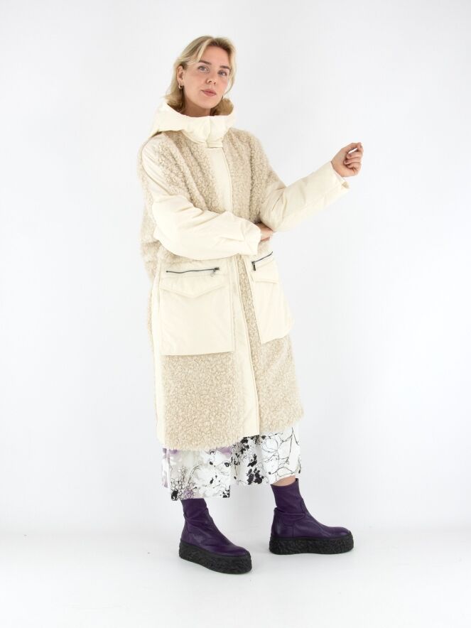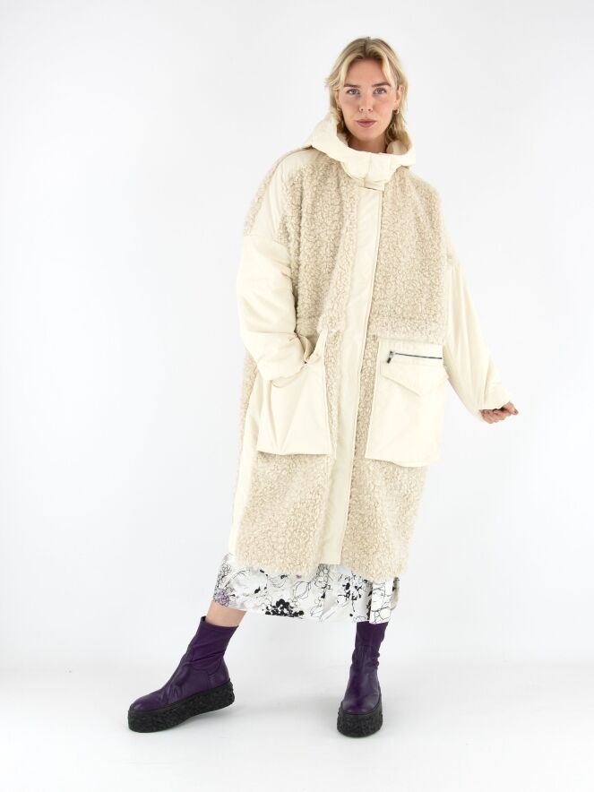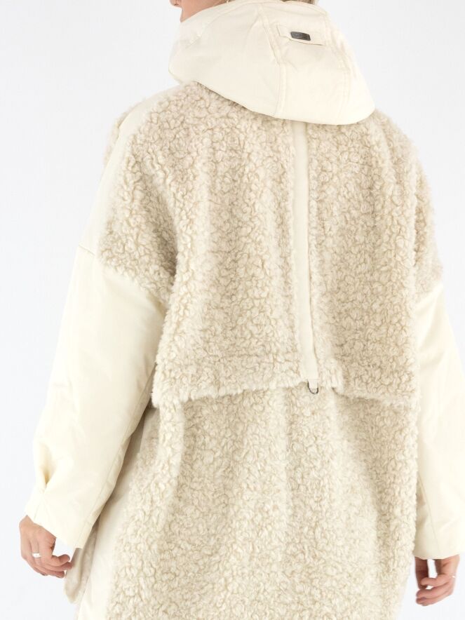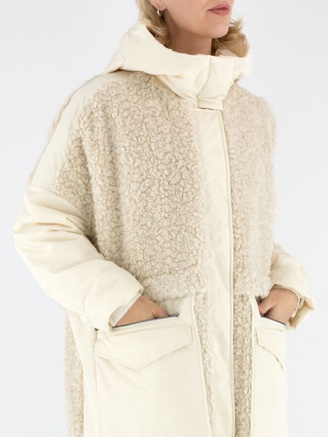A coat by High in cream white. The front is designed in faux curly fur down to the bust and continues in parachute fabric from there. The back is entirely made of faux curly fur. The large front pockets feature zip closures. The coat comes with a hood and must not be washed.