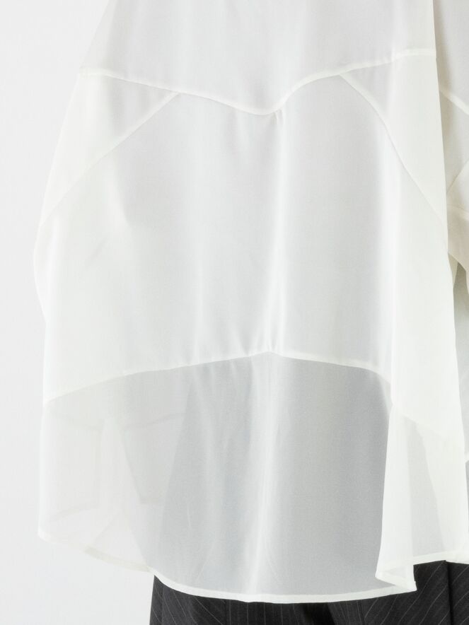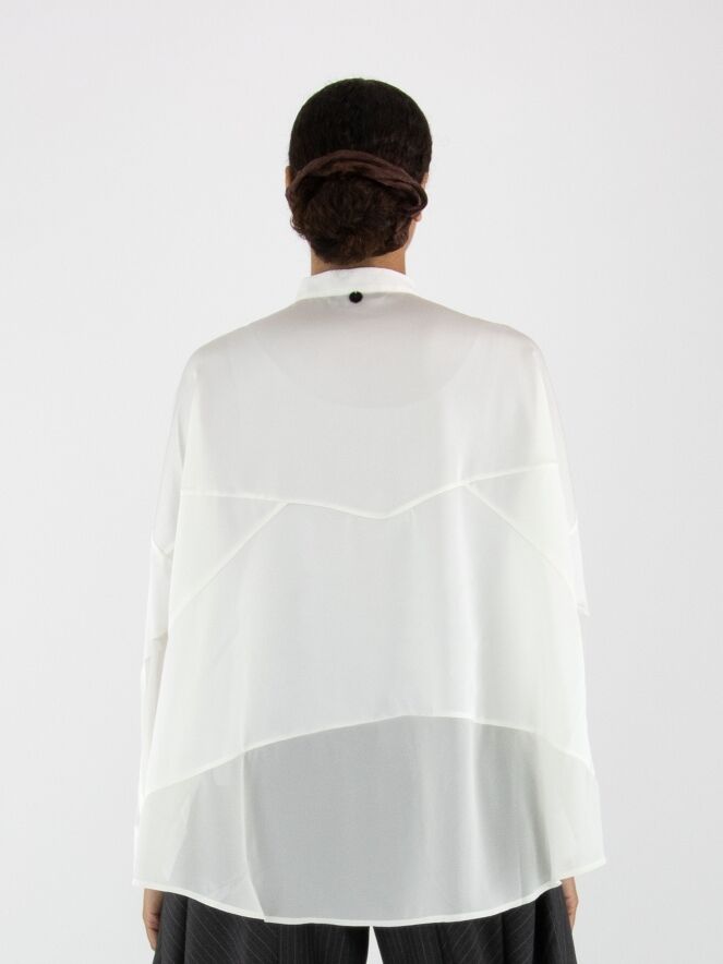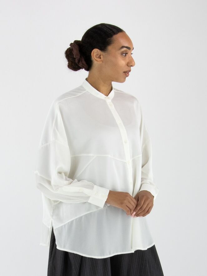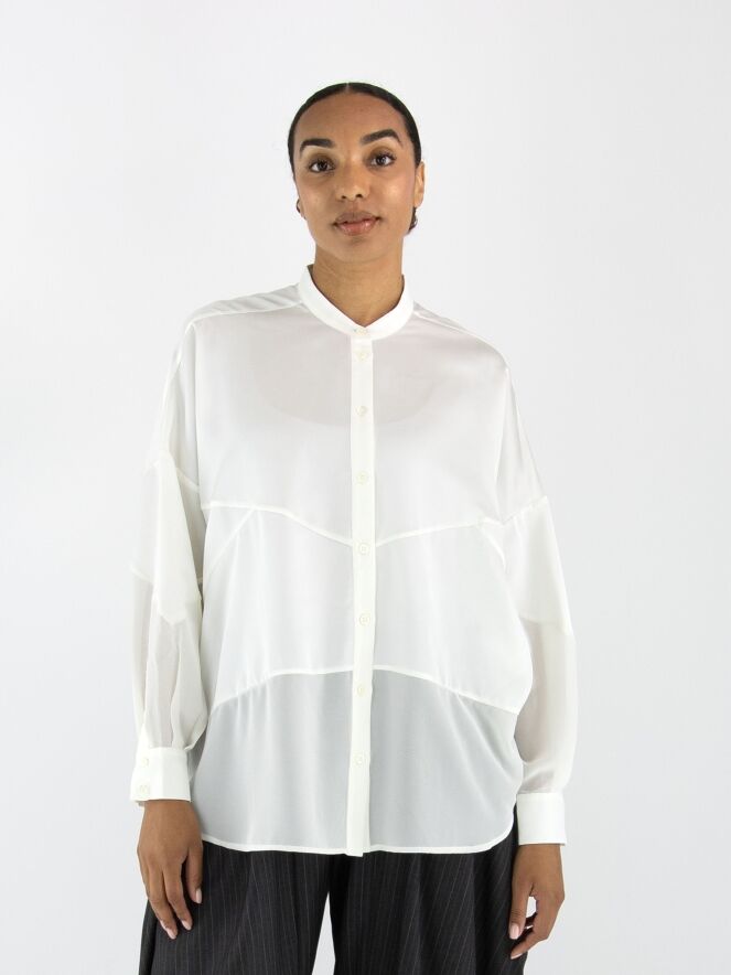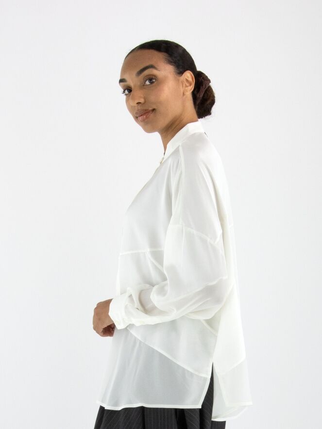 A blouse by High in off-white. The design combines matte satin fabric with slightly transparent matte sections. This blouse can be washed at 30 degrees.