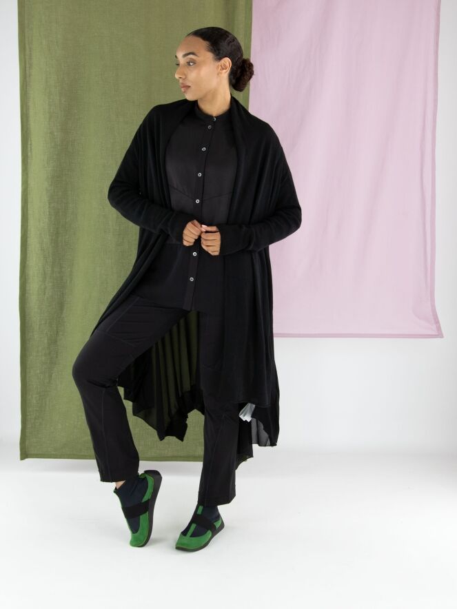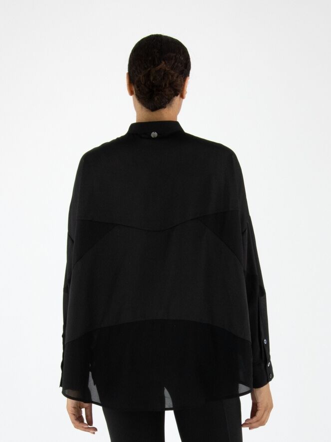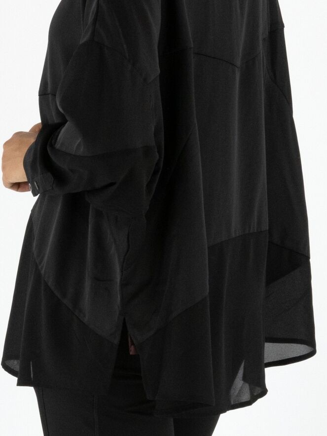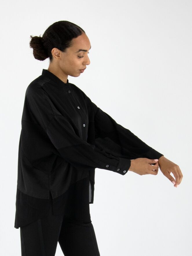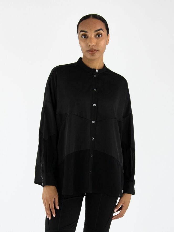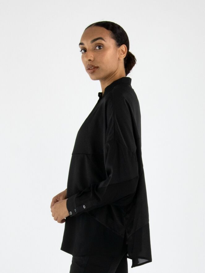 A blouse by High in black. The blouse features a combination of matte satin panels and slightly sheer matte fabric. This blouse can be washed at 30 degrees.