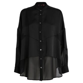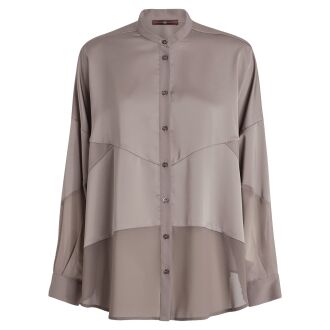 A blouse by High in grey. The blouse features a combination of matte satin fabric and slightly sheer matte fabric. This blouse can be washed at 30 degrees.