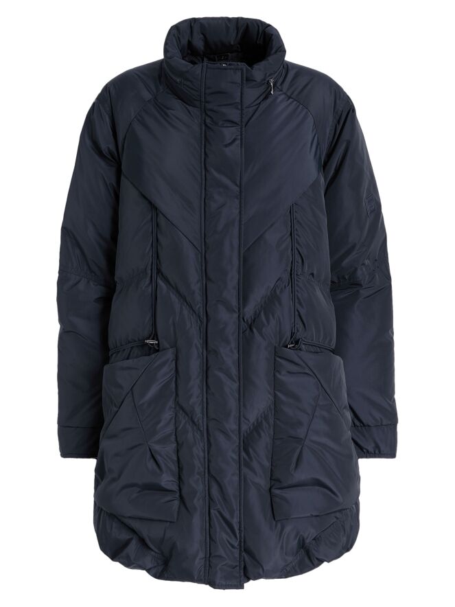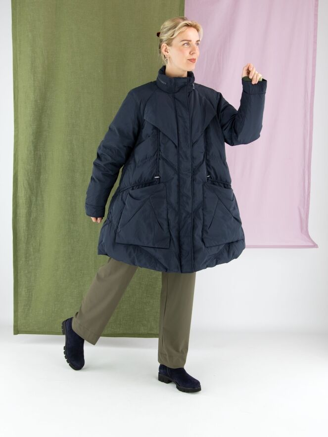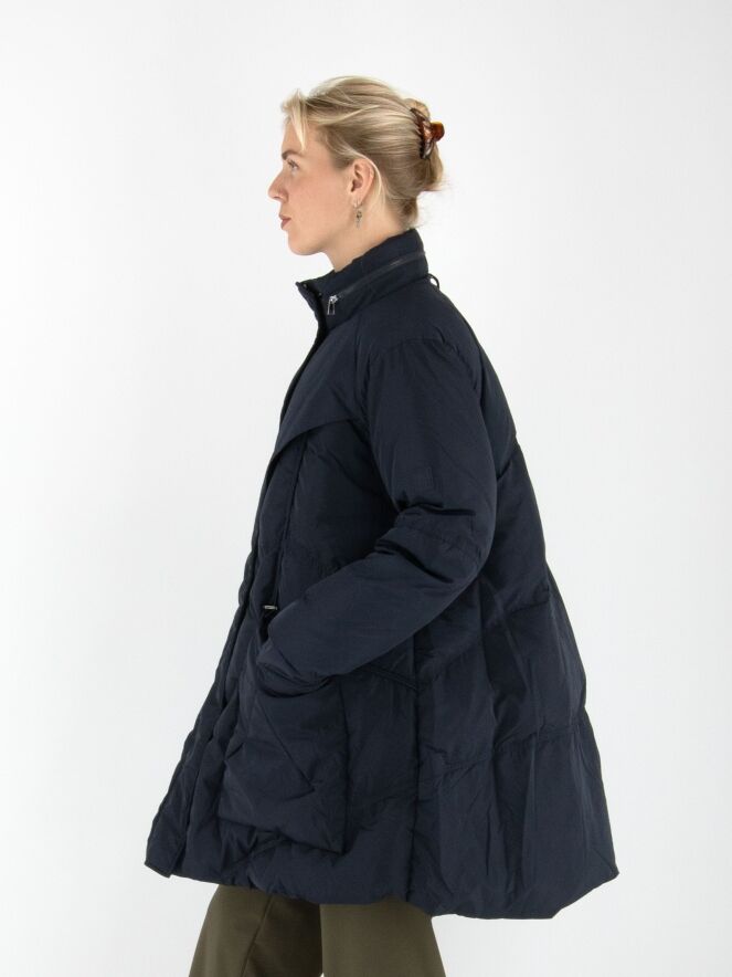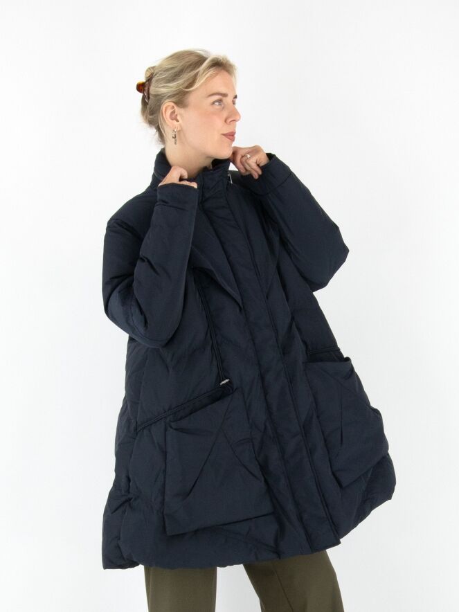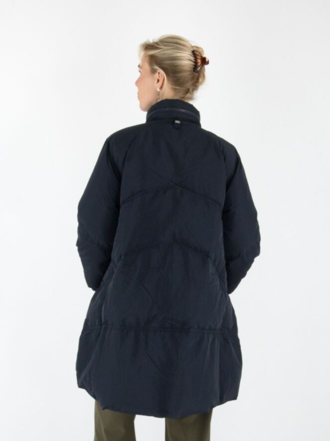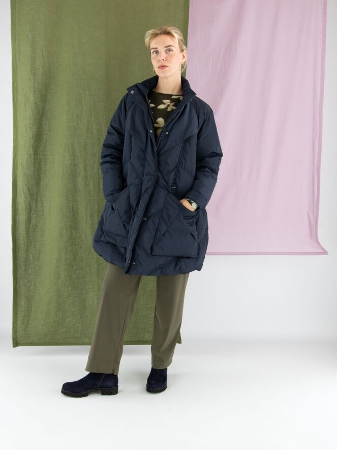 A mid-length coat by High in a deep navy blue. The collar features a zipper that conceals a hidden hood. Over the front zipper, a second closure with press buttons provides extra detail. The coat is designed with spacious pockets and multiple diagonal stitching lines. This coat can be washed at 30 degrees.