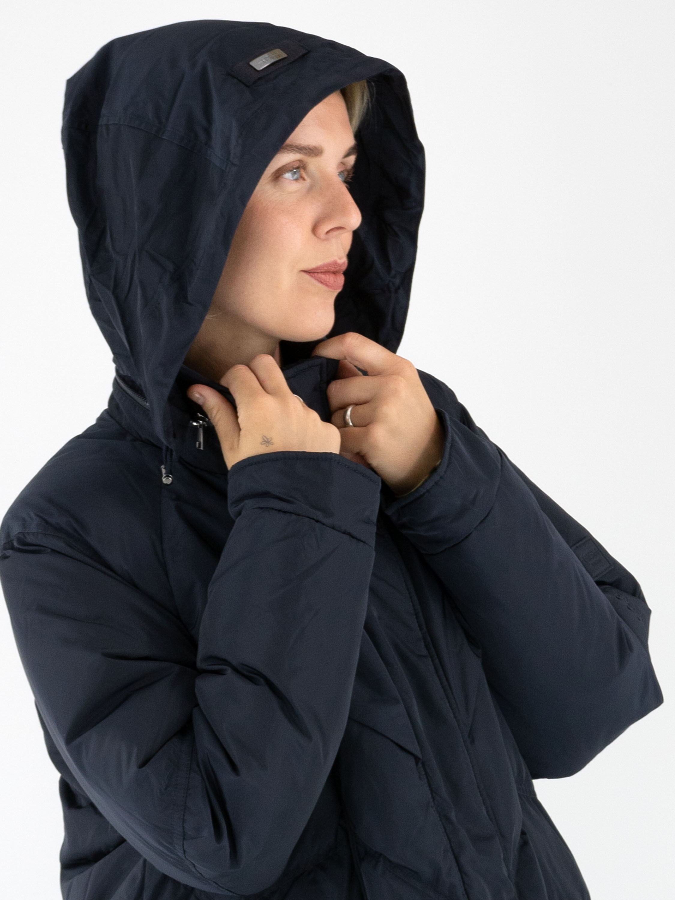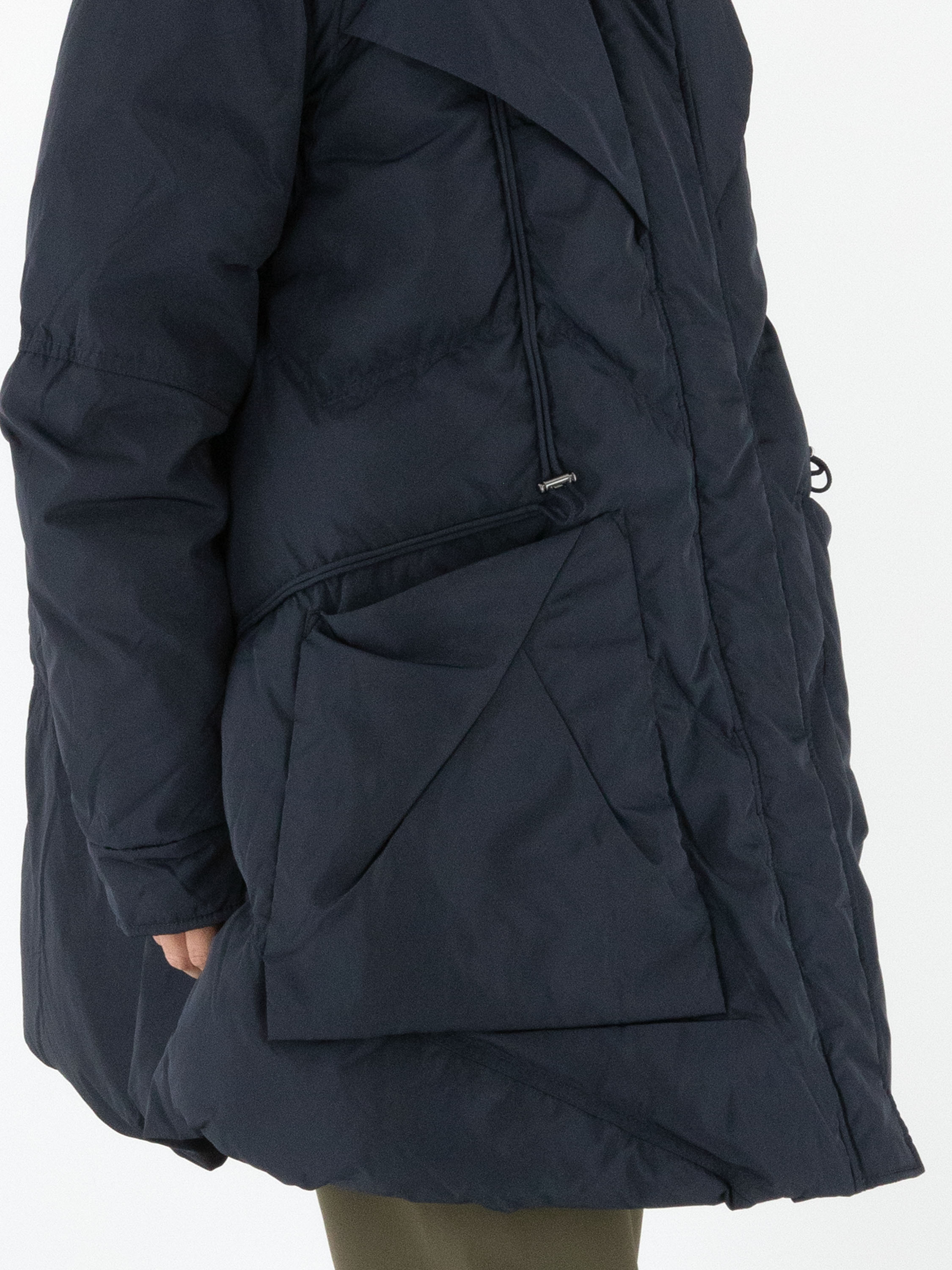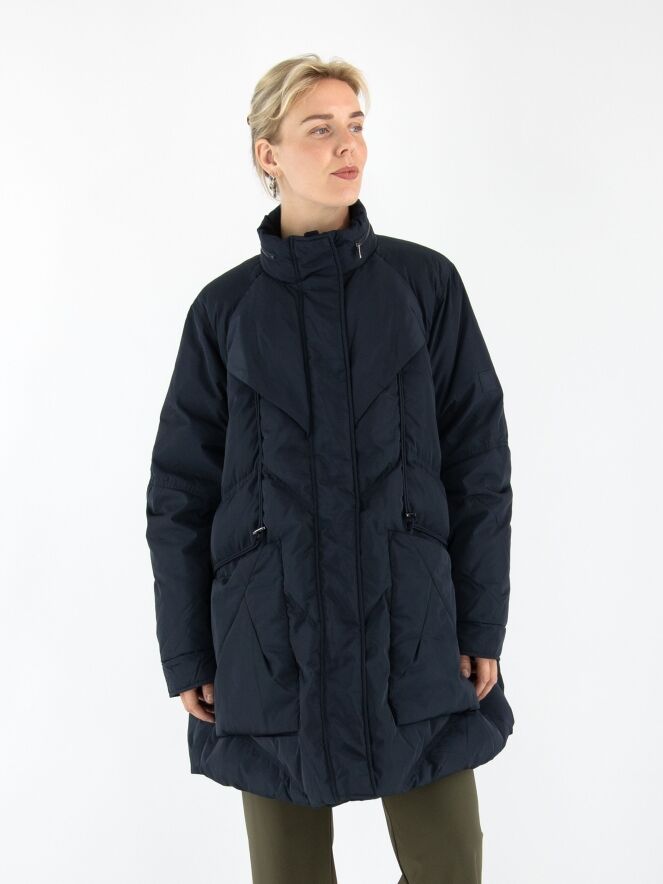A mid-length coat by High in a deep navy blue. The collar features a zipper that conceals a hidden hood. Over the front zipper, a second closure with press buttons provides extra detail. The coat is designed with spacious pockets and multiple diagonal stitching lines. This coat can be washed at 30 degrees.