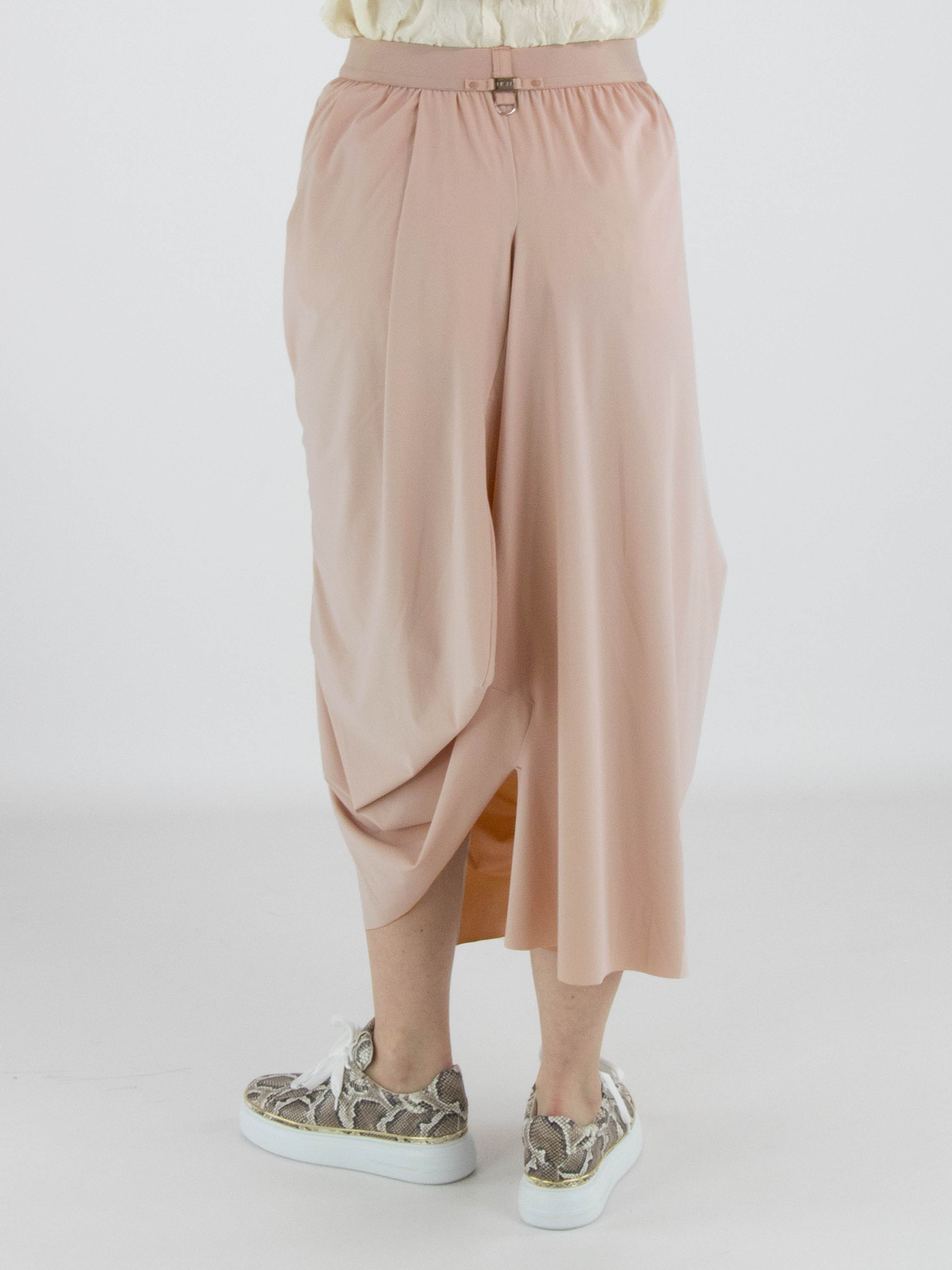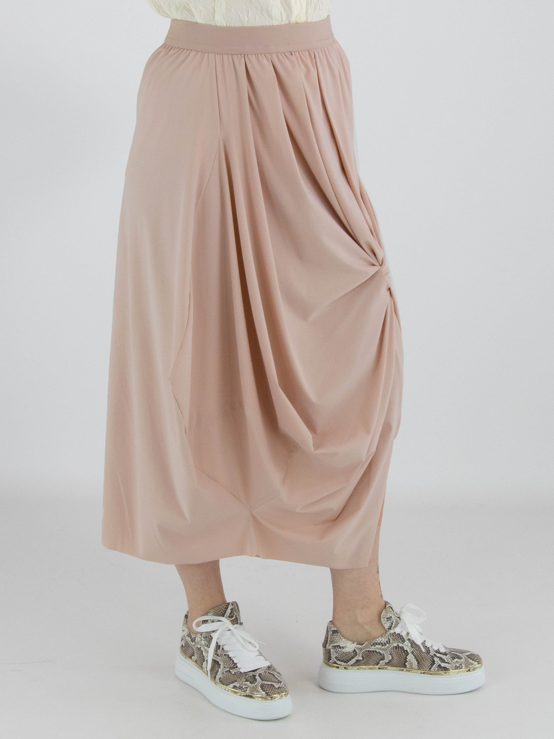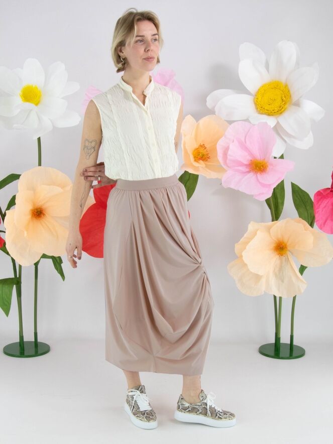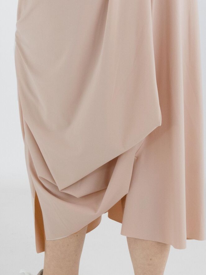 A skirt from High Tech in a nude or pastel pink colour. The waist features an elastic band. From the waistband on the right side, several pleats create a draped effect towards the bottom. At knee level on the left side, a draw-up detail creates a pleated effect. This skirt can be washed at 30 degrees.