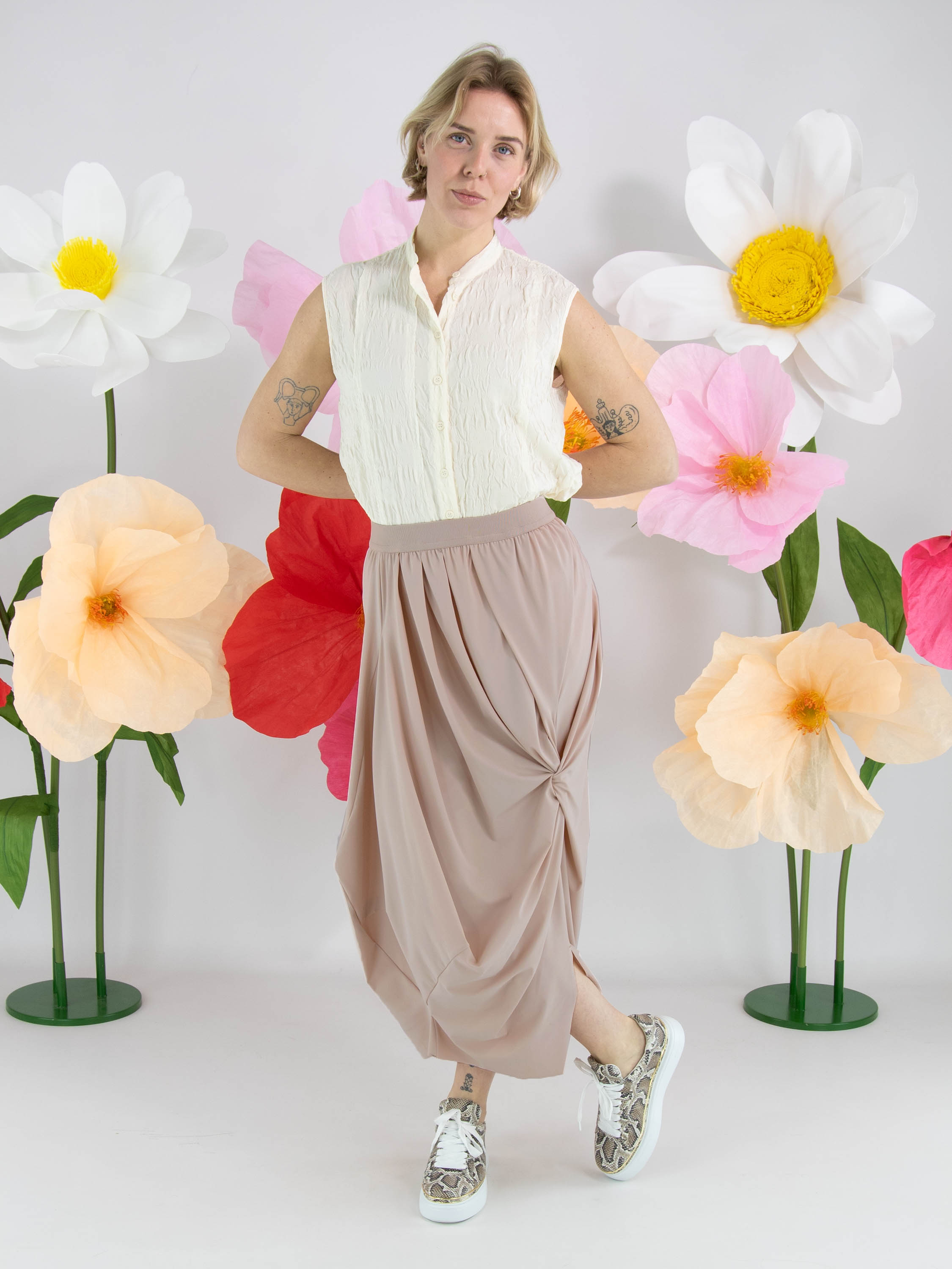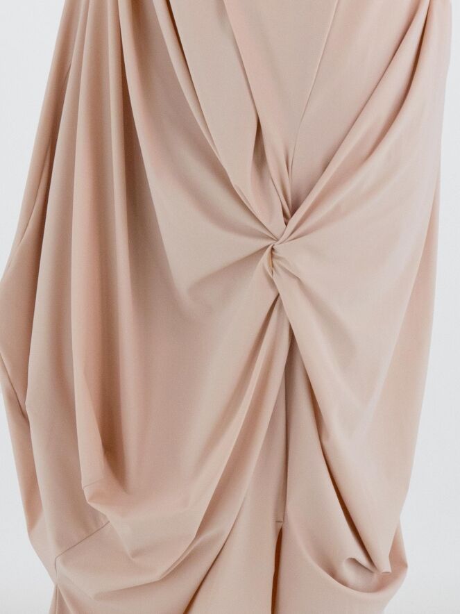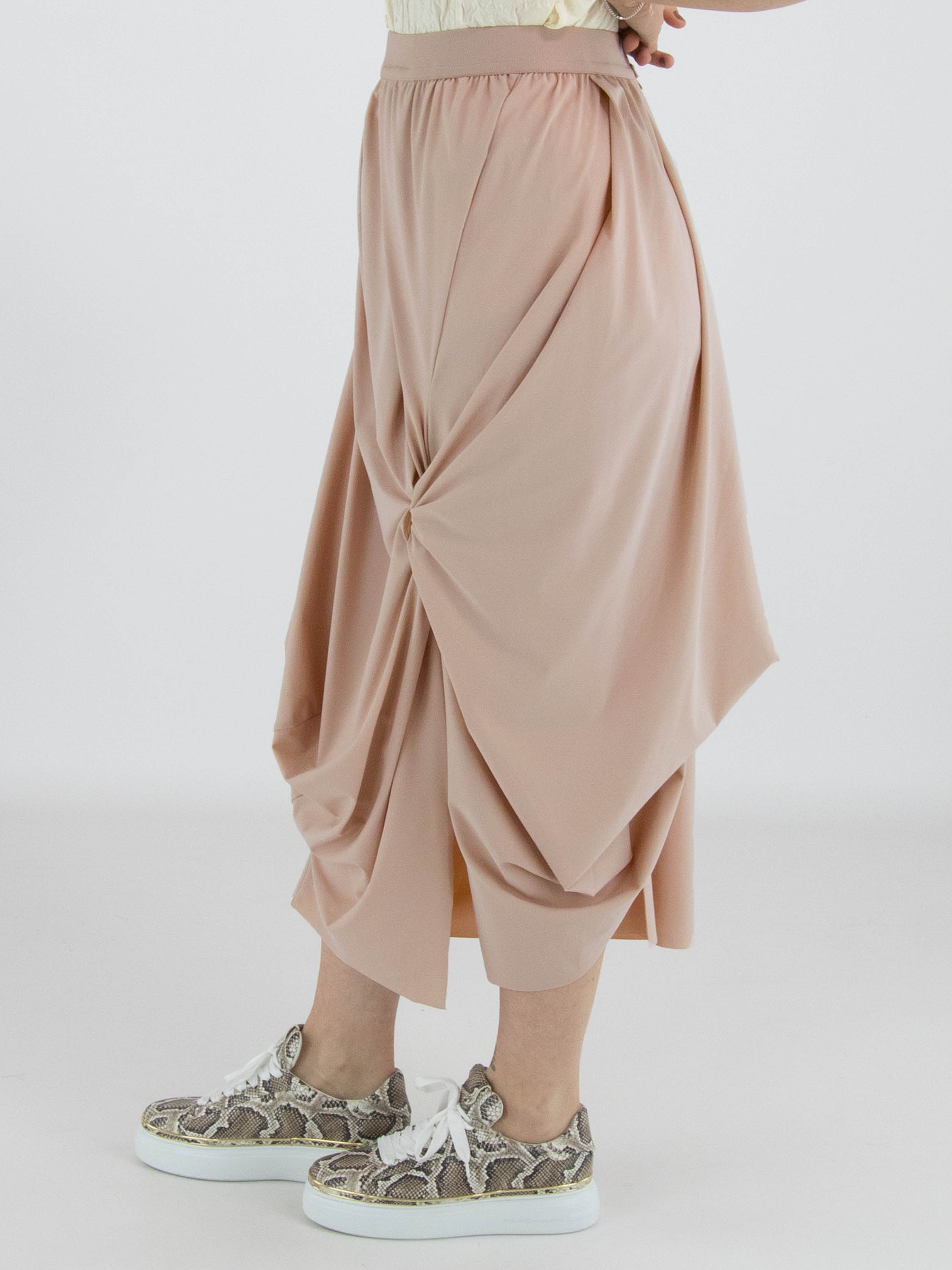 A skirt from High Tech in a nude or pastel pink colour. The waist features an elastic band. From the waistband on the right side, several pleats create a draped effect towards the bottom. At knee level on the left side, a draw-up detail creates a pleated effect. This skirt can be washed at 30 degrees.