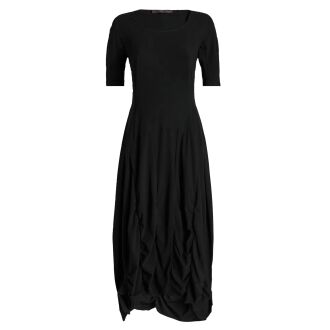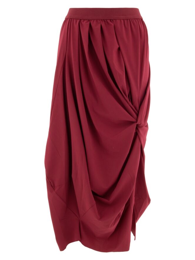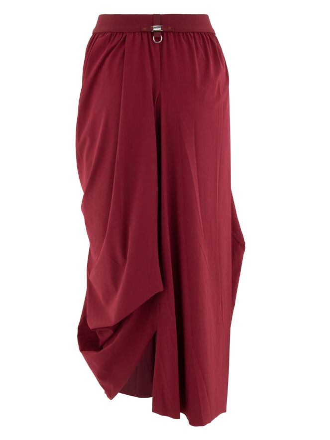 A skirt from High Tech in a raspberry red colour. The waist features an elastic band. From the waistband on the right side, several pleats fall downward, creating a draped effect. At knee level on the left side, a draw-up detail creates a pleated effect. This skirt can be washed at 30 degrees.