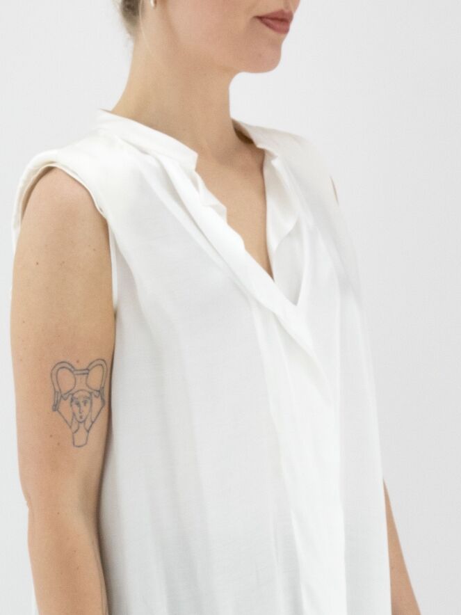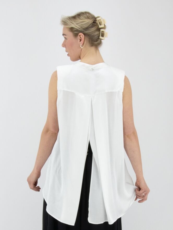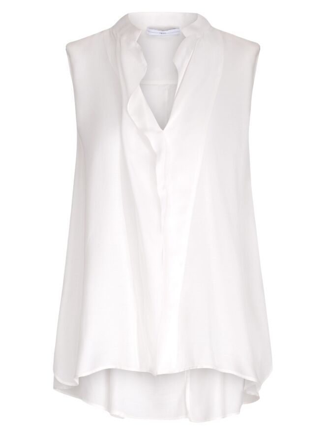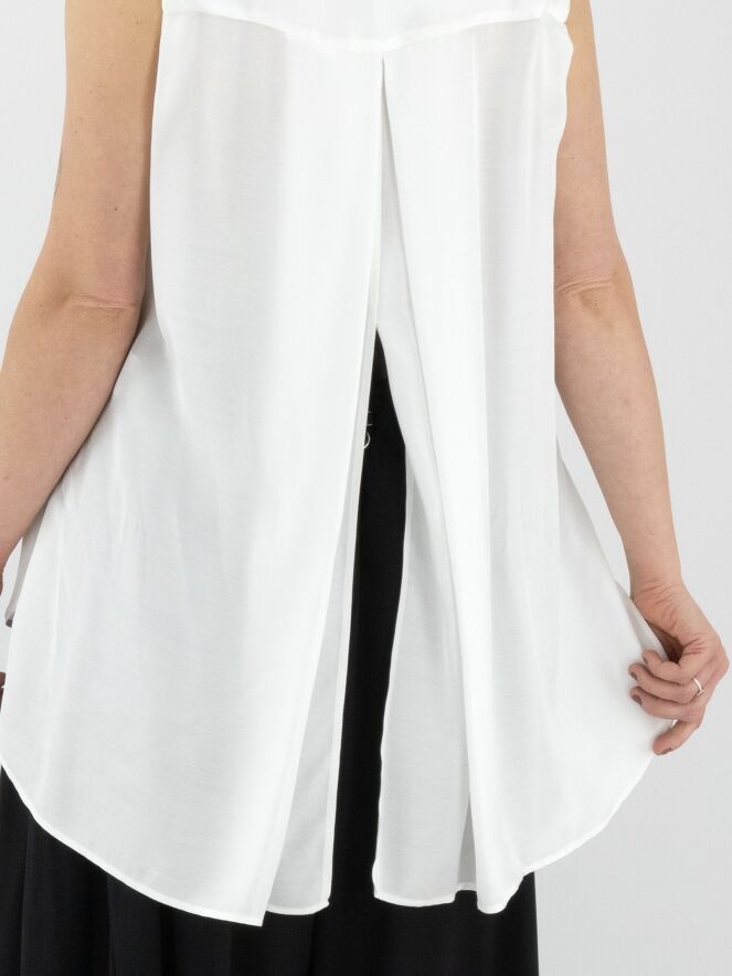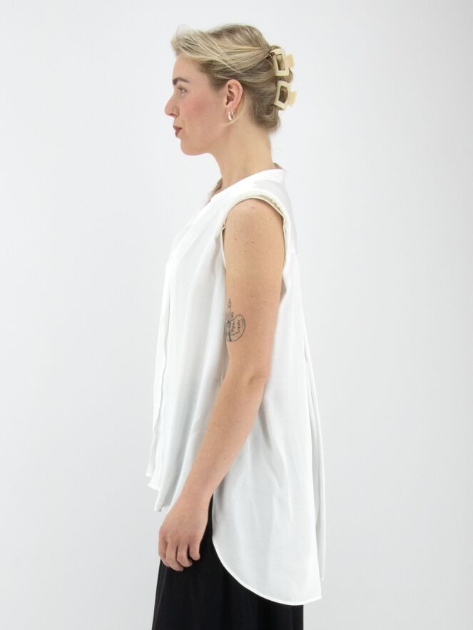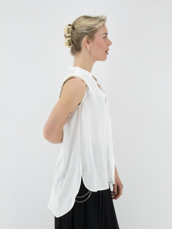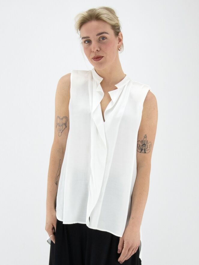 A long, matte satin top from High in ivory. A cascading ruffle extends downward from the point of the V-neckline. At the back, a pleat is incorporated from the center of the seam between the shoulder blades. The shoulders are structured with padding. This top must not be washed.