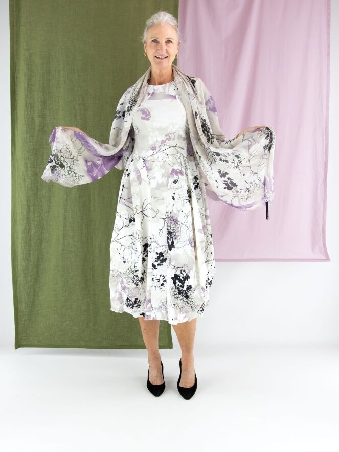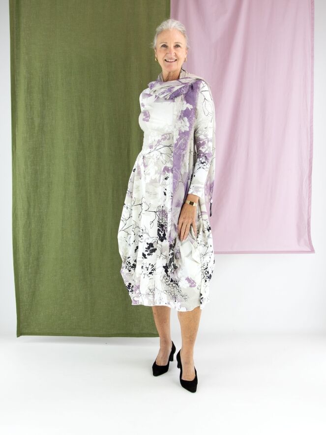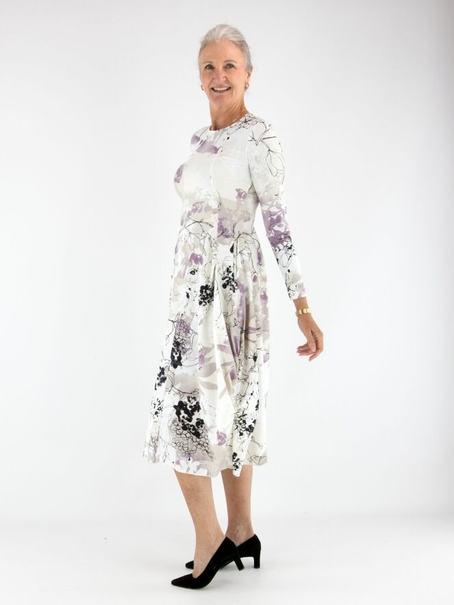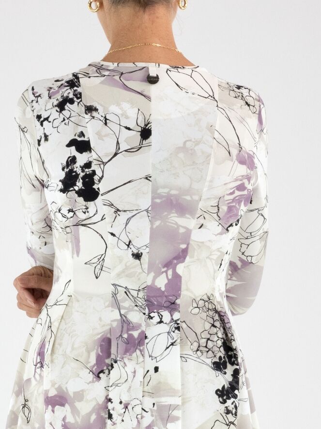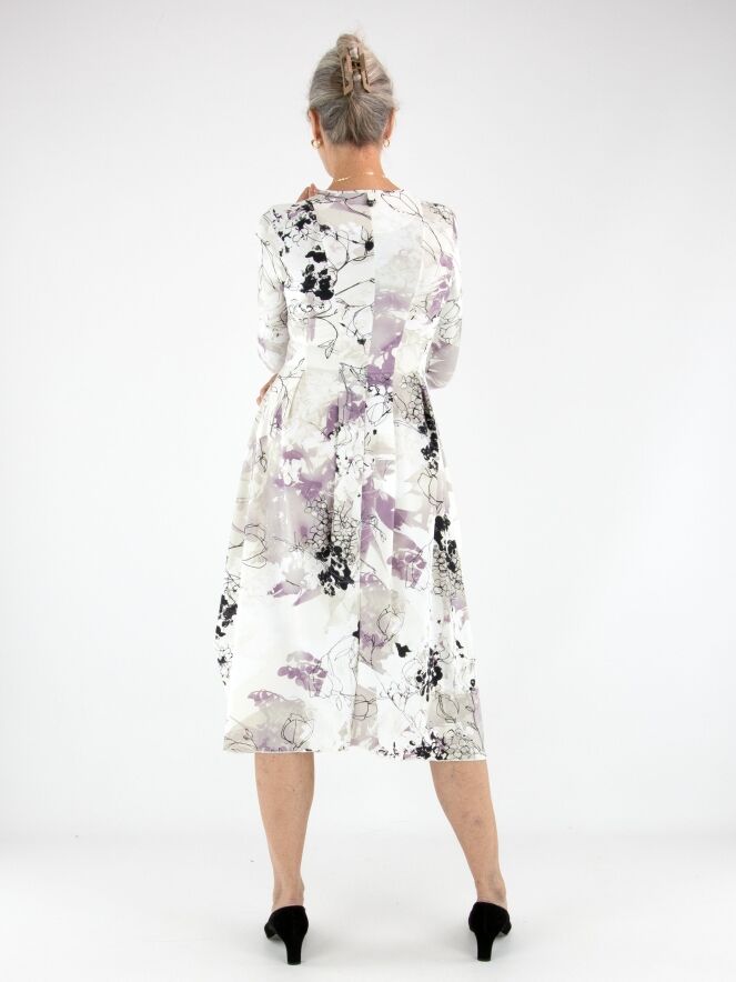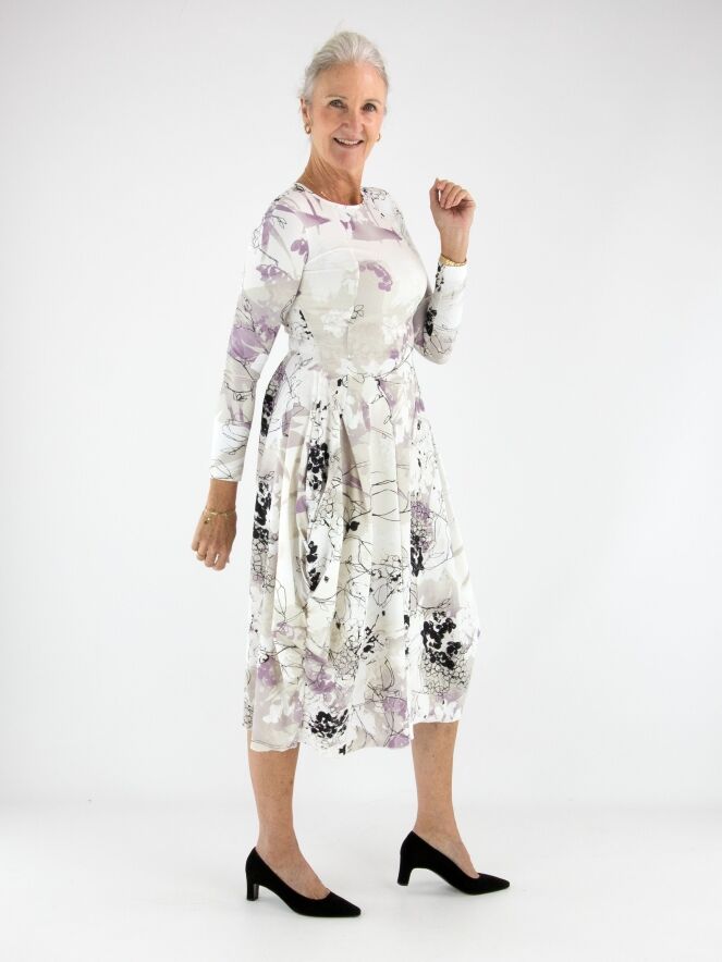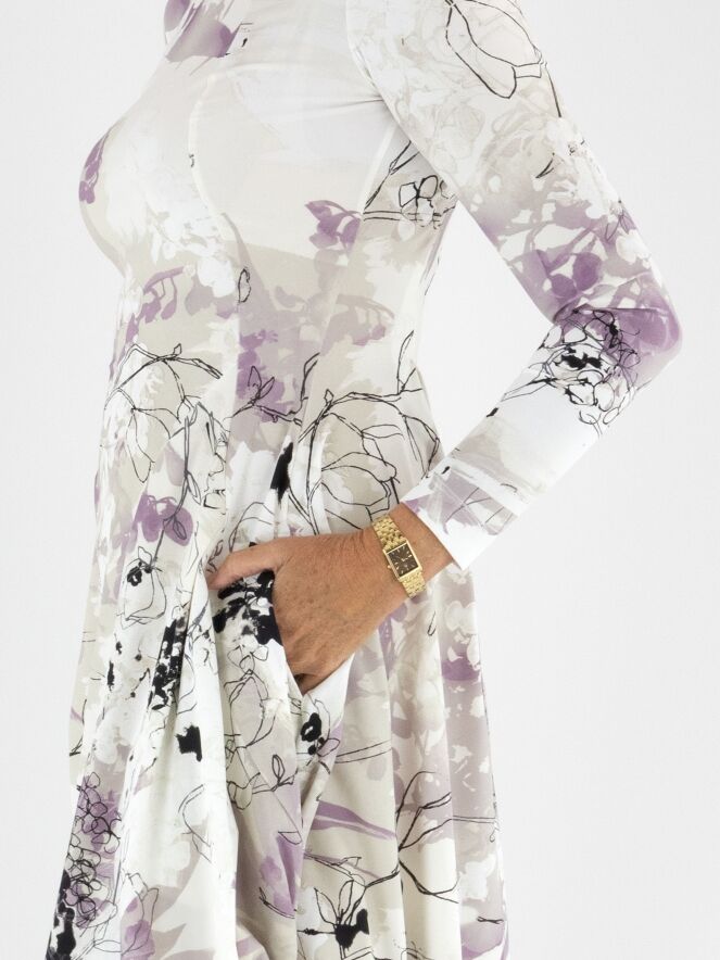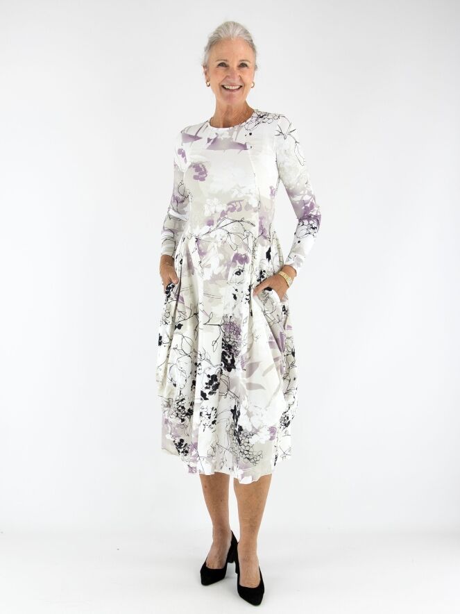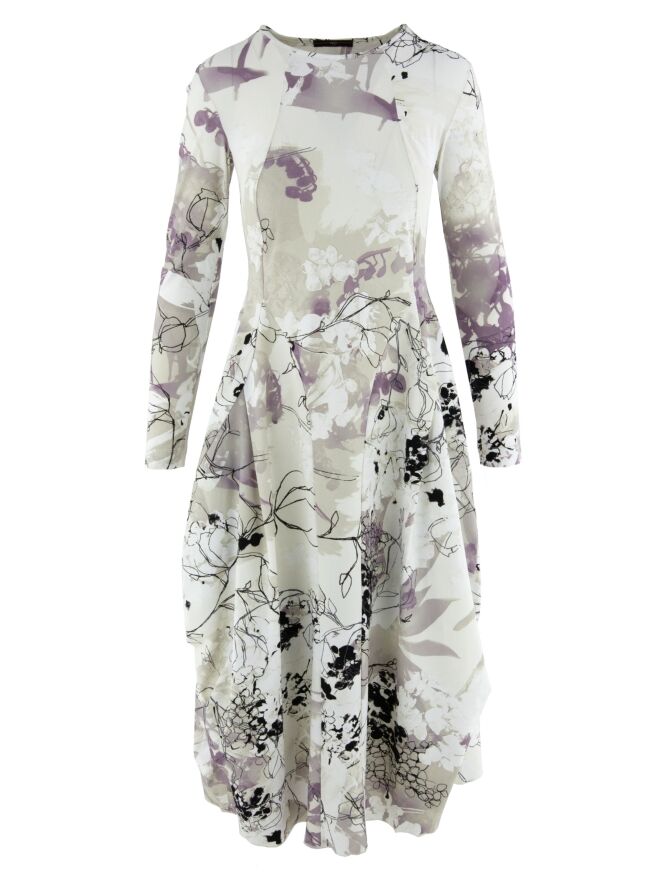 Dress by High featuring a graphic floral print in shades of lilac, beige, and black on an off-white background. Designed with a round neckline and long sleeves, this piece includes discreet side pockets at the waist. From the waist down, a subtle balloon effect creates a contemporary and feminine silhouette. This exclusive designer dress can be washed at 30 degrees.