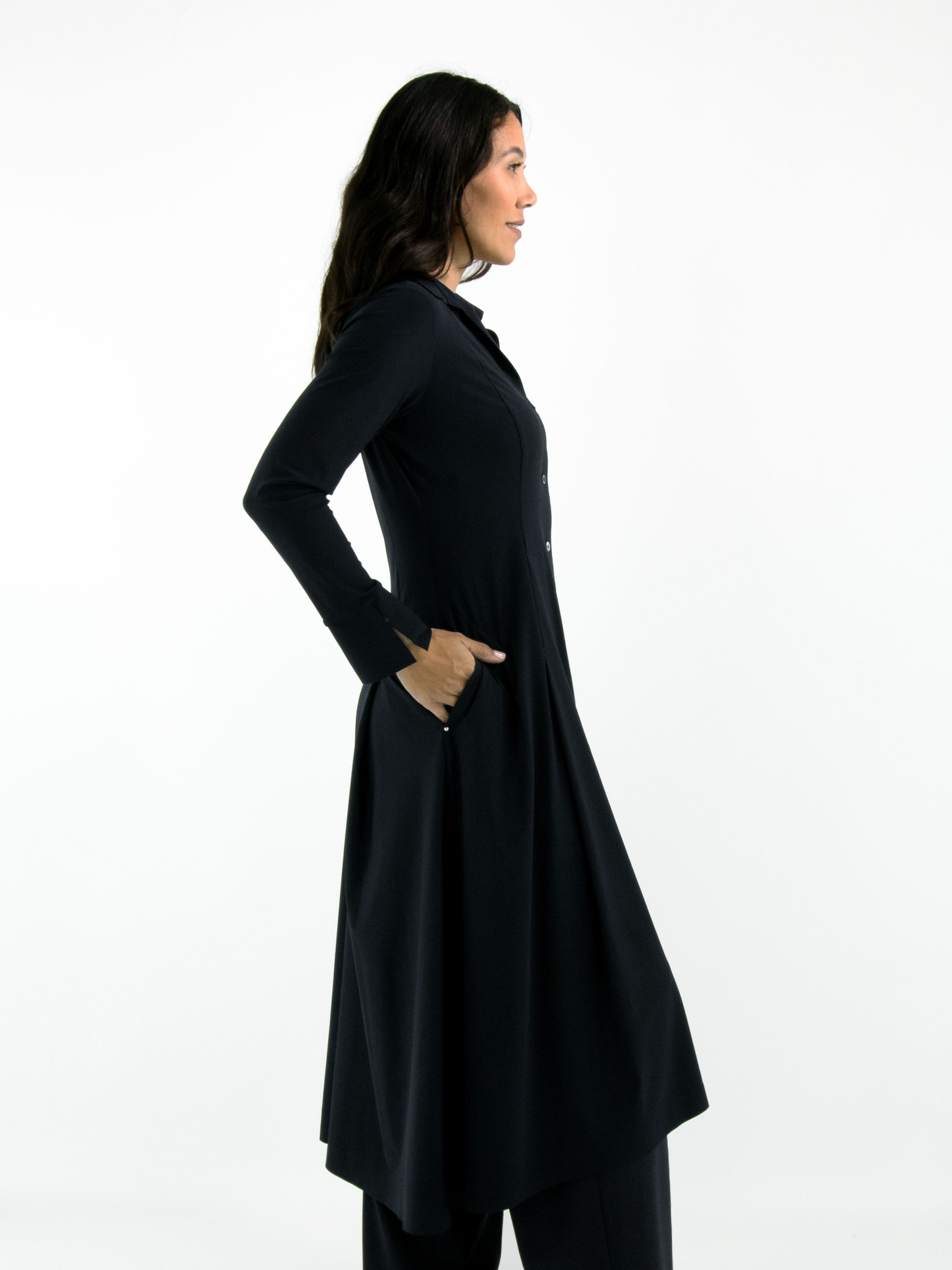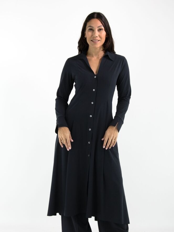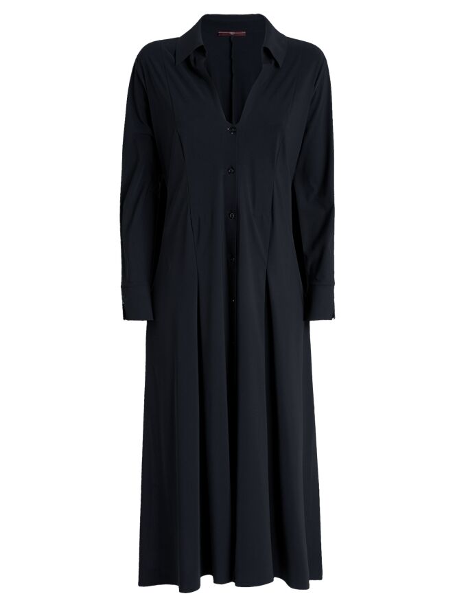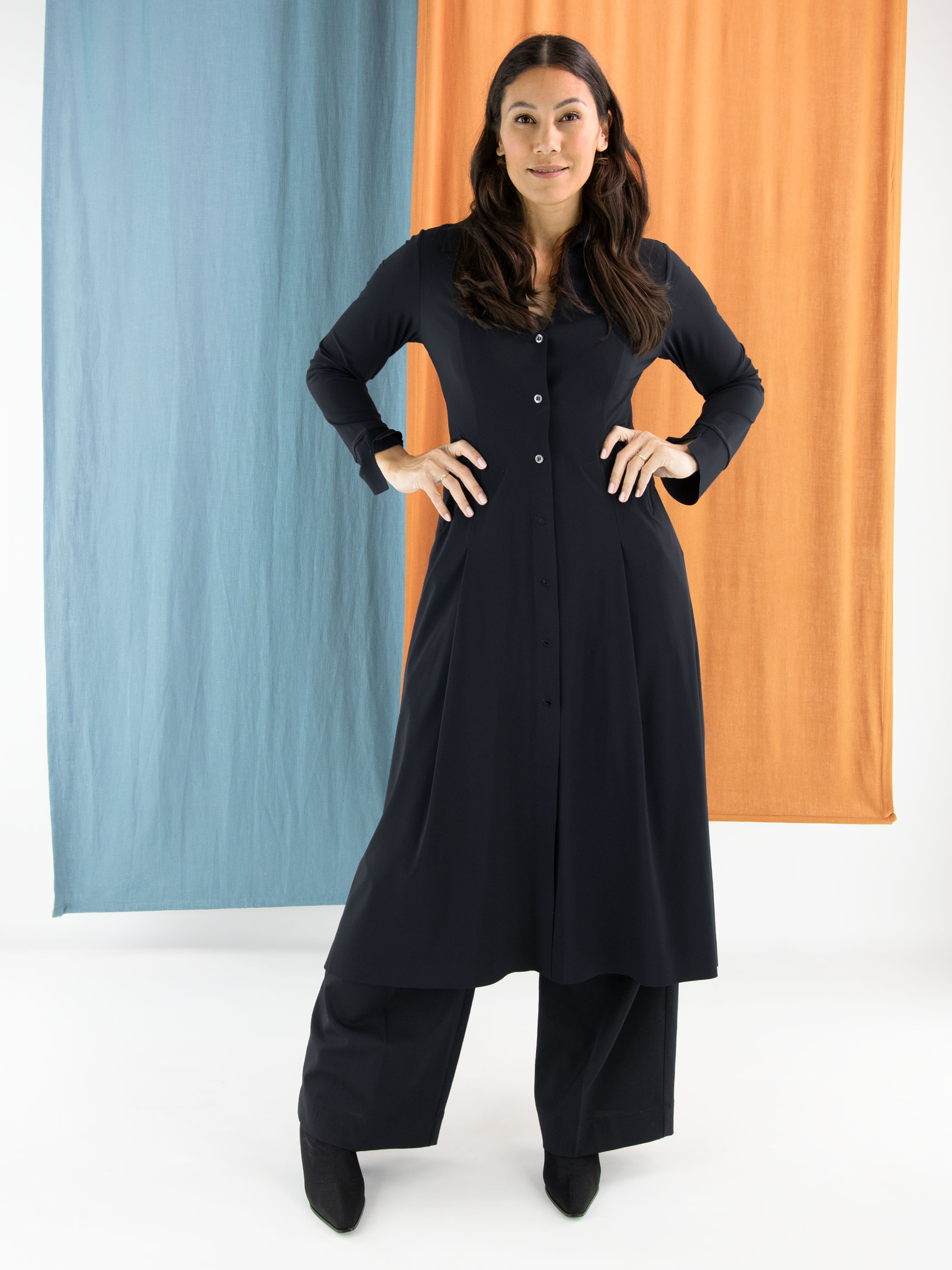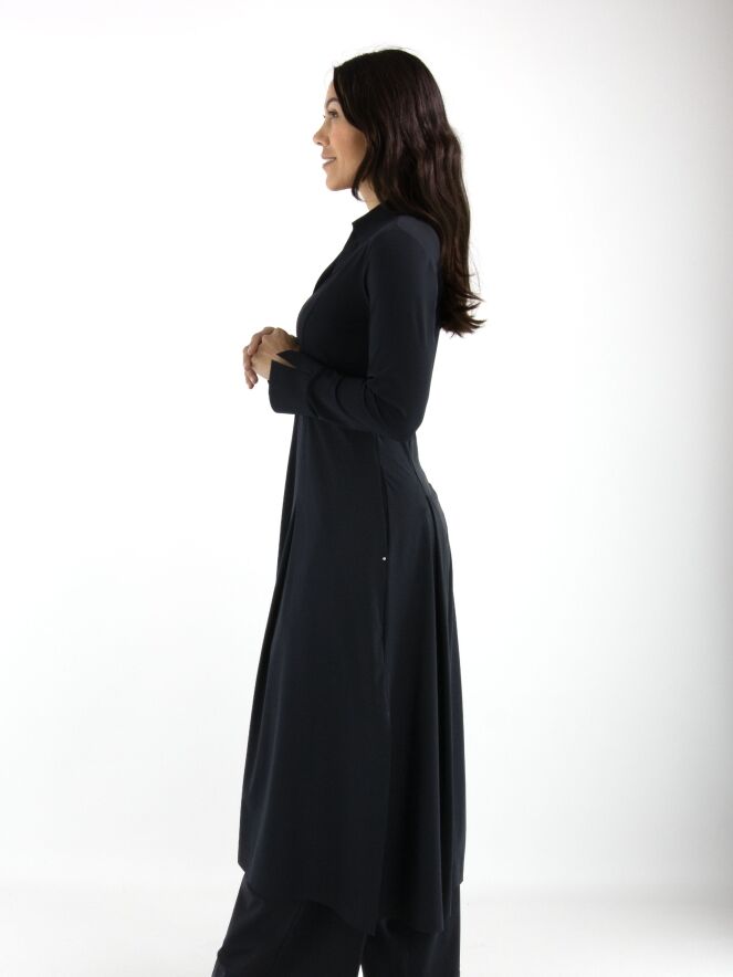 A button-through dress by High in navy blue. The dress flares out from the waist and features side pockets at the waistline. The cuffs at the ends of the long sleeves are finished with a small slit. This dress should be hand-washed.