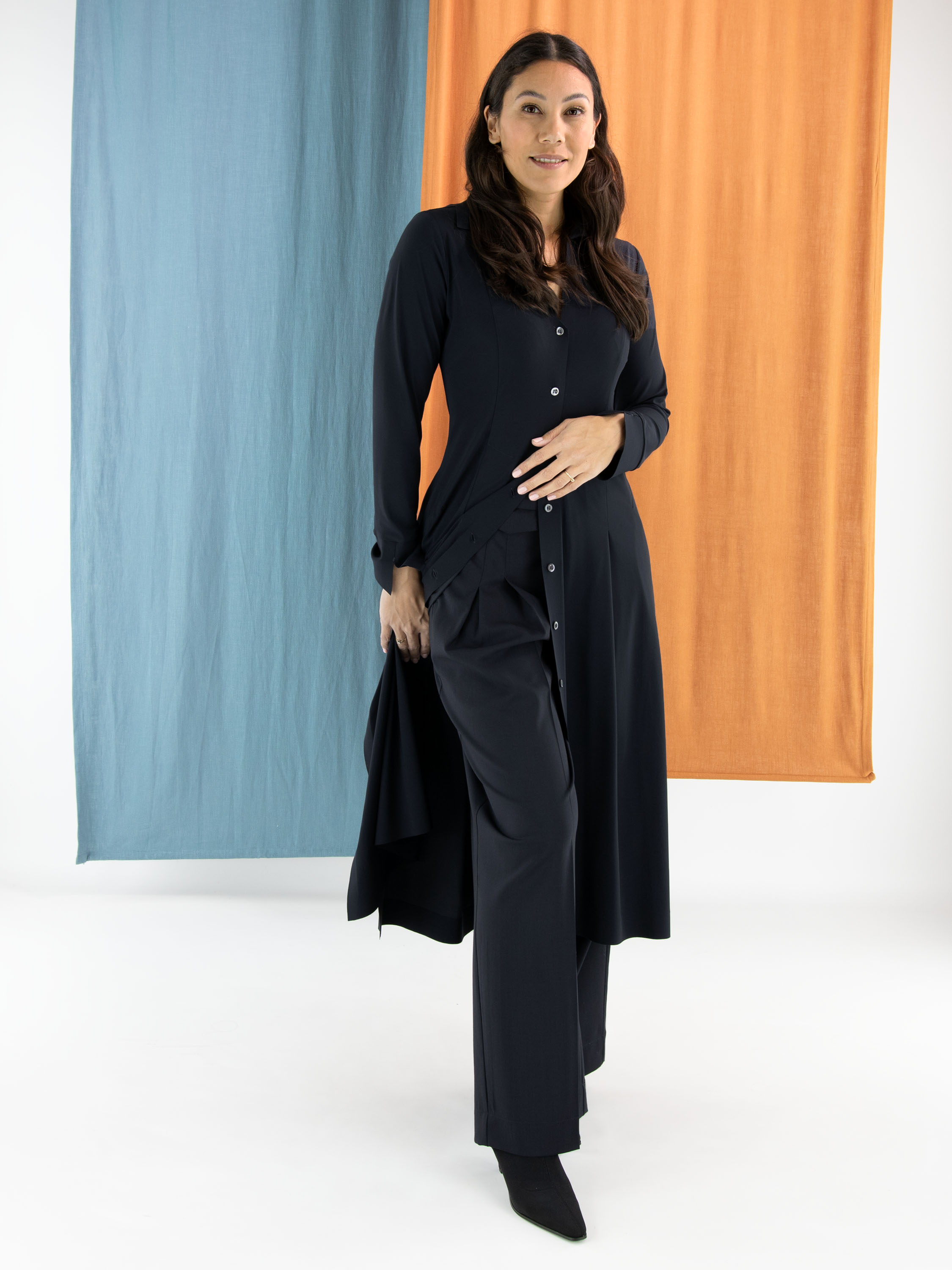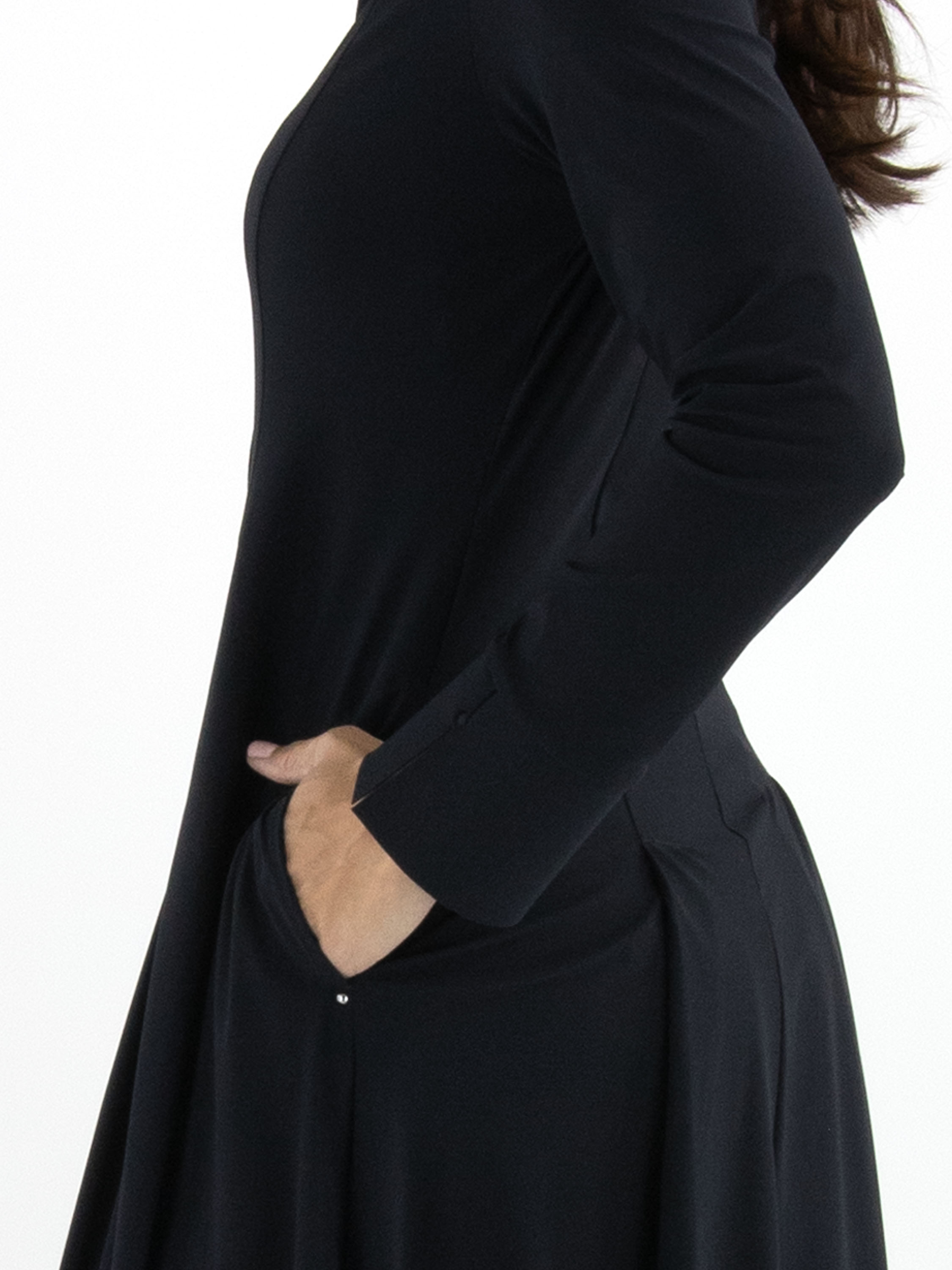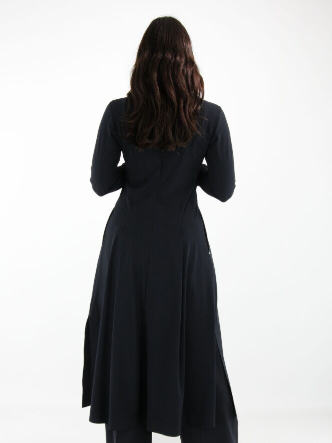 A button-through dress by High in navy blue. The dress flares out from the waist and features side pockets at the waistline. The cuffs at the ends of the long sleeves are finished with a small slit. This dress should be hand-washed.