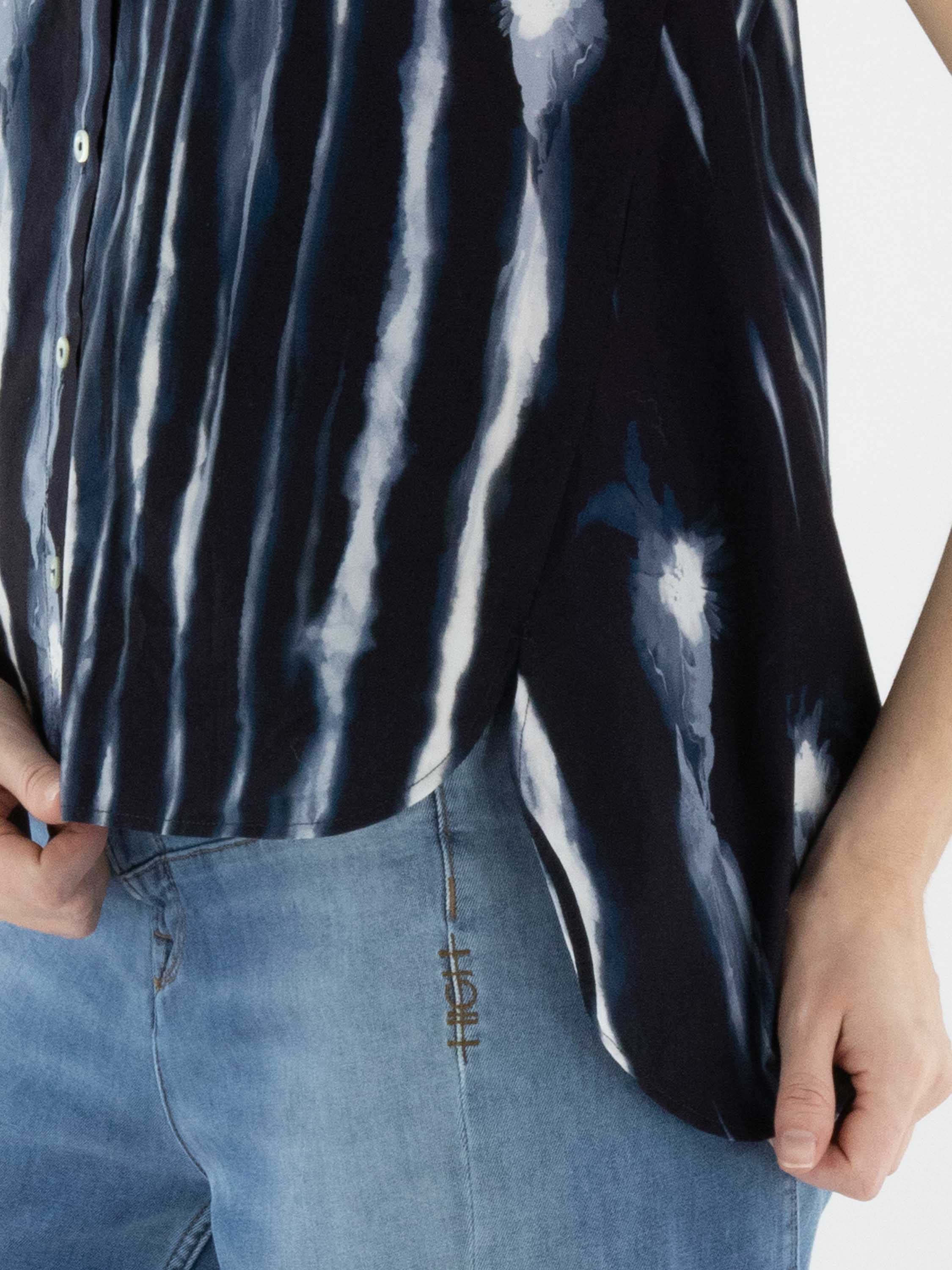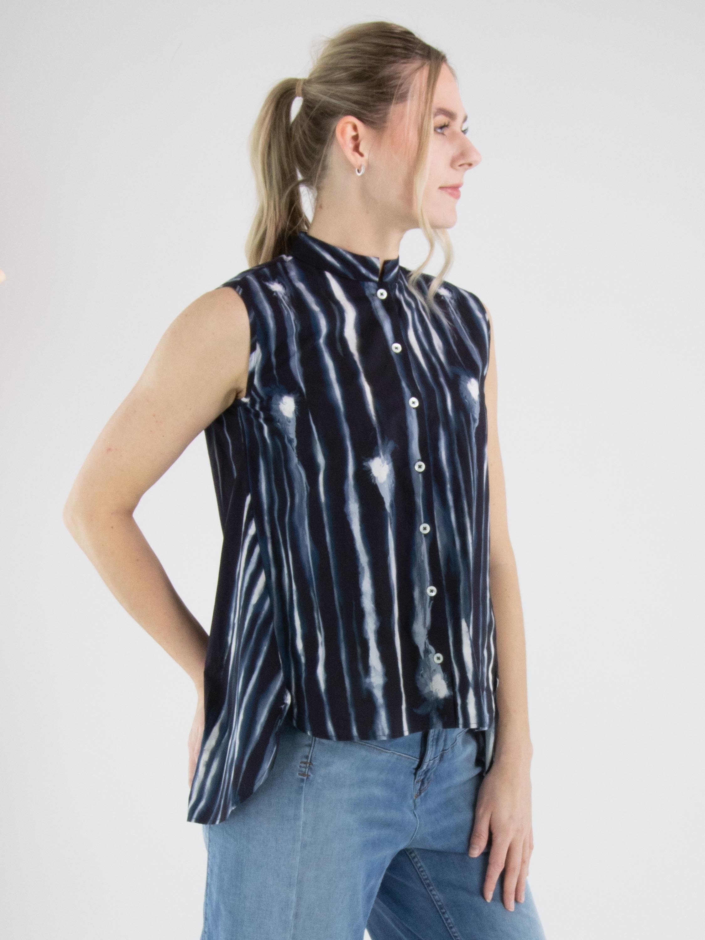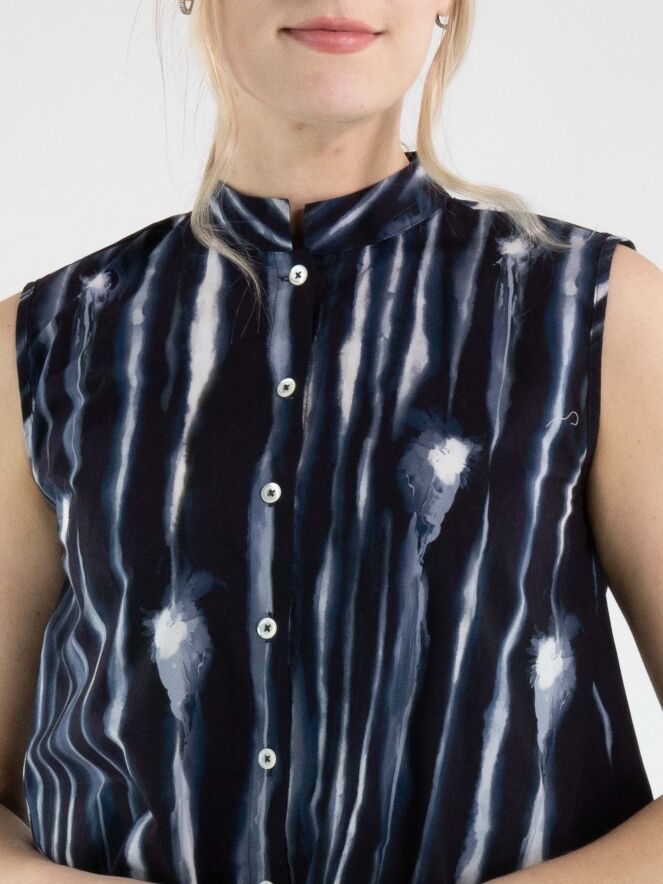Top by High featuring a graphic paint print with vertical lines in multiple shades of blue and off-white. Designed with a button closure and a subtle A-line shape, it creates a fluid and contemporary silhouette. This exclusive designer top can be washed at 30 degrees.