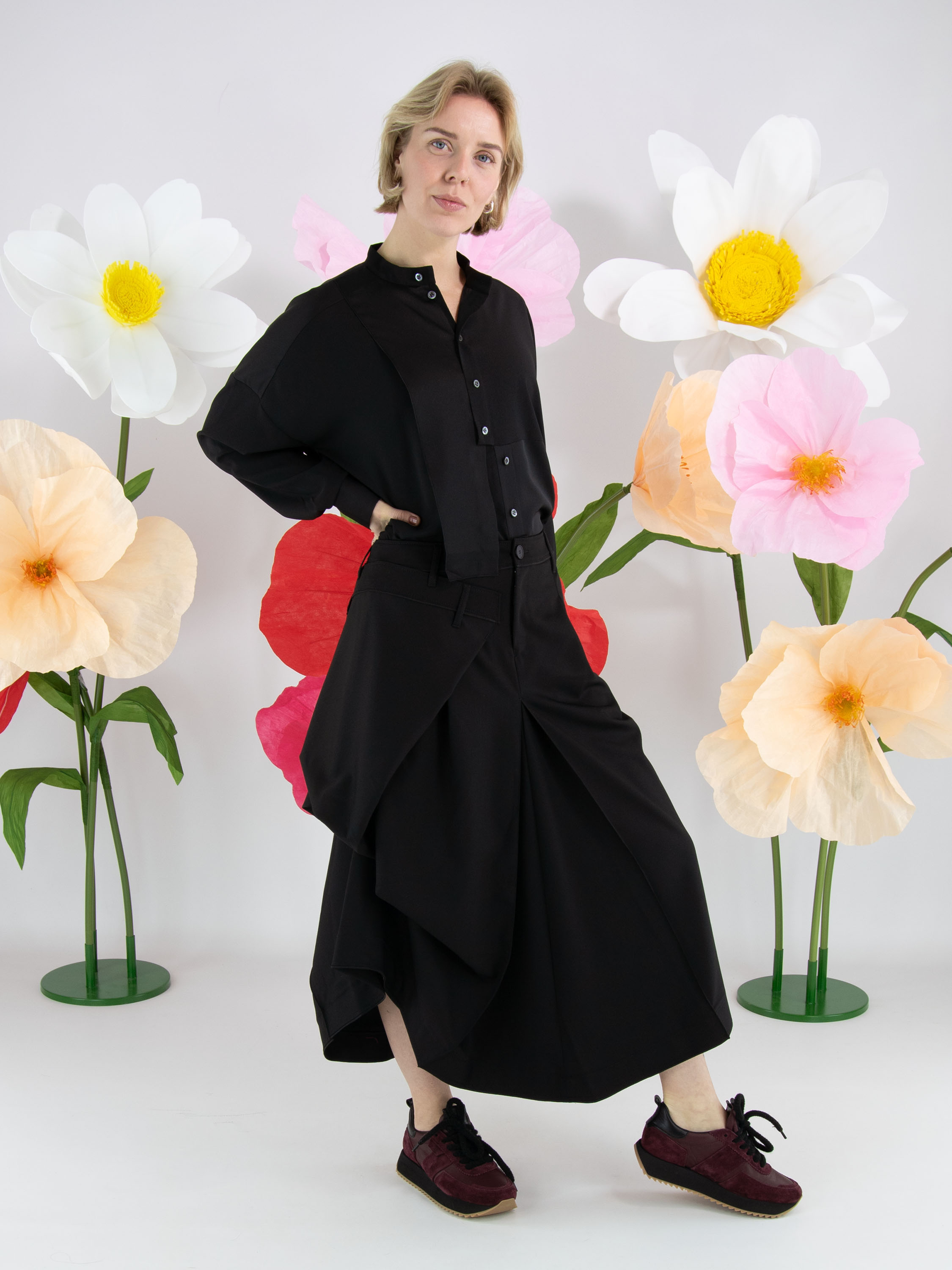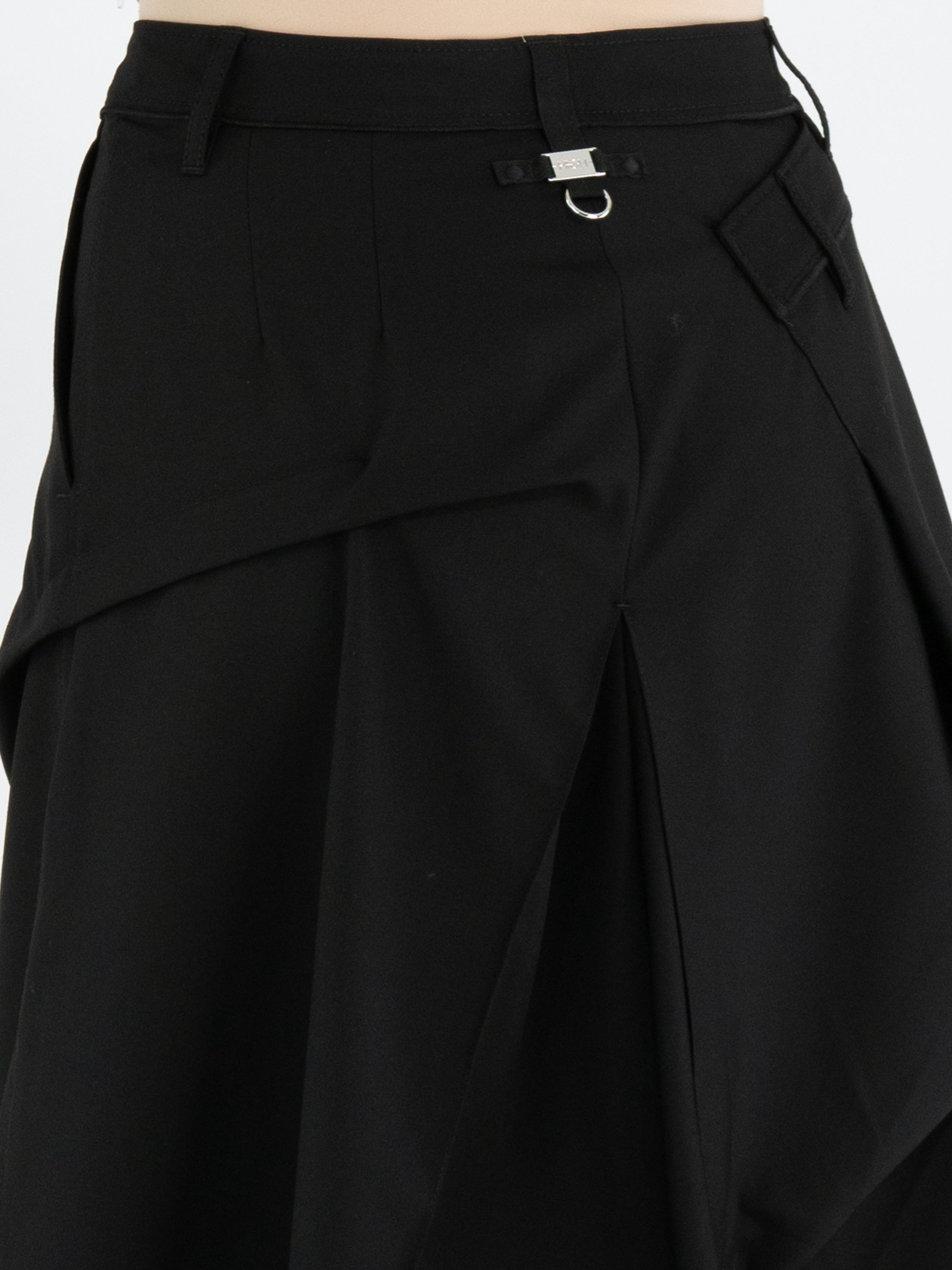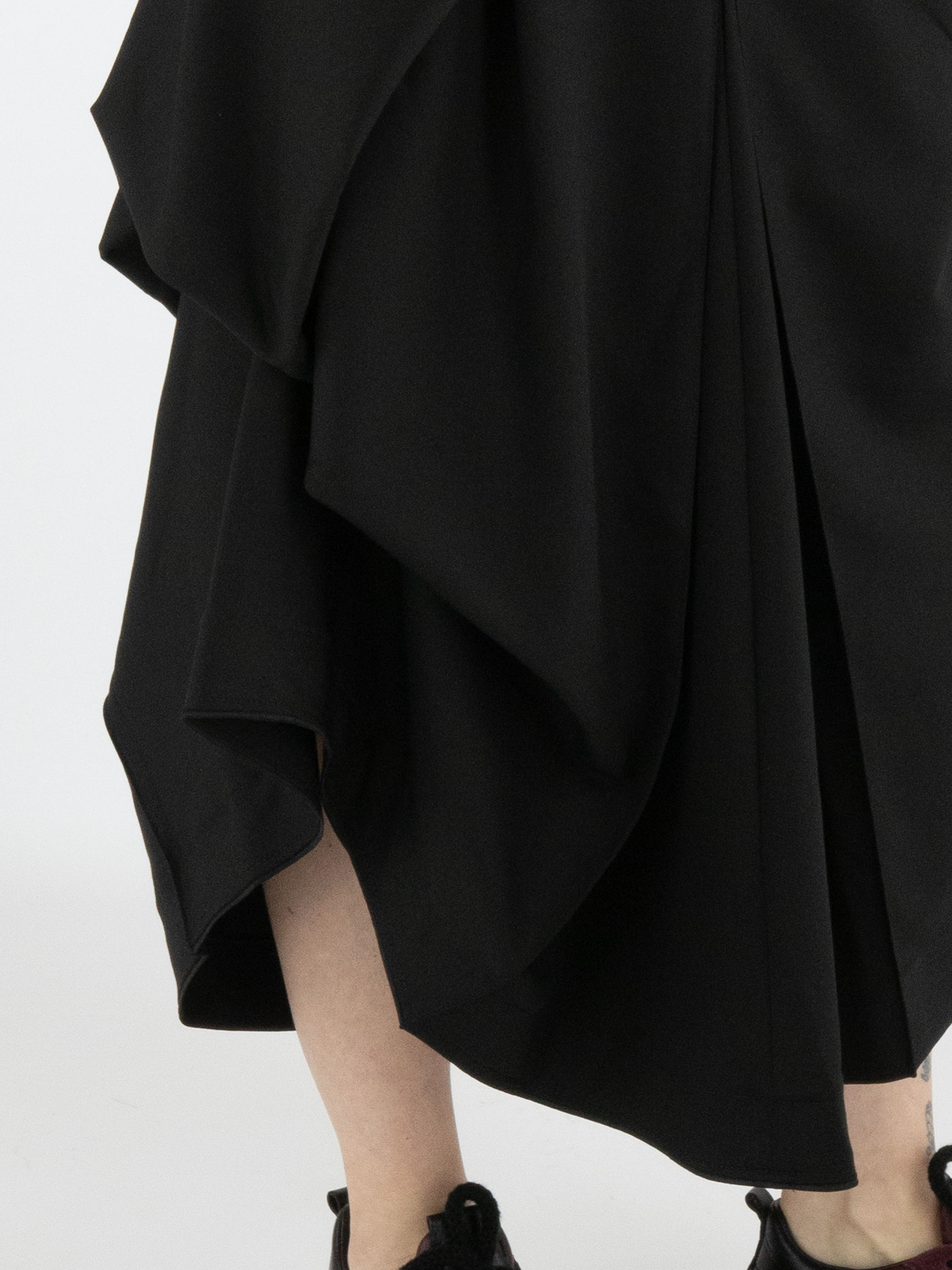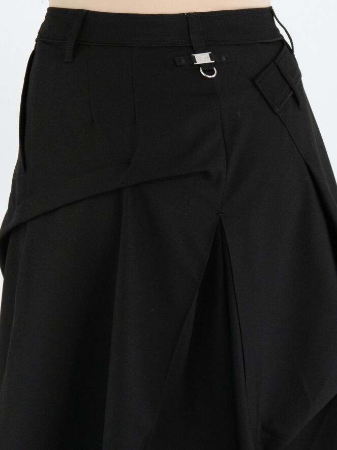 A skirt from High Tech in black. Below the waist on the right front side, there is an overlapping pleat that continues towards the back. At the centre of the front and back, below the hip, pleating is formed from the centre seam. At hip level on the left side, the fabric is fixed in place, creating an additional pleated effect. The skirt has a slit pocket on the left side. This skirt can be hand-washed.