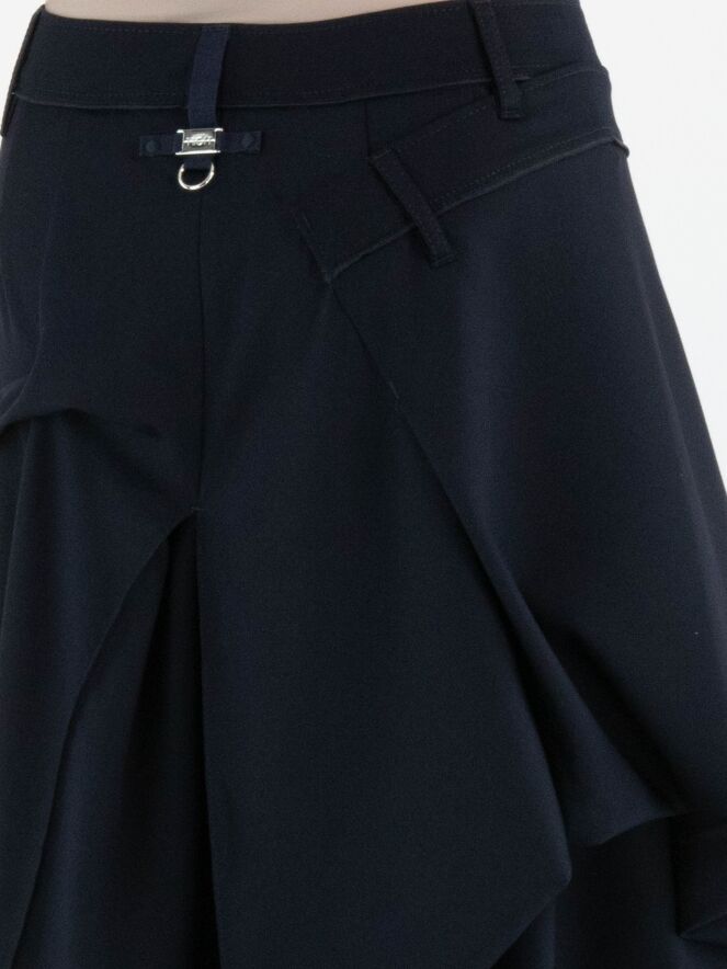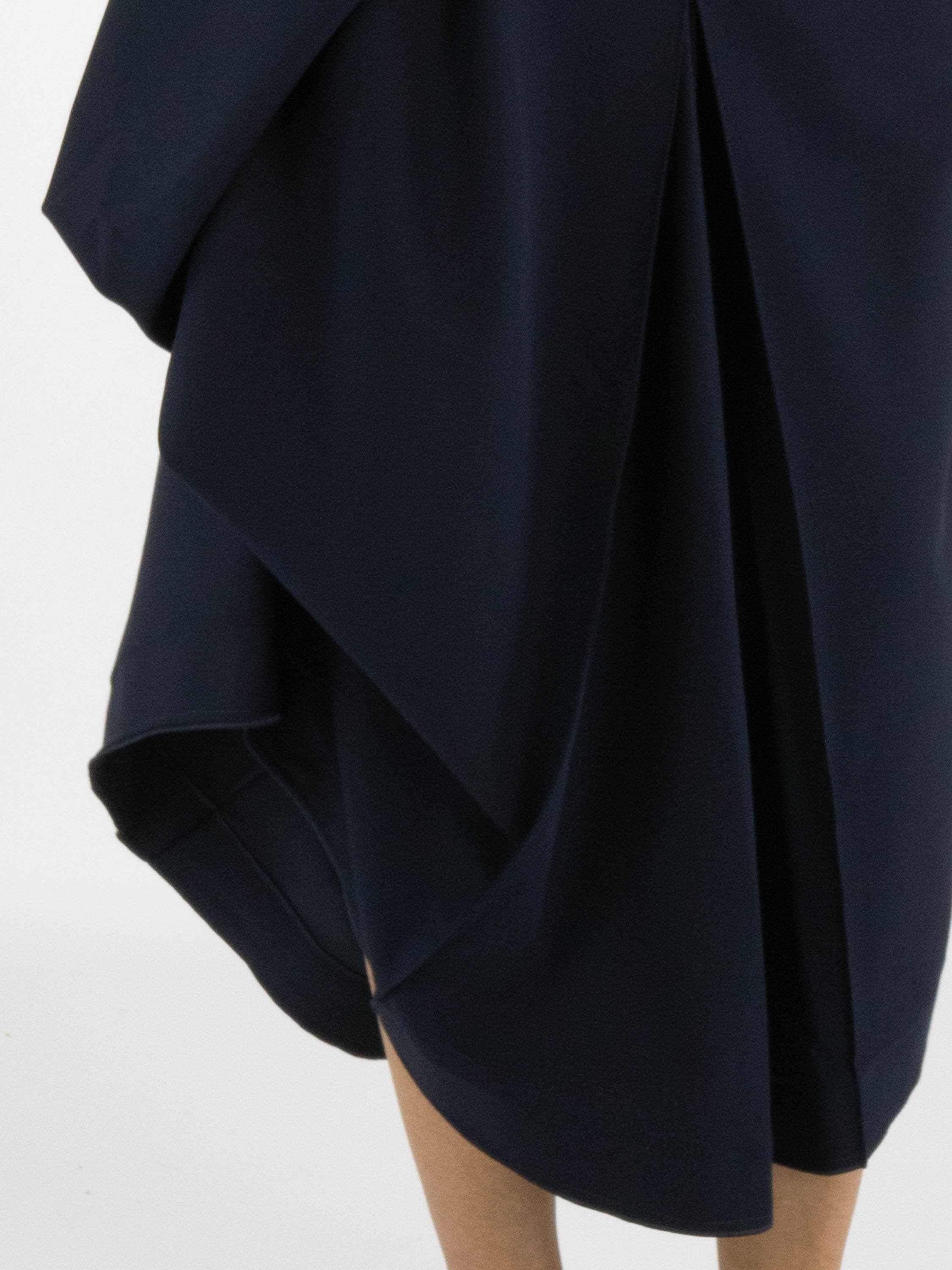 A skirt from High Tech in navy blue. Below the waist, on the right front side, there is an overlapping pleat that continues towards the back. At the centre of the front and back, below the hip, pleats are formed from the centre seam. At hip level on the left side, the fabric is fixed, creating an additional pleated effect. The skirt has a slit pocket on the left side. This skirt can be hand-washed.