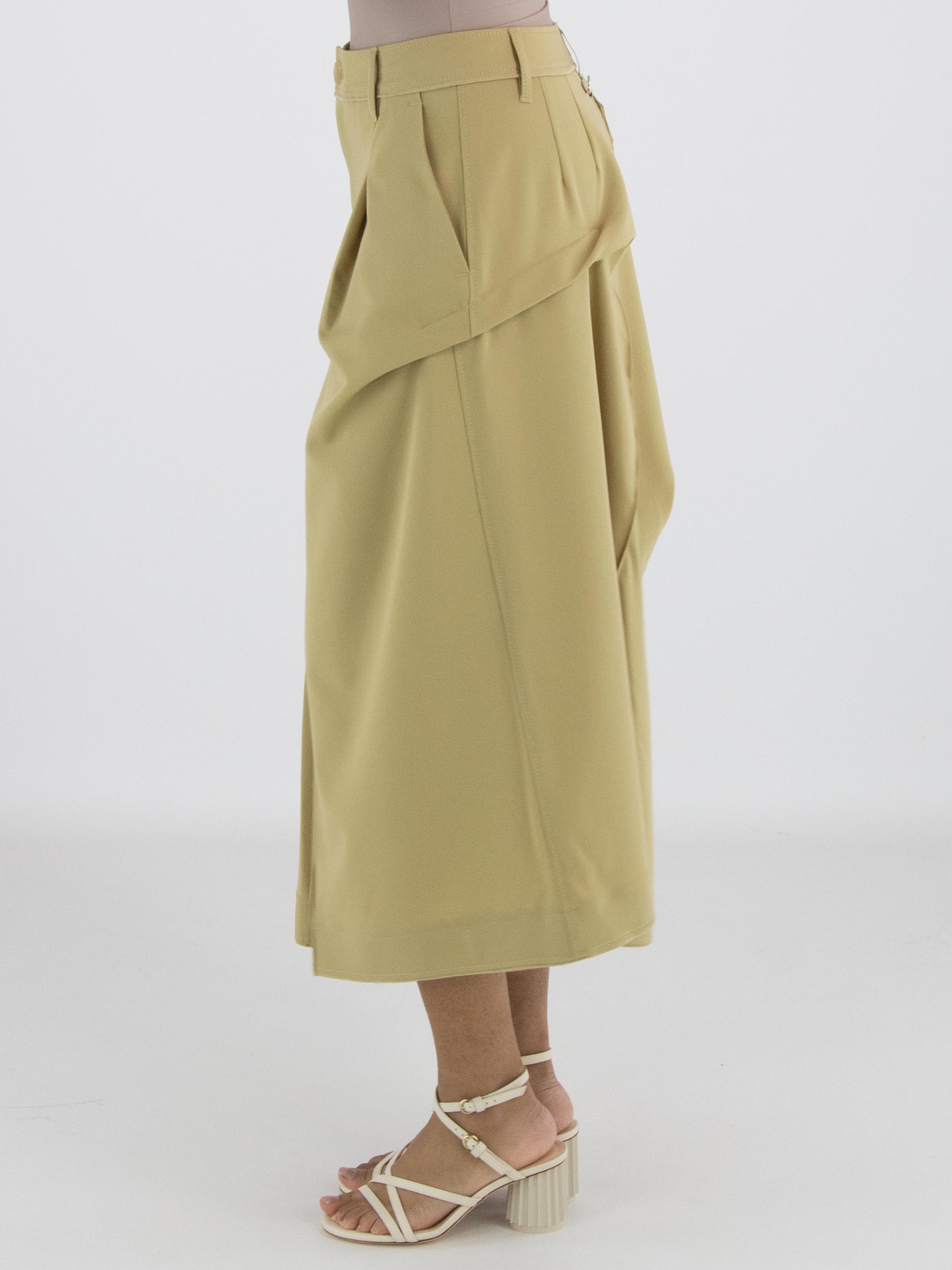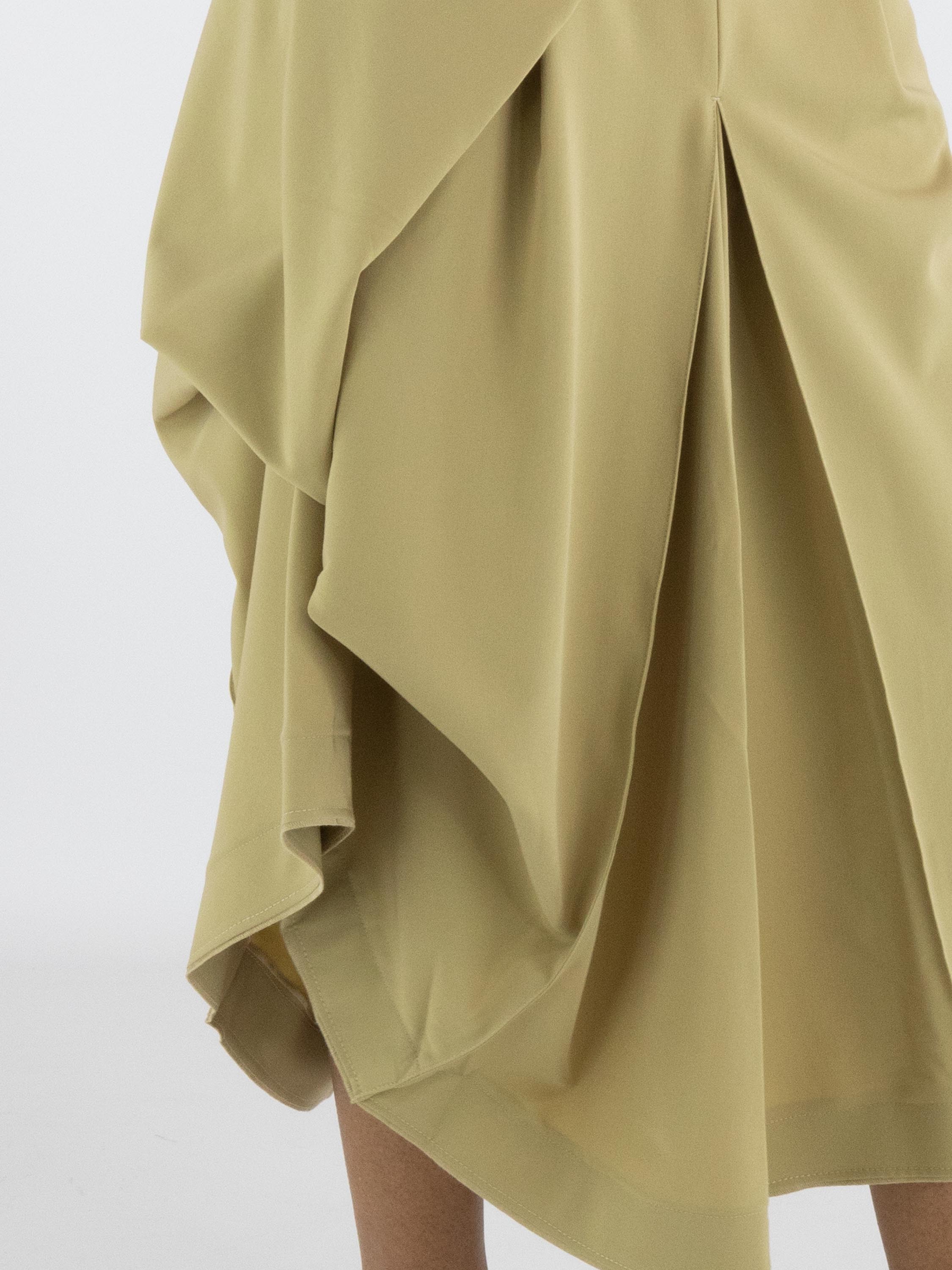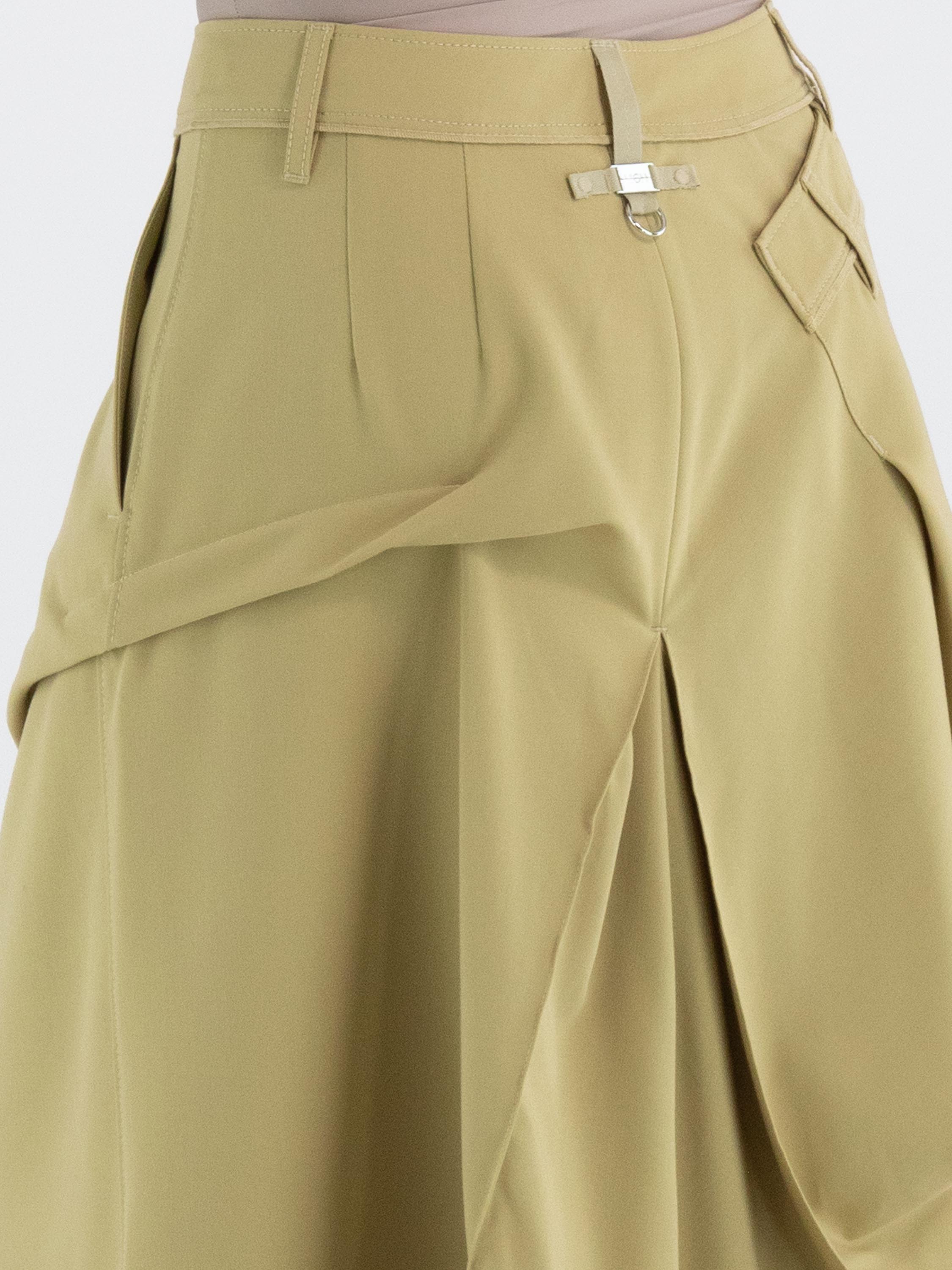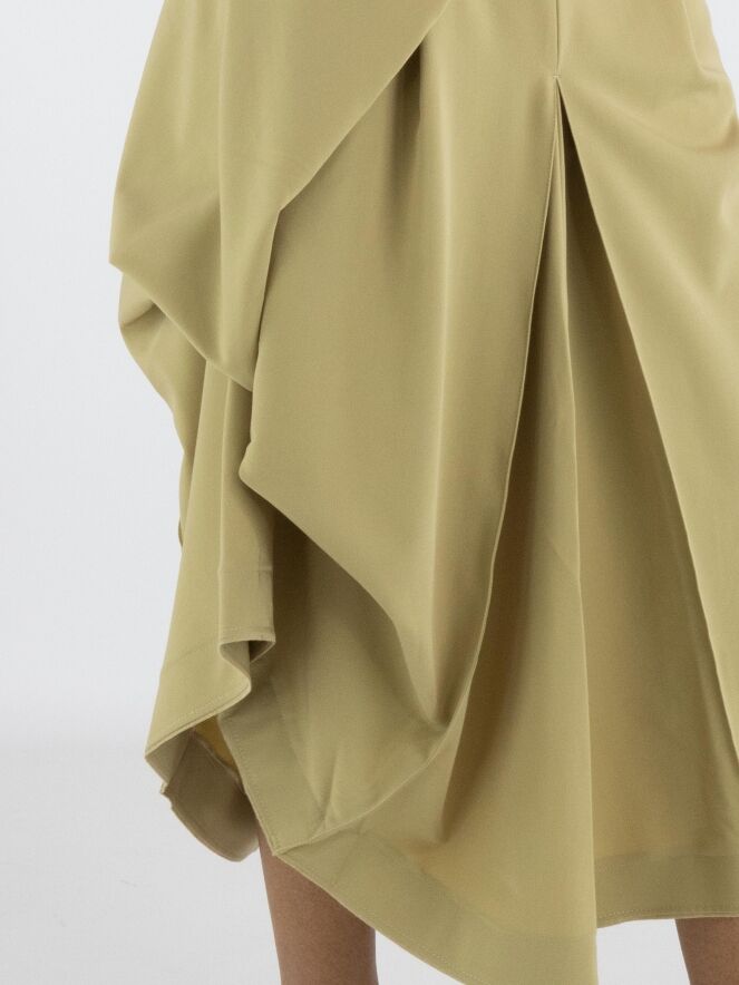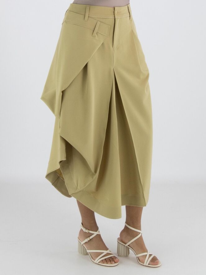 A skirt from High Tech in a mustard yellow colour. Below the waist on the right front, there is an overlapping pleat that continues towards the back. At the centre of both the front and back, below the hip, pleating is formed from the centre seam. At hip level on the left side, the fabric is fixed, creating an additional pleated effect. The skirt has a slit pocket on the left side. This skirt can be hand-washed.