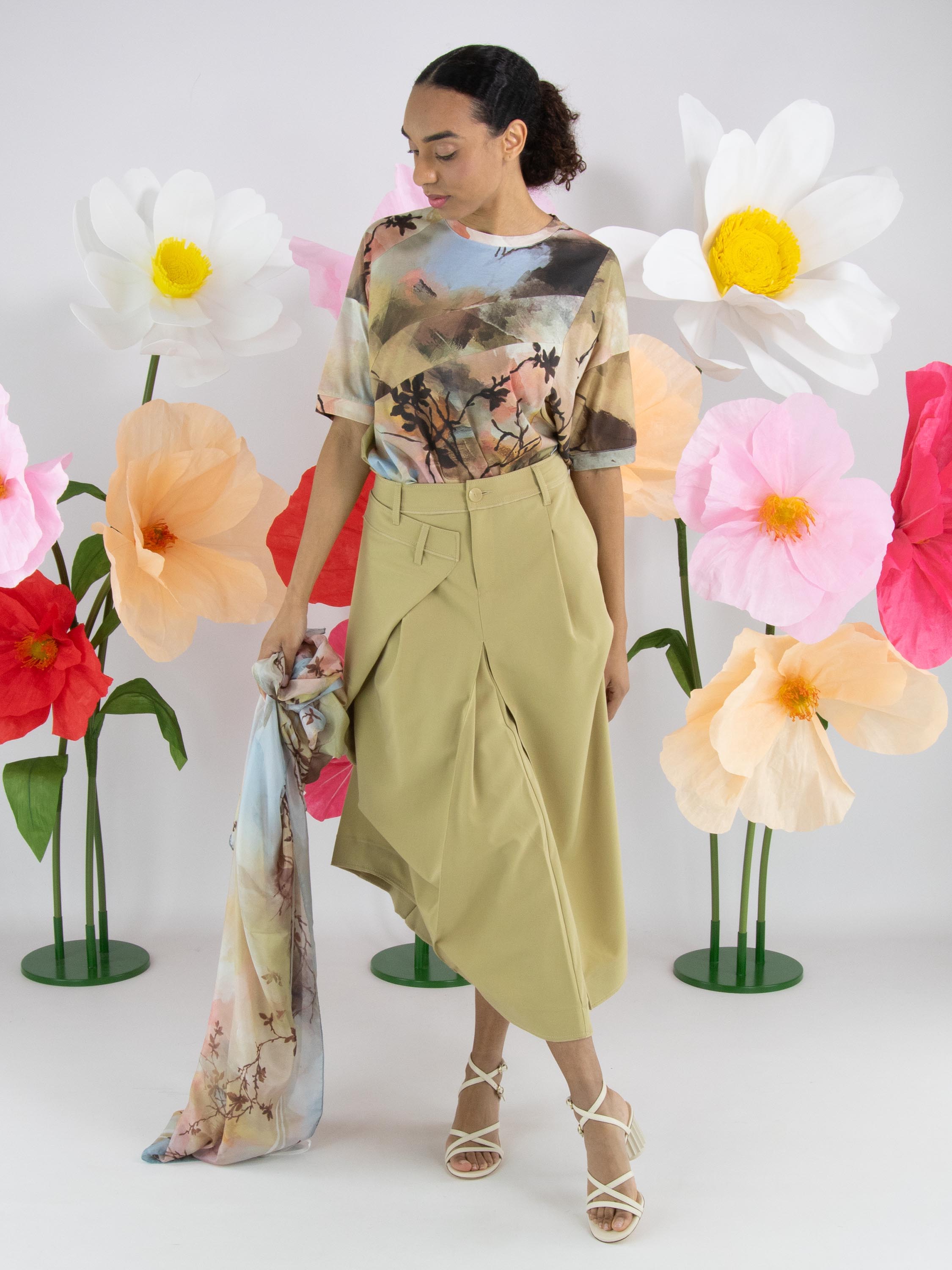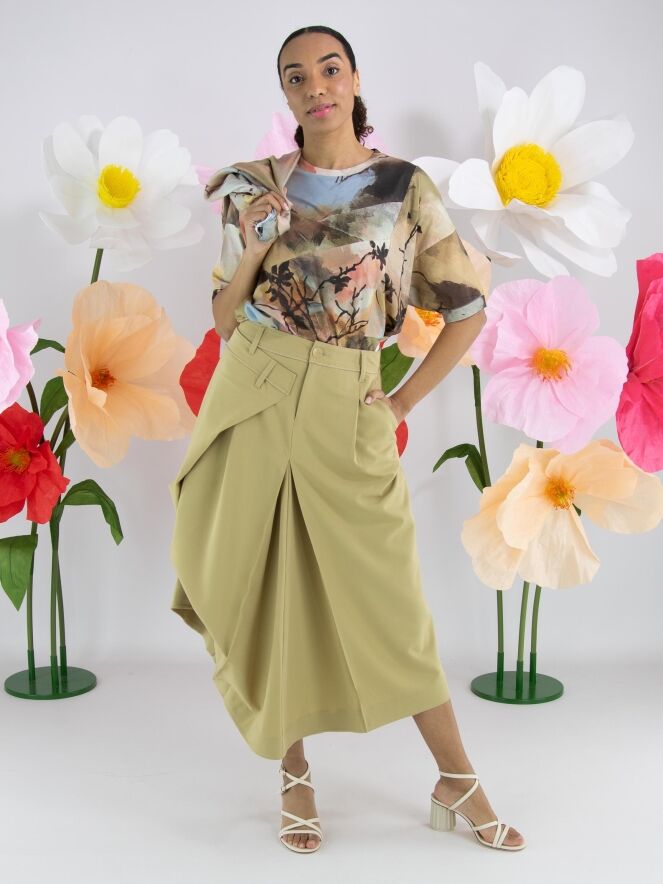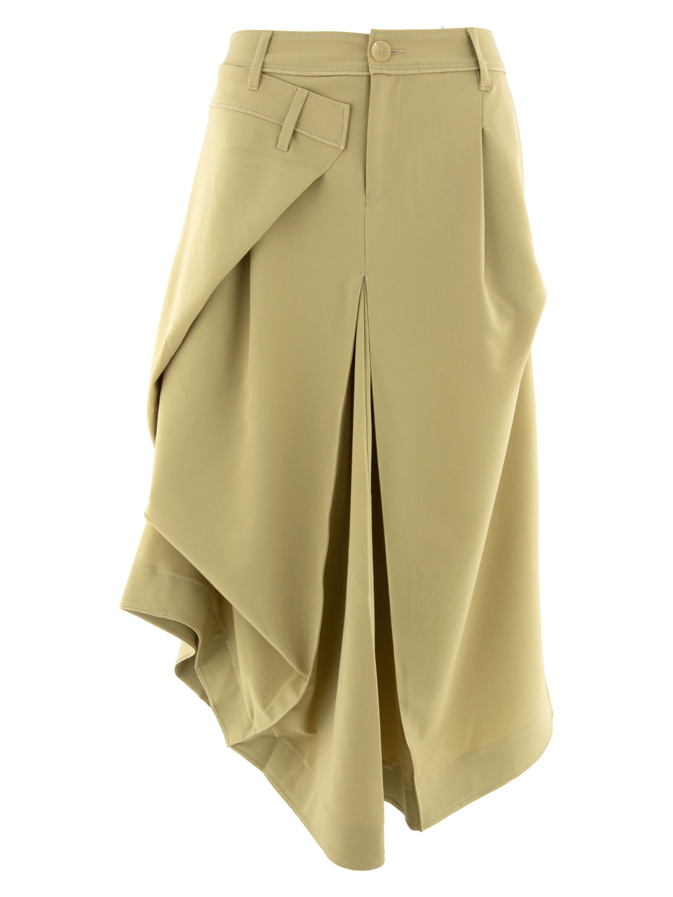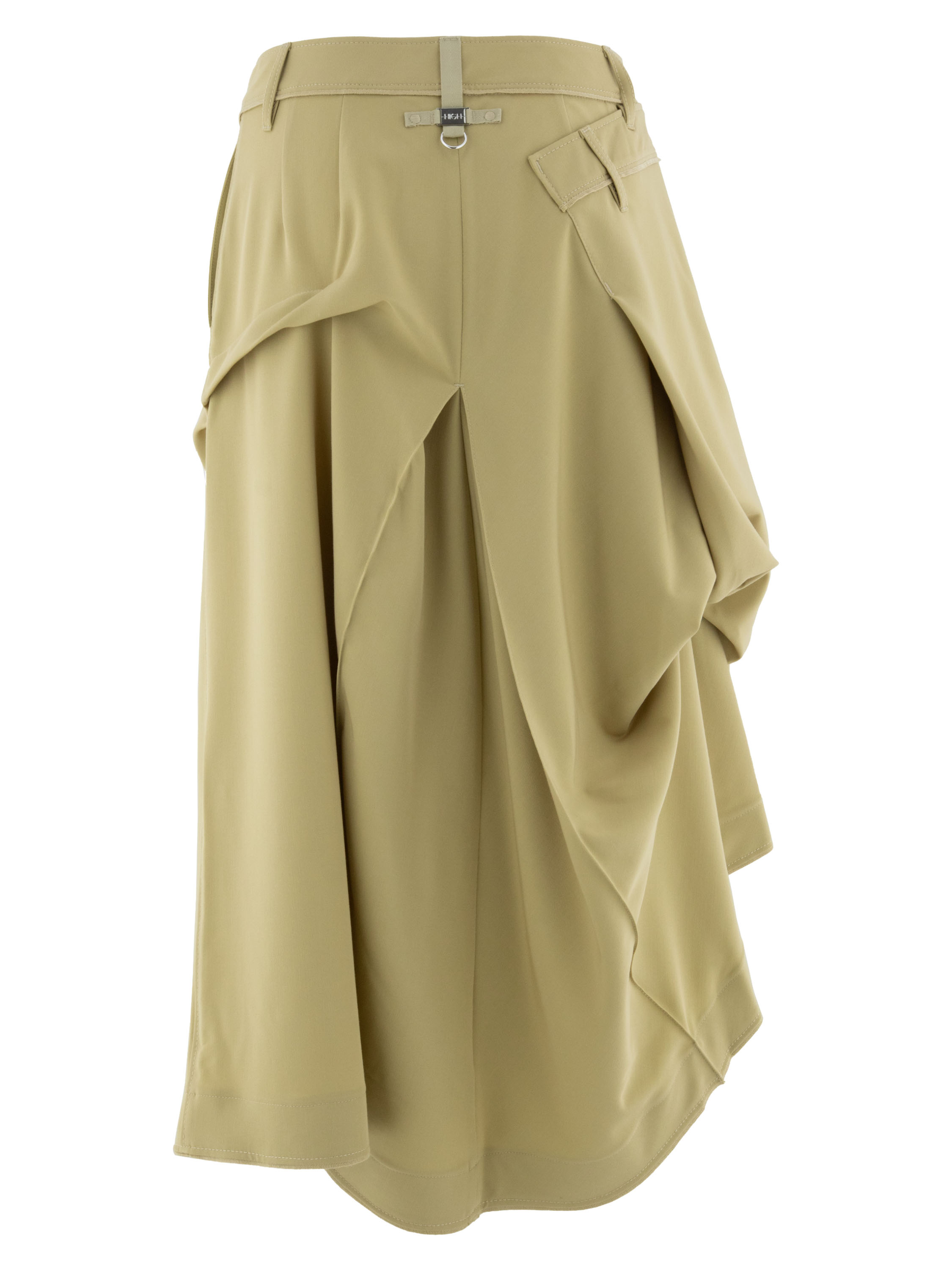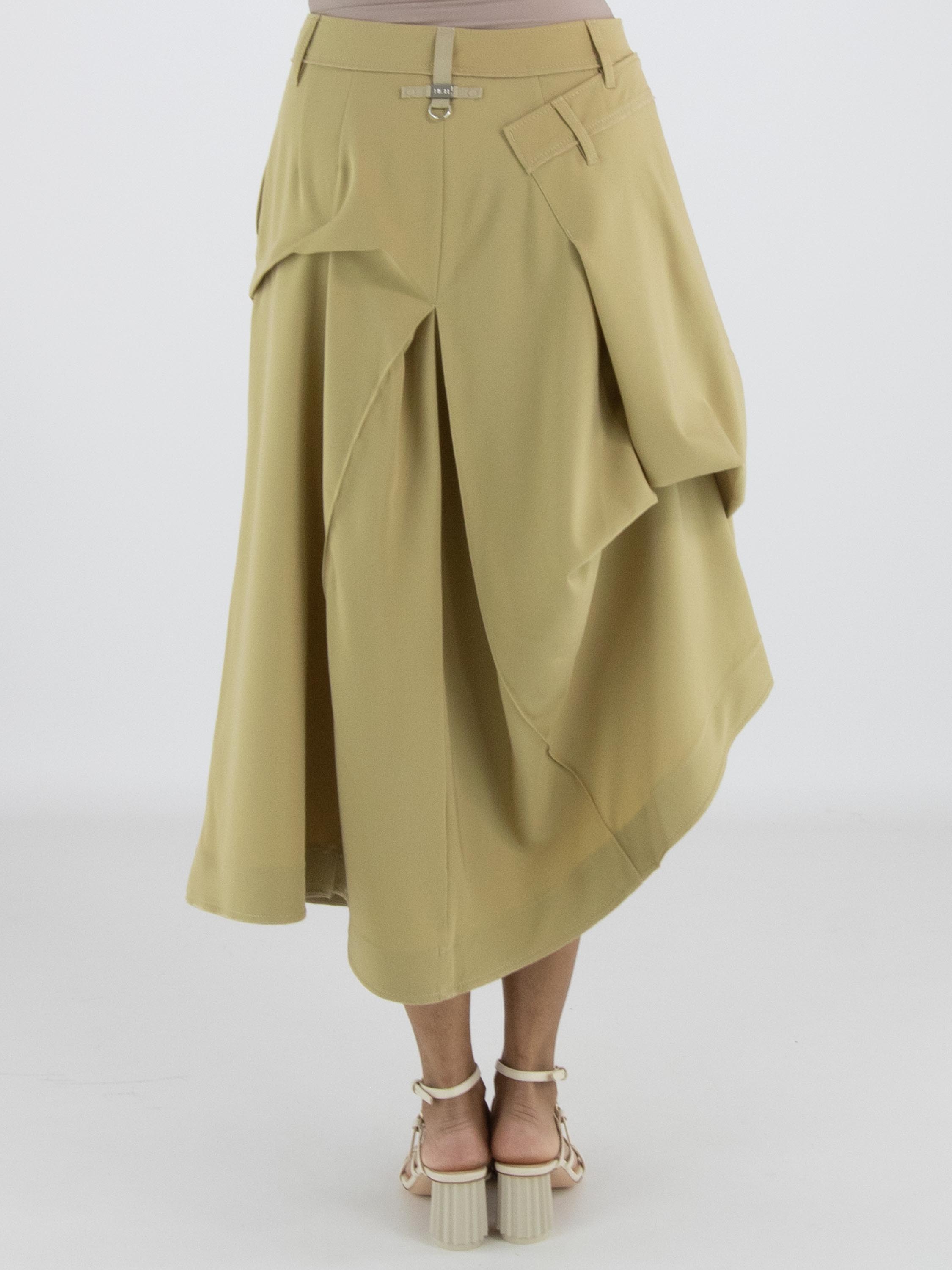 A skirt from High Tech in a mustard yellow colour. Below the waist on the right front, there is an overlapping pleat that continues towards the back. At the centre of both the front and back, below the hip, pleating is formed from the centre seam. At hip level on the left side, the fabric is fixed, creating an additional pleated effect. The skirt has a slit pocket on the left side. This skirt can be hand-washed.