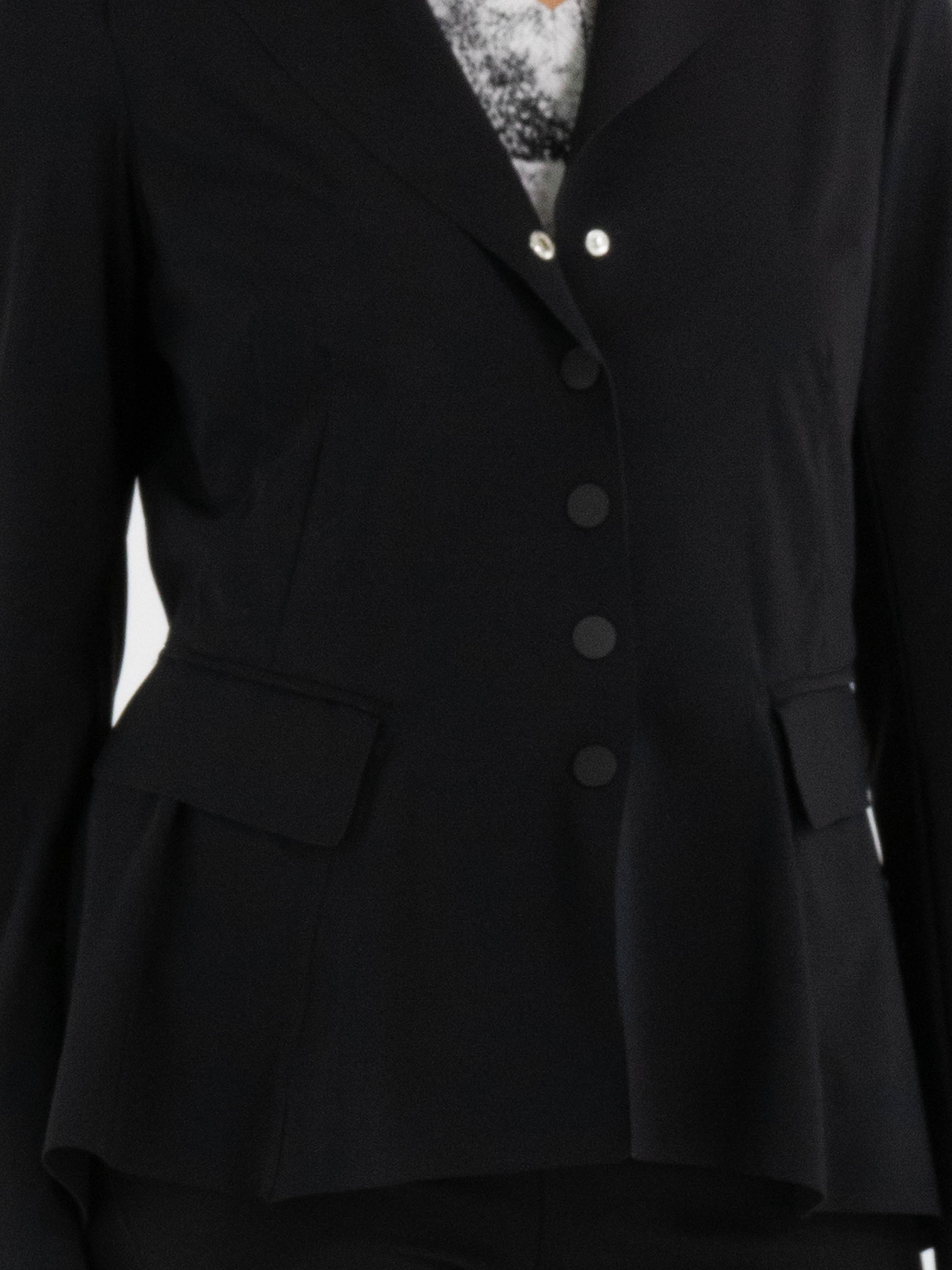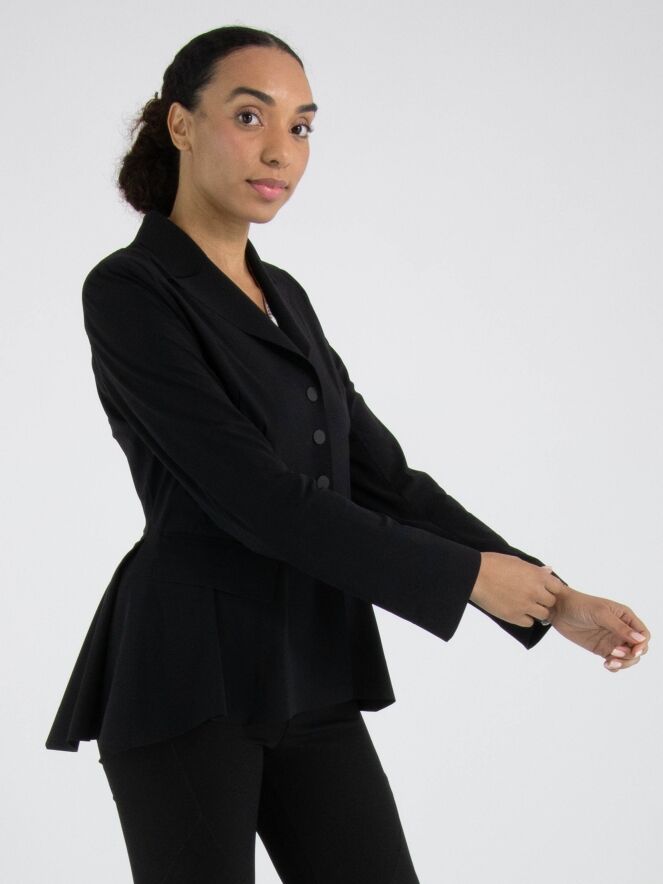 A blazer from High Tech in black. The blazer has a closure with five snap buttons. At the back, at waist level, there is a seam from which the fabric is softly gathered in waves downward, with several waist seams above this seam. The blazer is unlined and can be hand-washed.