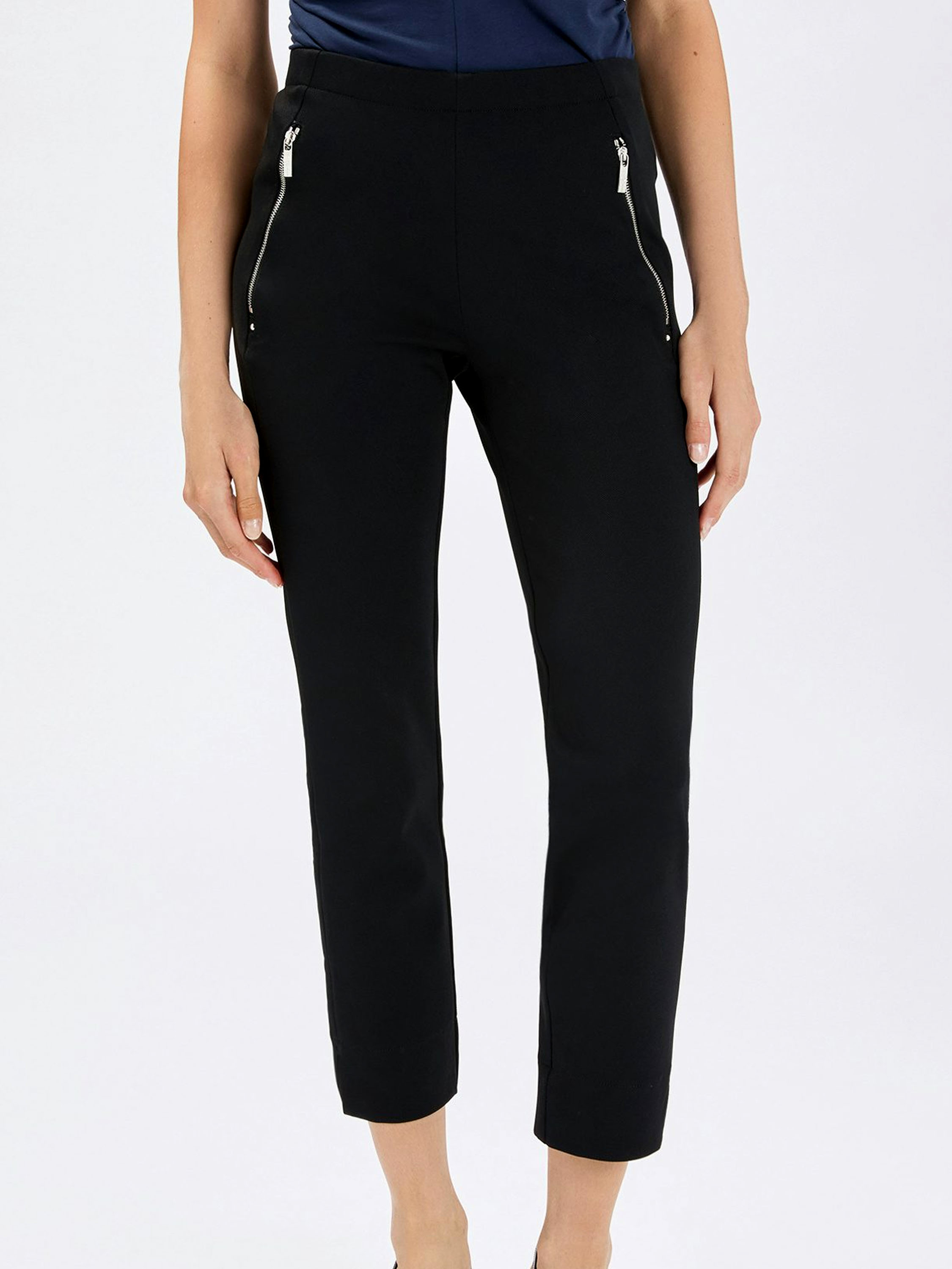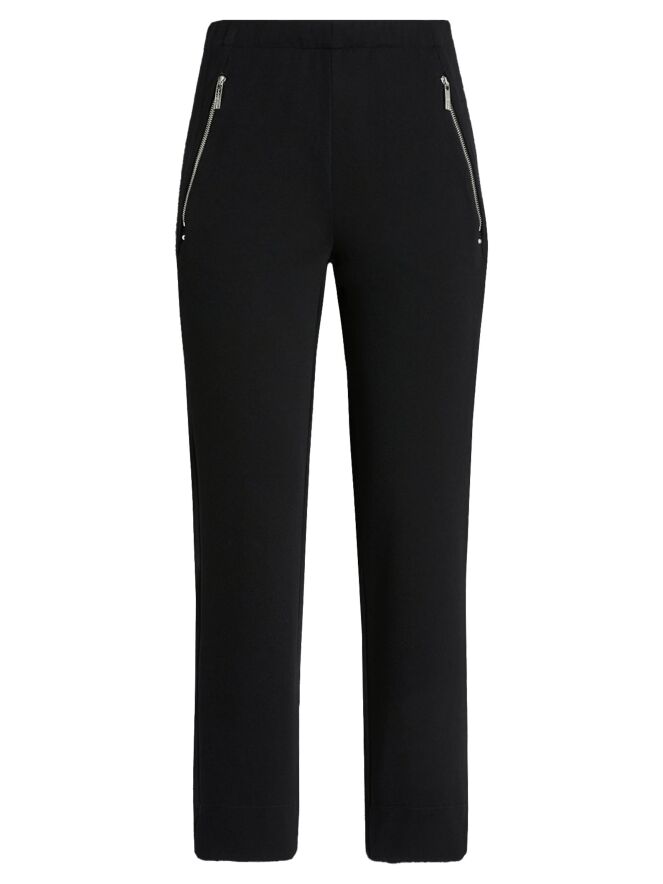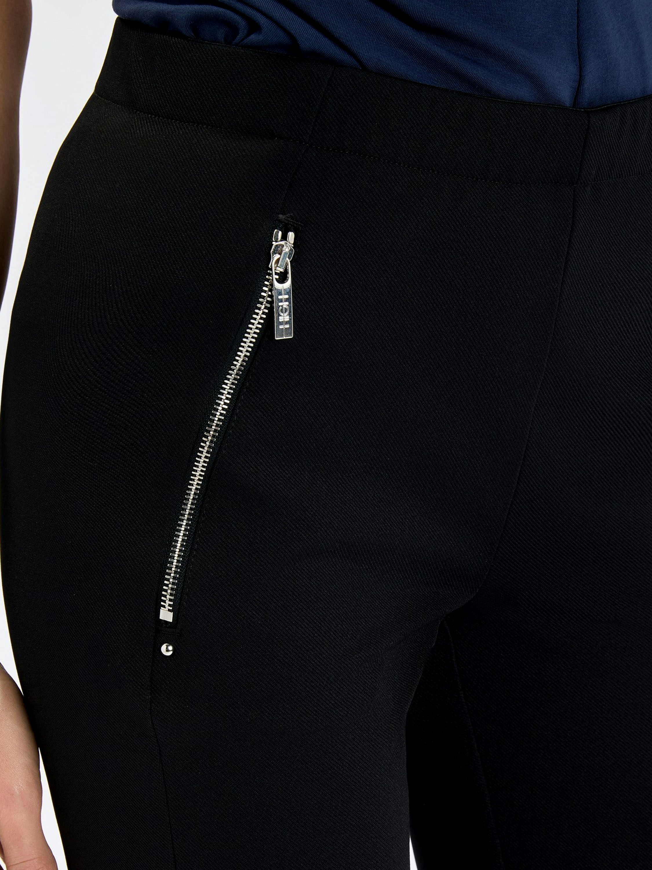 Trousers by High in black. The waistband features an elastic band for a comfortable fit. The side pockets are finished with silver-toned zippers, adding a modern and subtly edgy detail. These trousers should be hand-washed.
