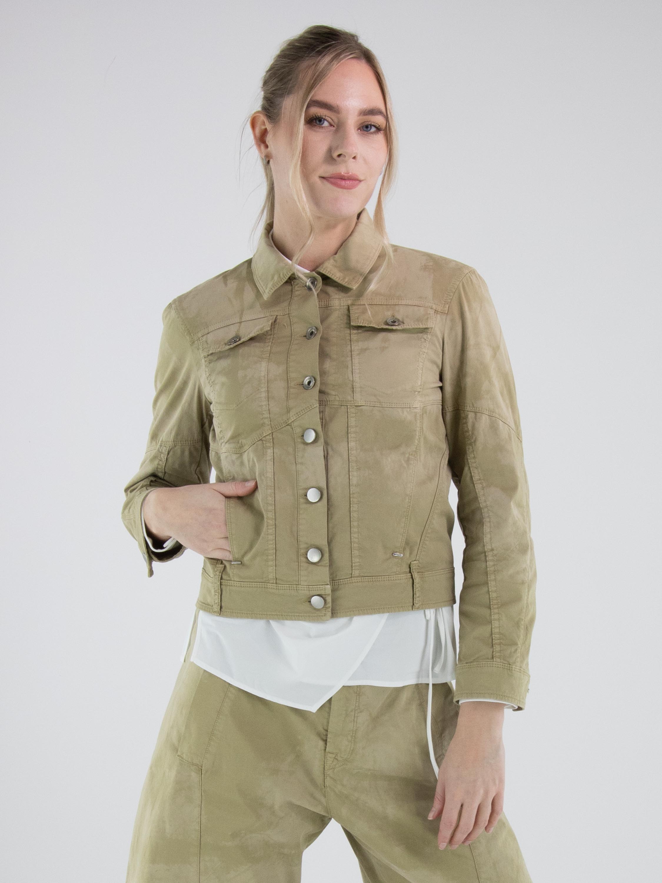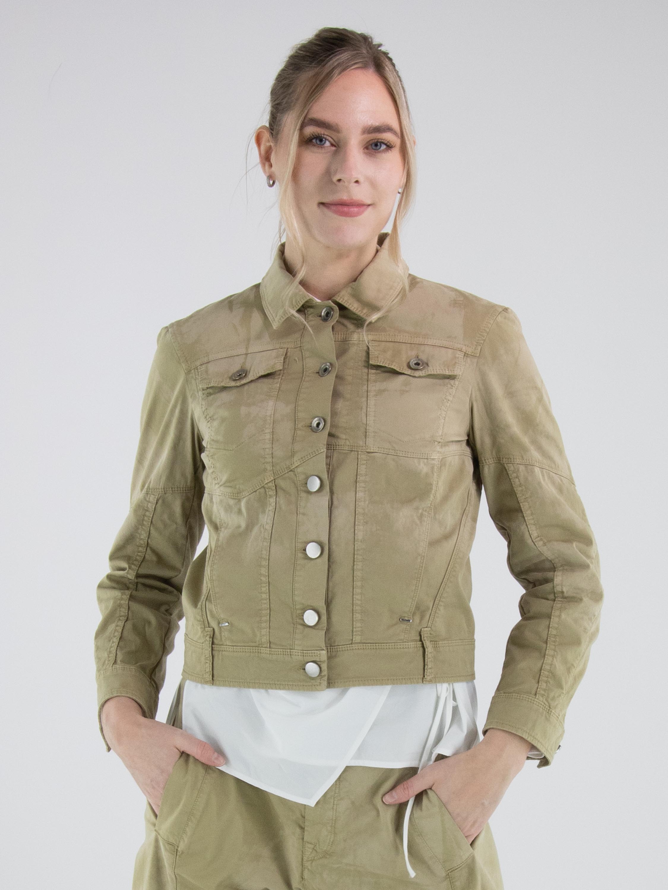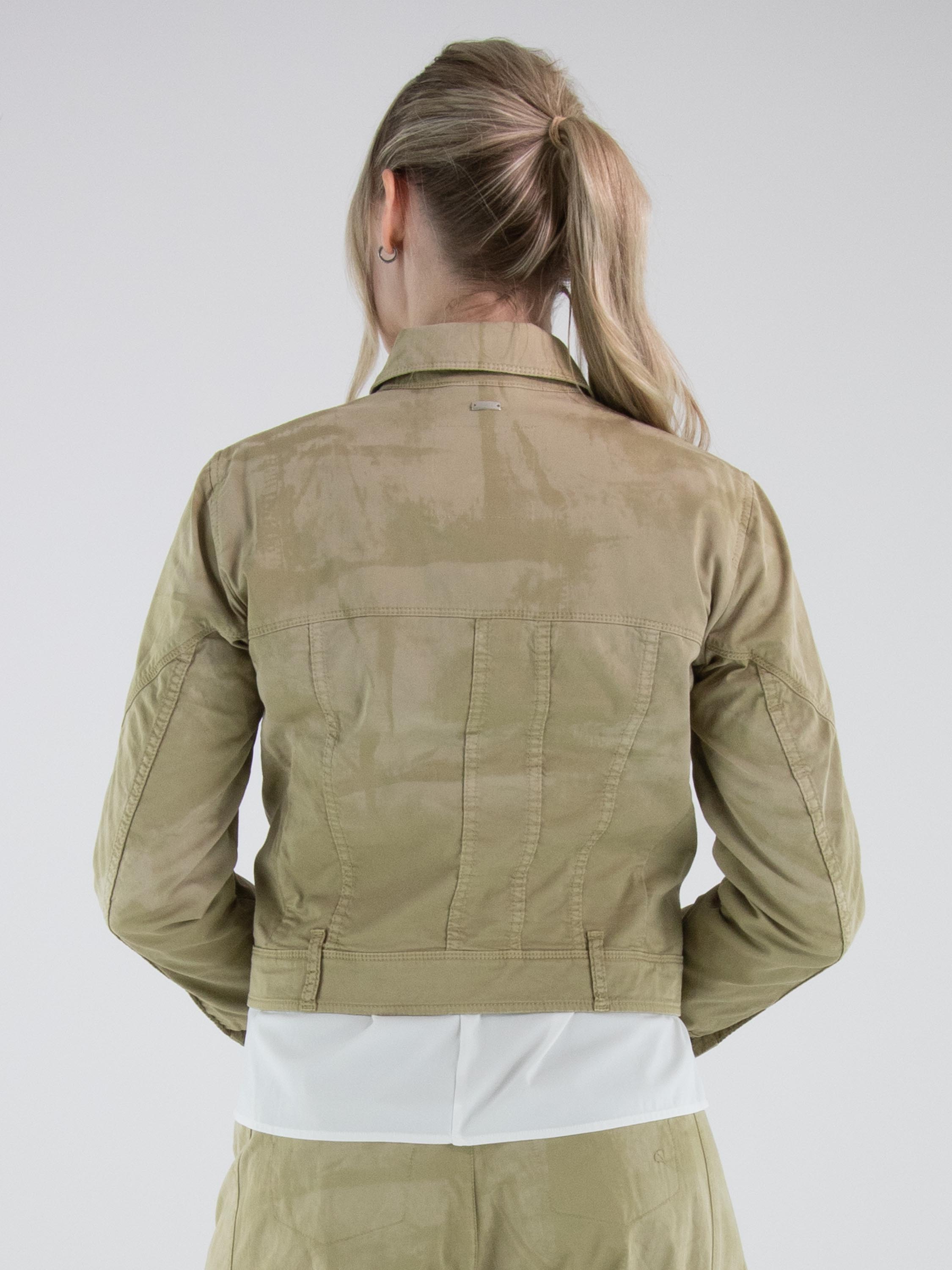 Short denim blazer by High featuring a mottled tone-on-tone print in multiple shades of olive green. The blazer fastens with buttons and includes side pockets at waist level. Its contemporary design gives it a relaxed yet refined character. This blazer can be washed at 30 degrees.