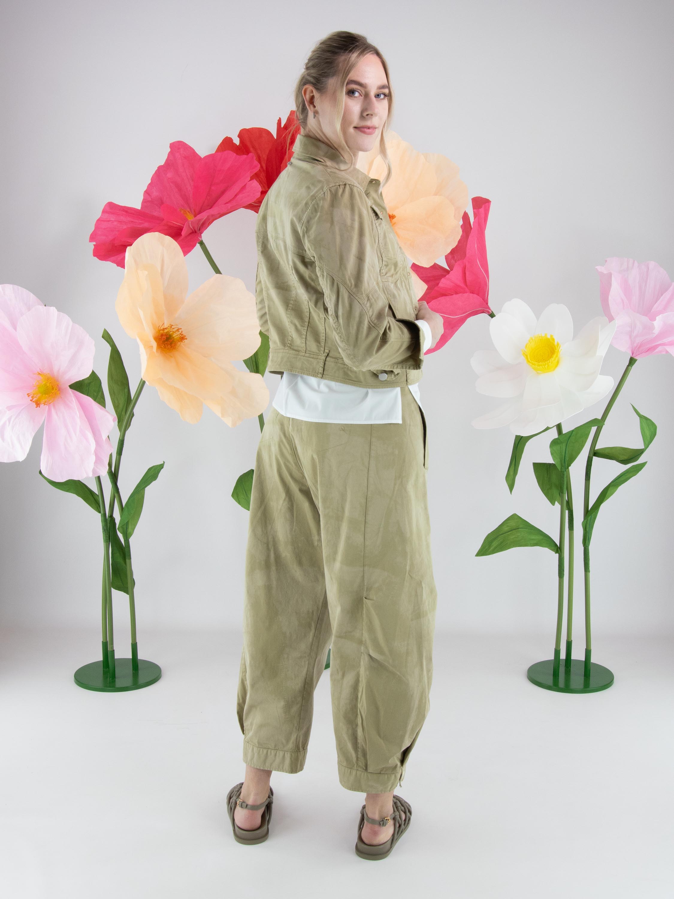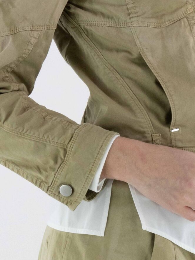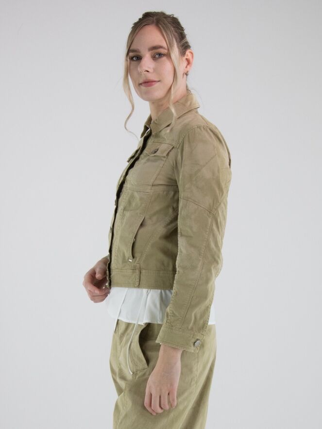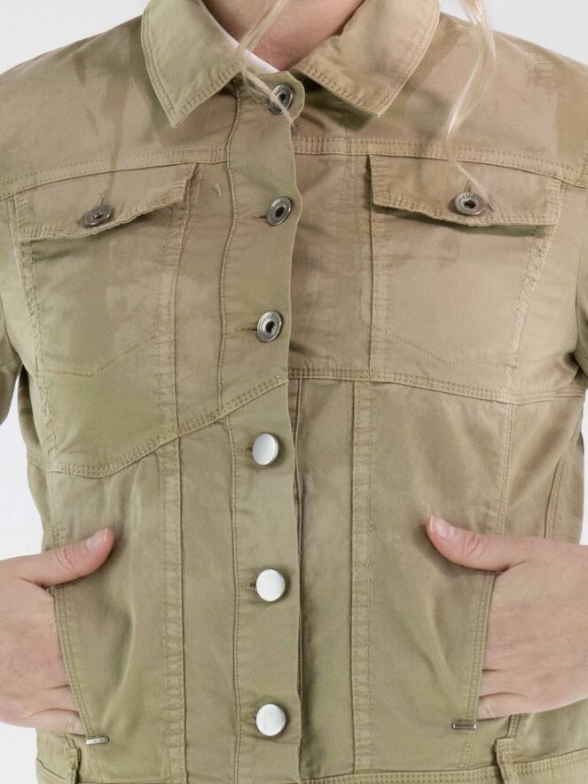 Short denim blazer by High featuring a mottled tone-on-tone print in multiple shades of olive green. The blazer fastens with buttons and includes side pockets at waist level. Its contemporary design gives it a relaxed yet refined character. This blazer can be washed at 30 degrees.
