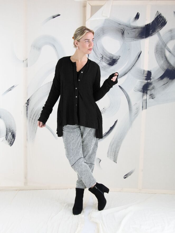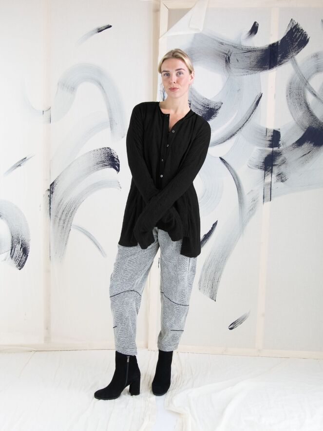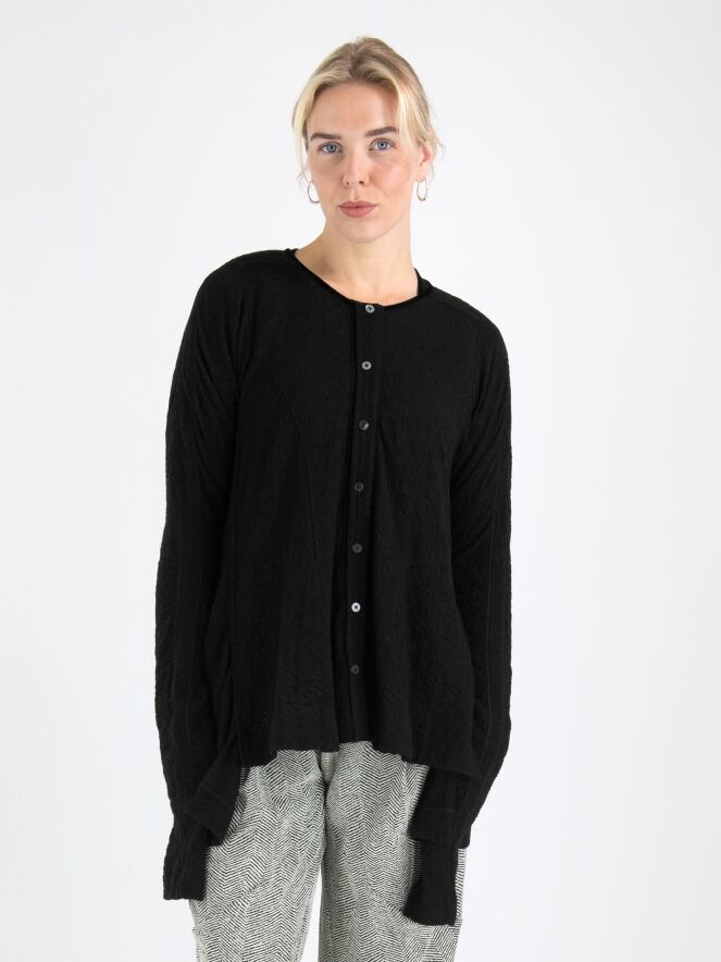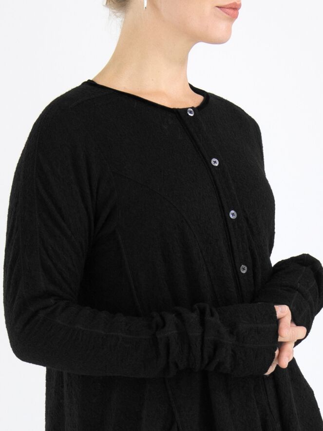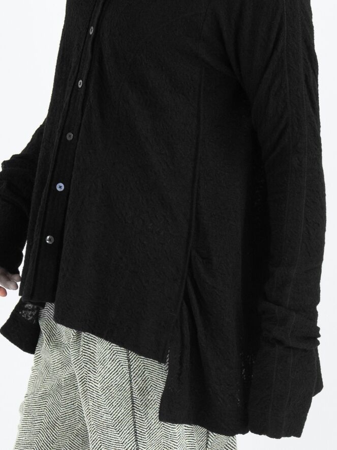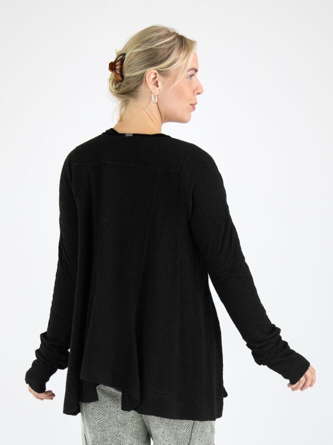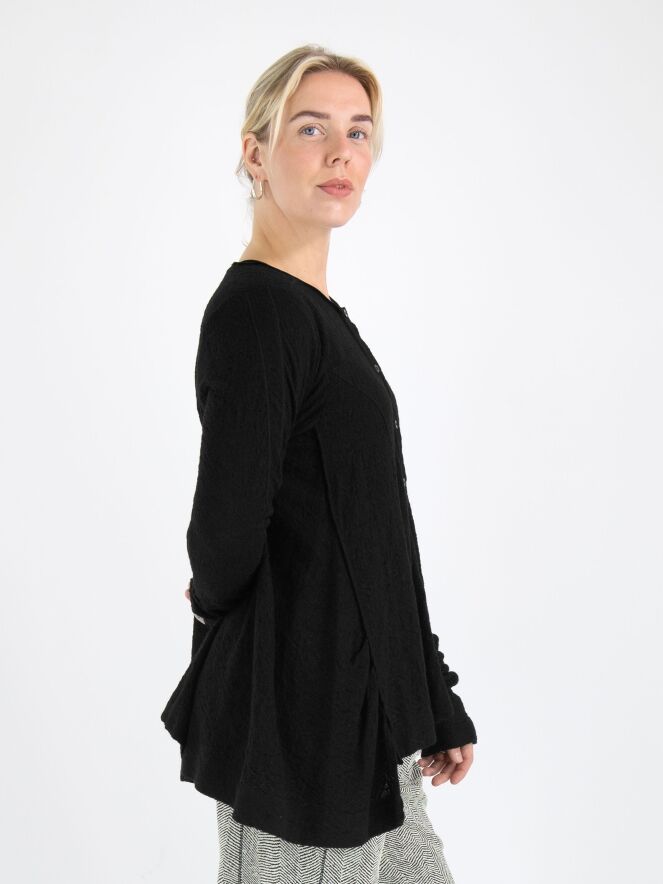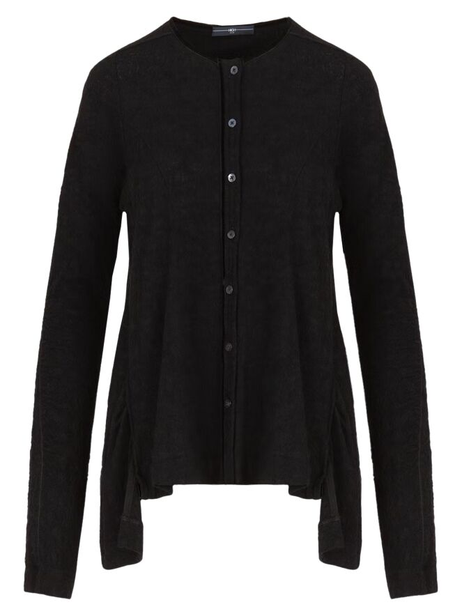 A light, transparent cardigan by High in black color. The fabric has a kind of embossed baroque pattern and is elastic. The cardigan flares out into an A-line from the waist. Along the edge of the round neckline and the closure is a velvet trim. This cardigan can be hand-washed.