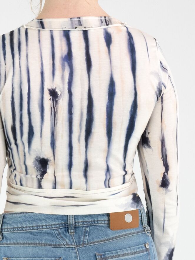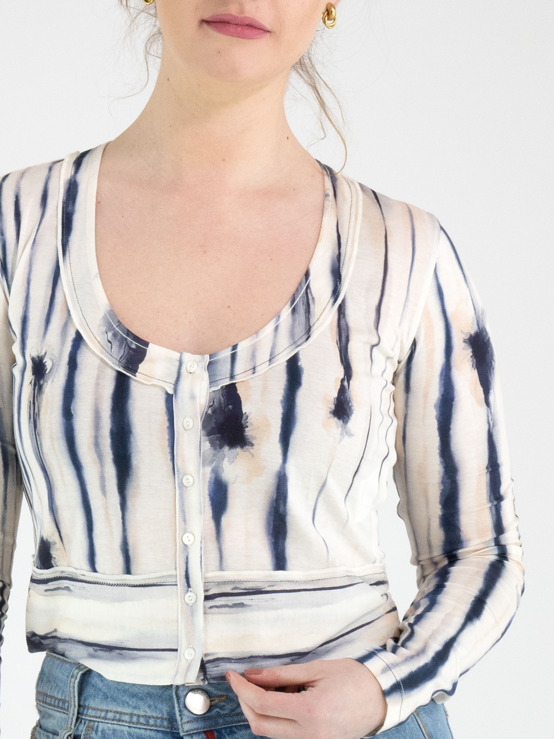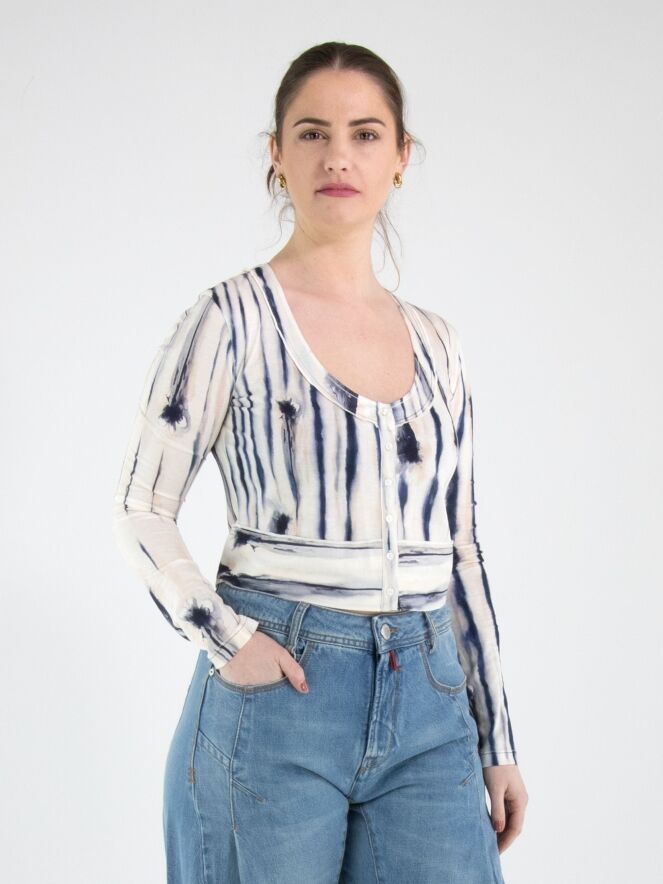 A short cardigan from High with a painted stripe print in black, blue and nude on an off-white background. The cardigan has a deep round neckline and a button fastening. This cardigan can be hand-washed.