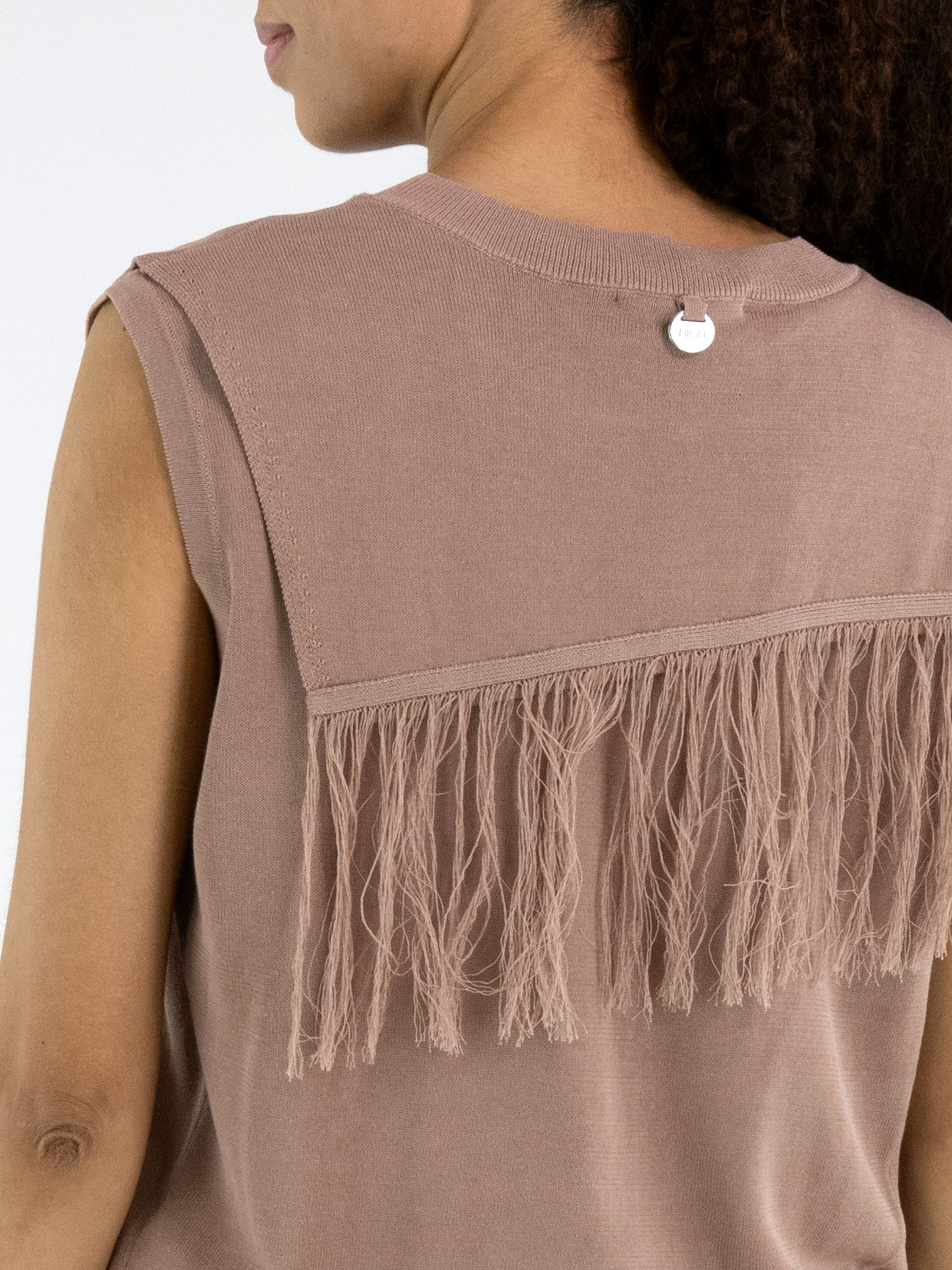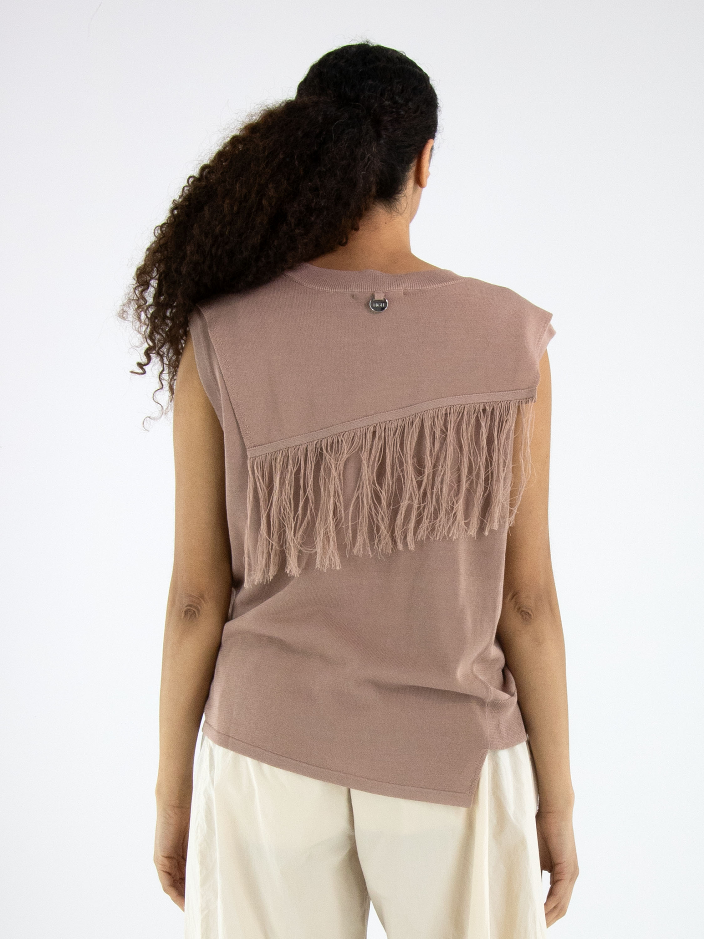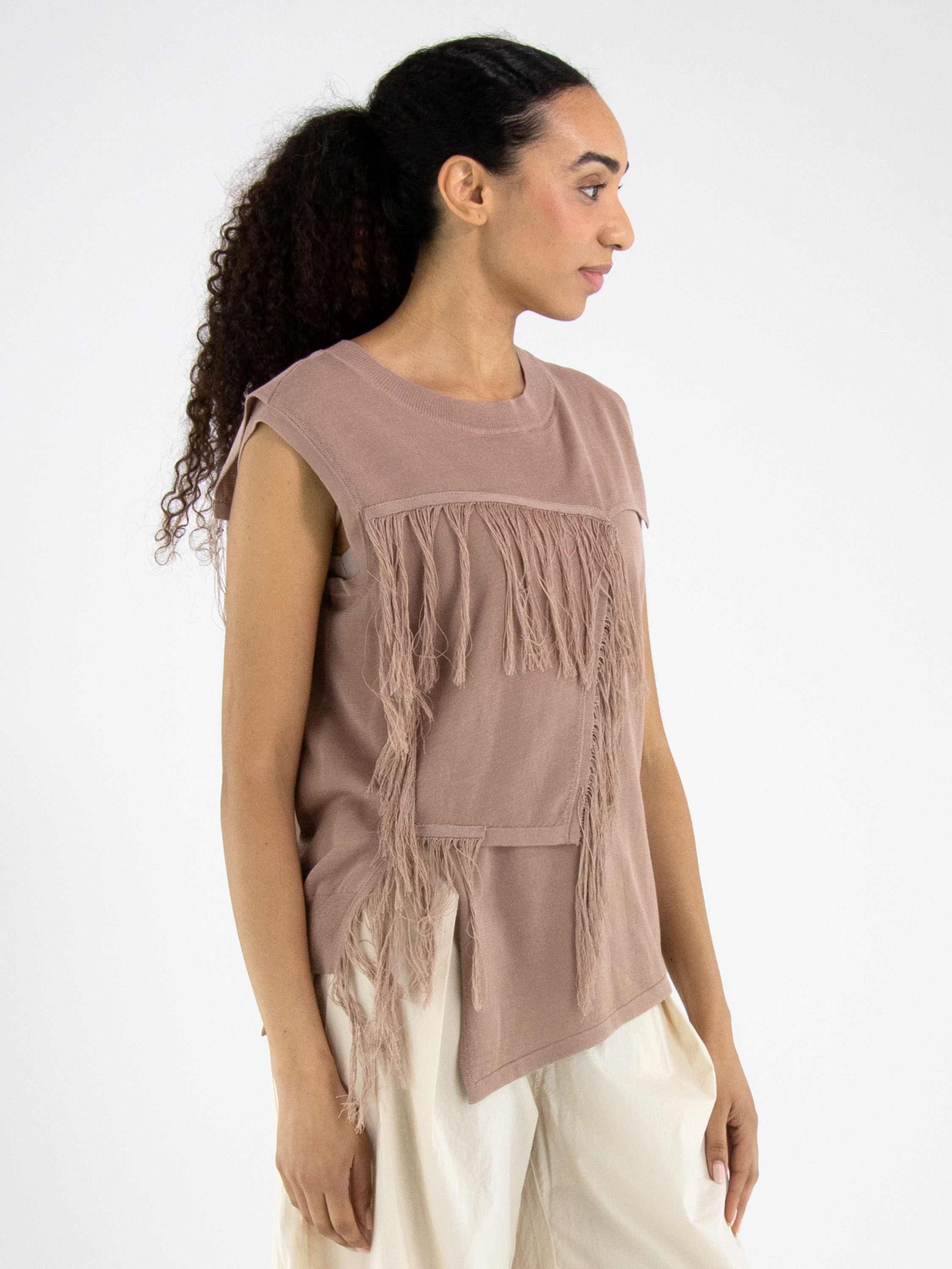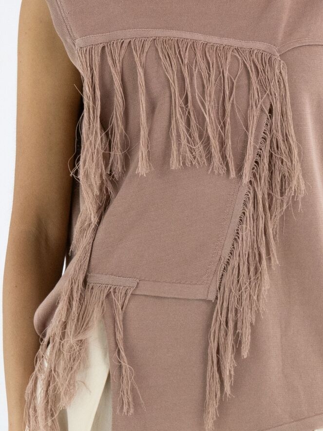 A sleeveless vest by High in mauve. At the back, a double layer of fabric extends to below the shoulder blades, finished with long fringes along the edge. At the front, a double layer is also applied up to the bust and continues down the left side to the waist. Here too, the edges are finished with long fringes. This vest can be hand-washed.