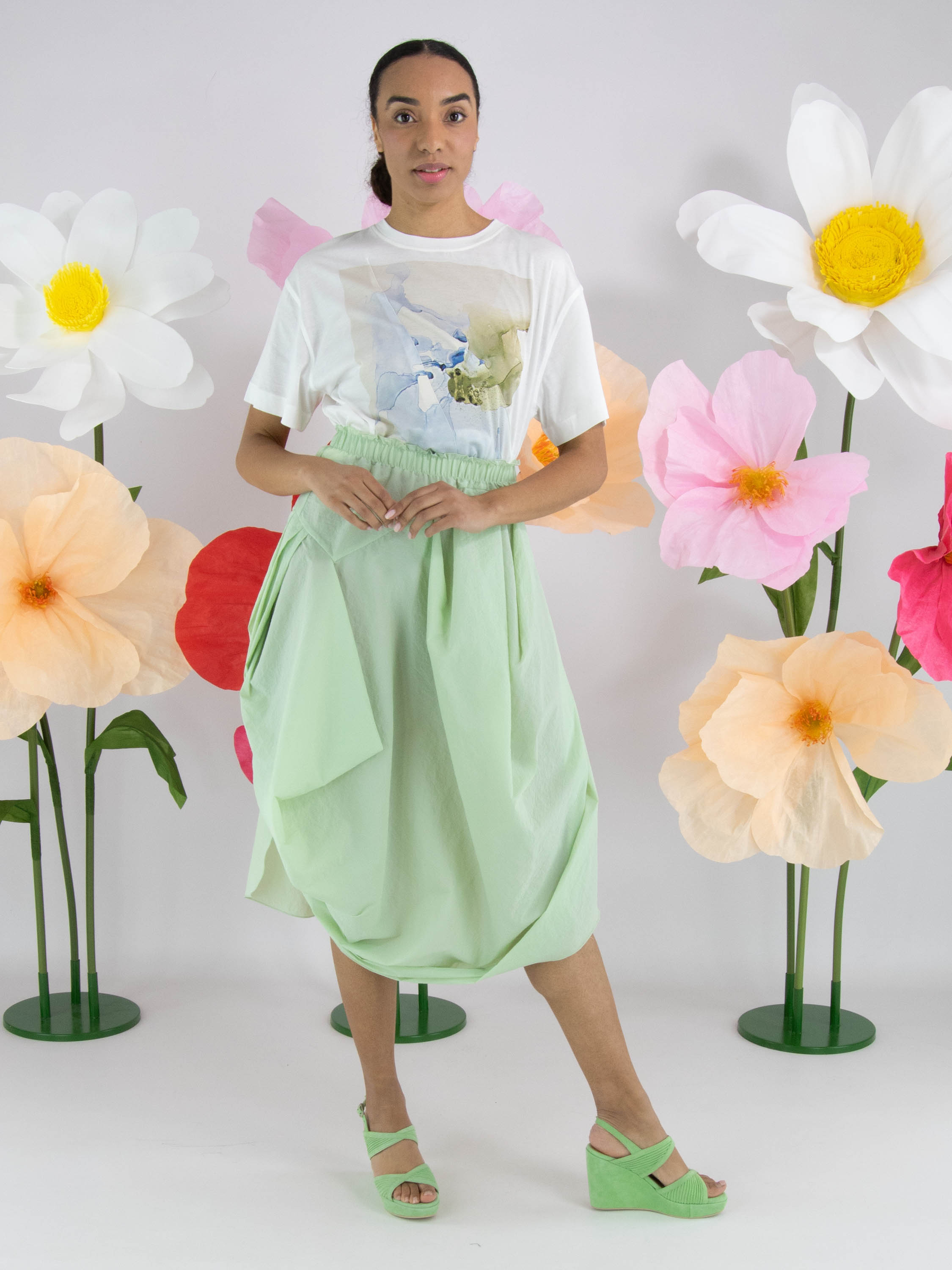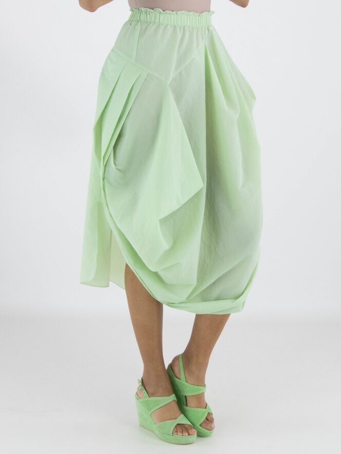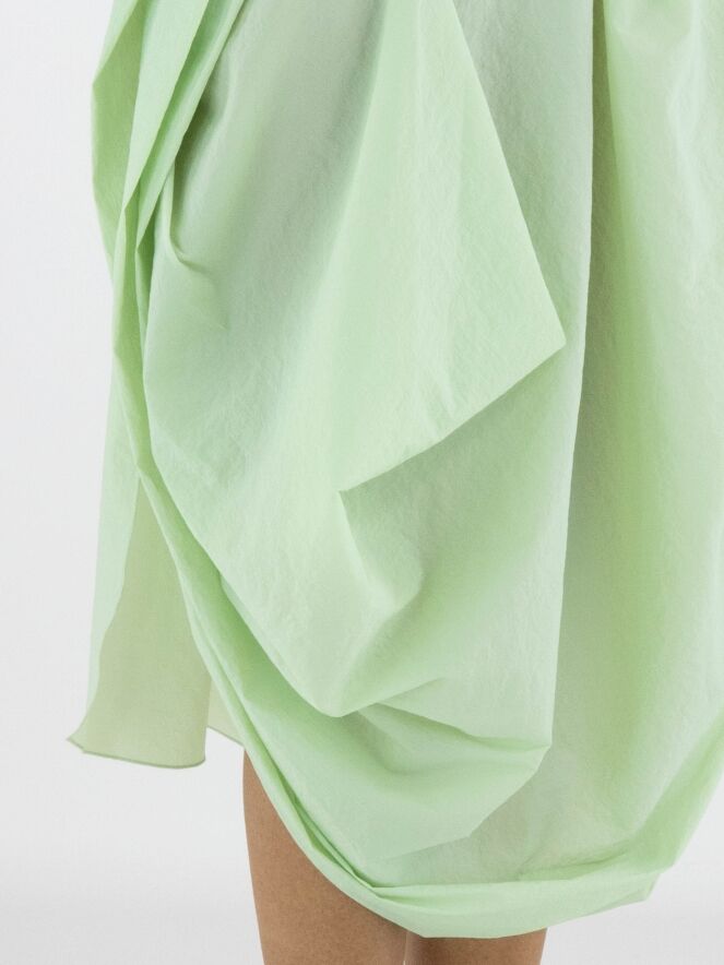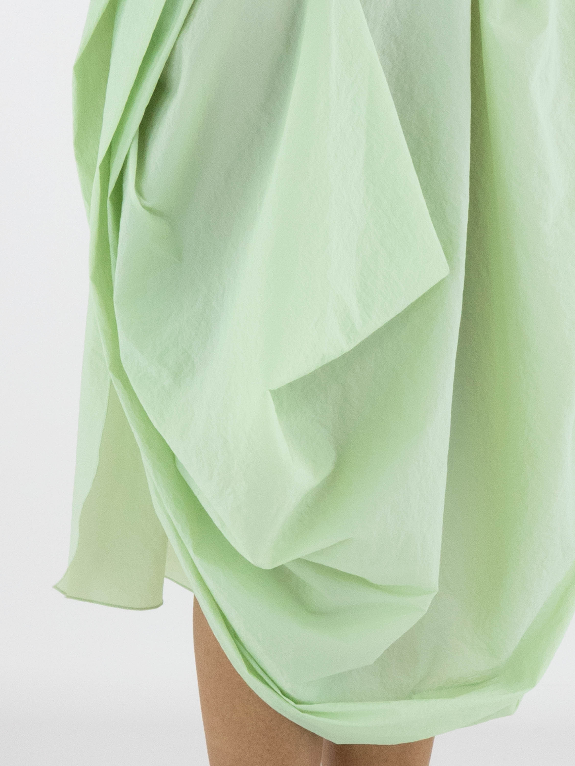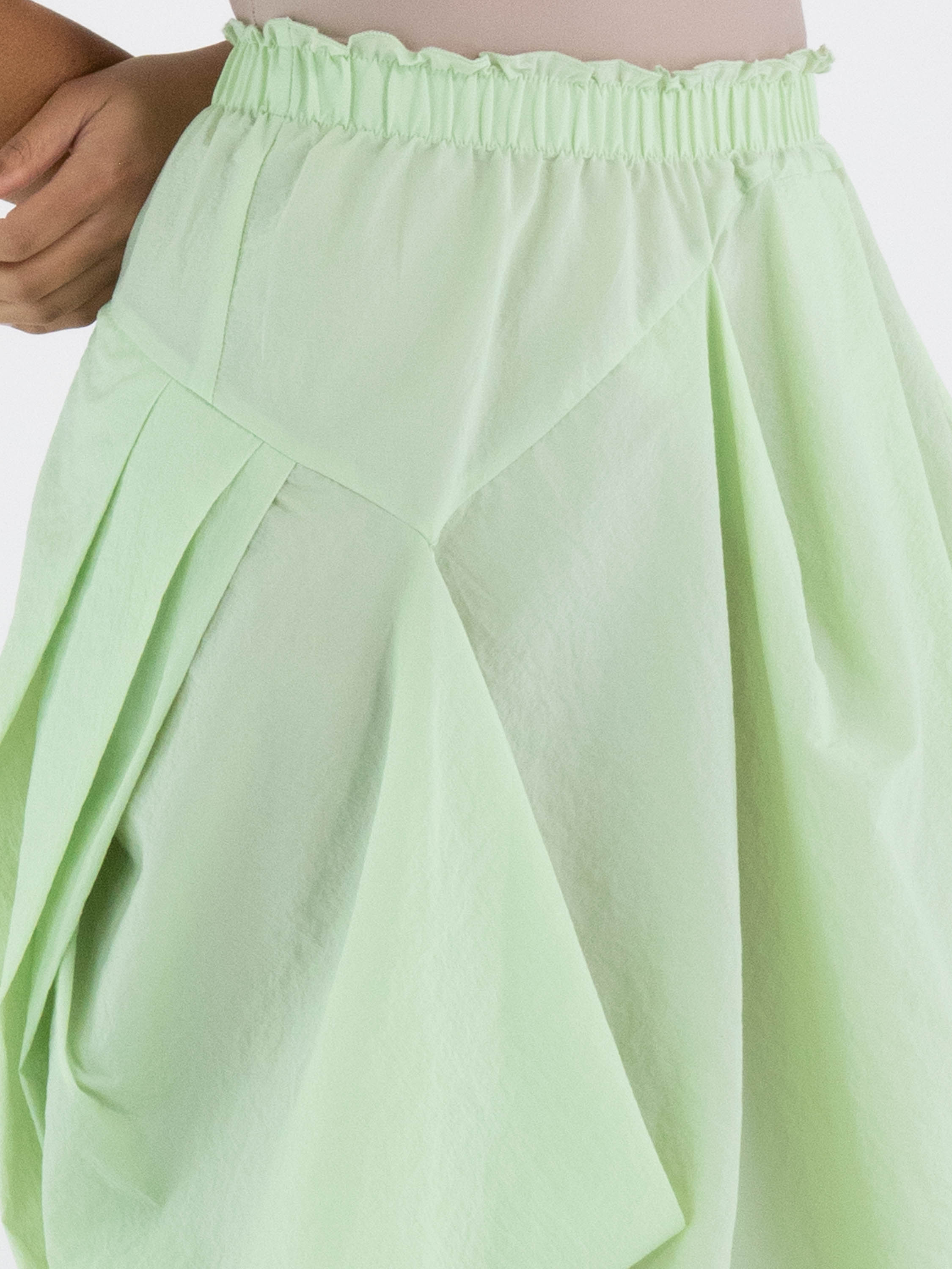 A skirt from High Lab made from a non-transparent parachute fabric in a soft mint green colour. The waistband features a finely pleated elastic band. The skirt has a balloon shape with multiple pleats, seams and diagonal pleated details. This skirt can be hand-washed.