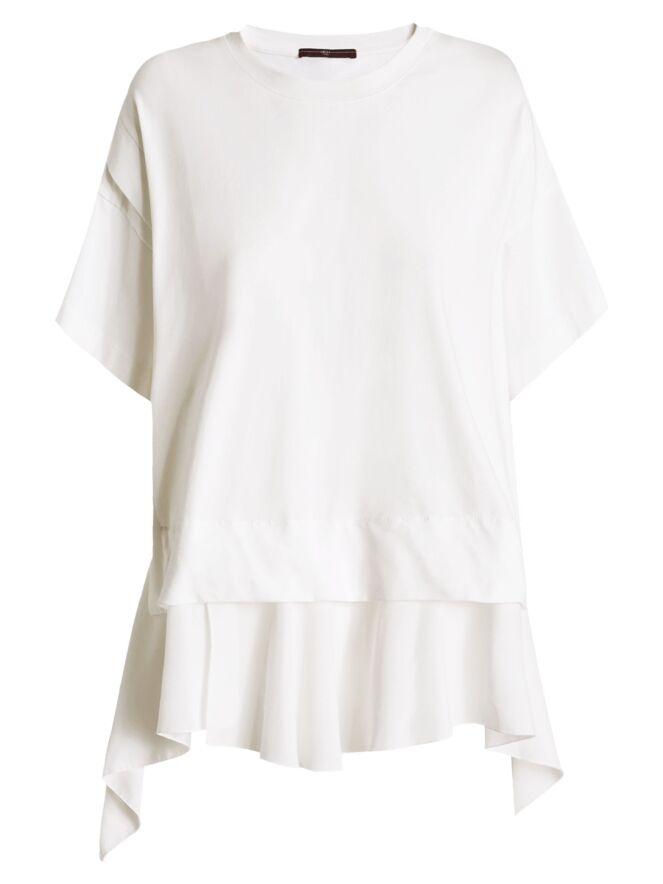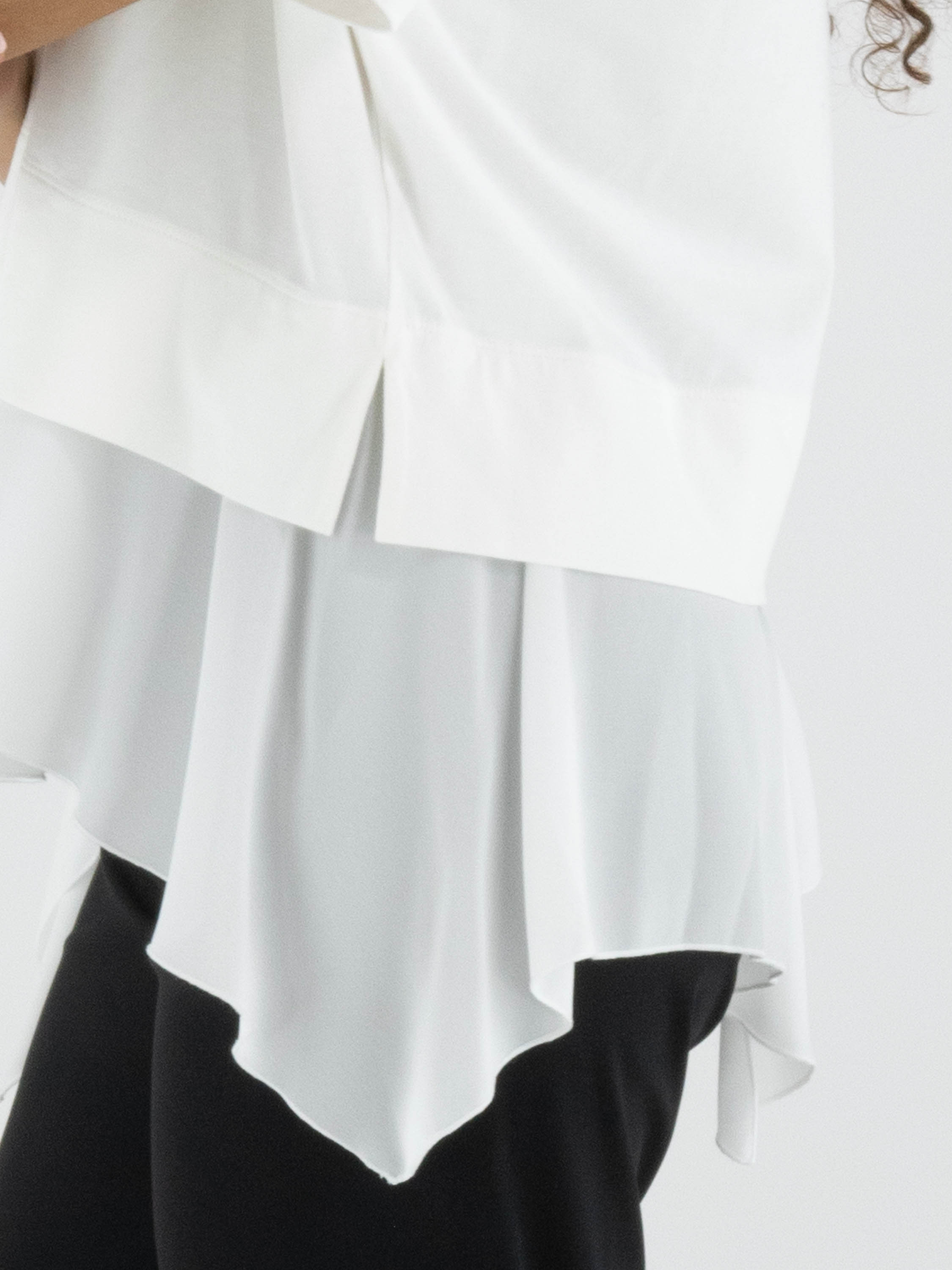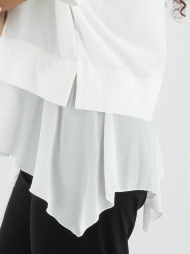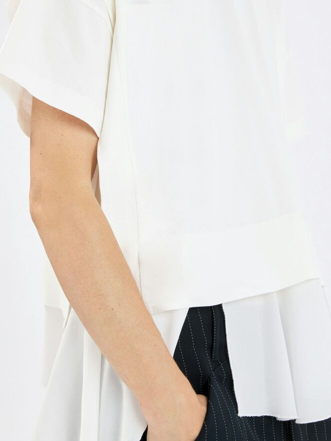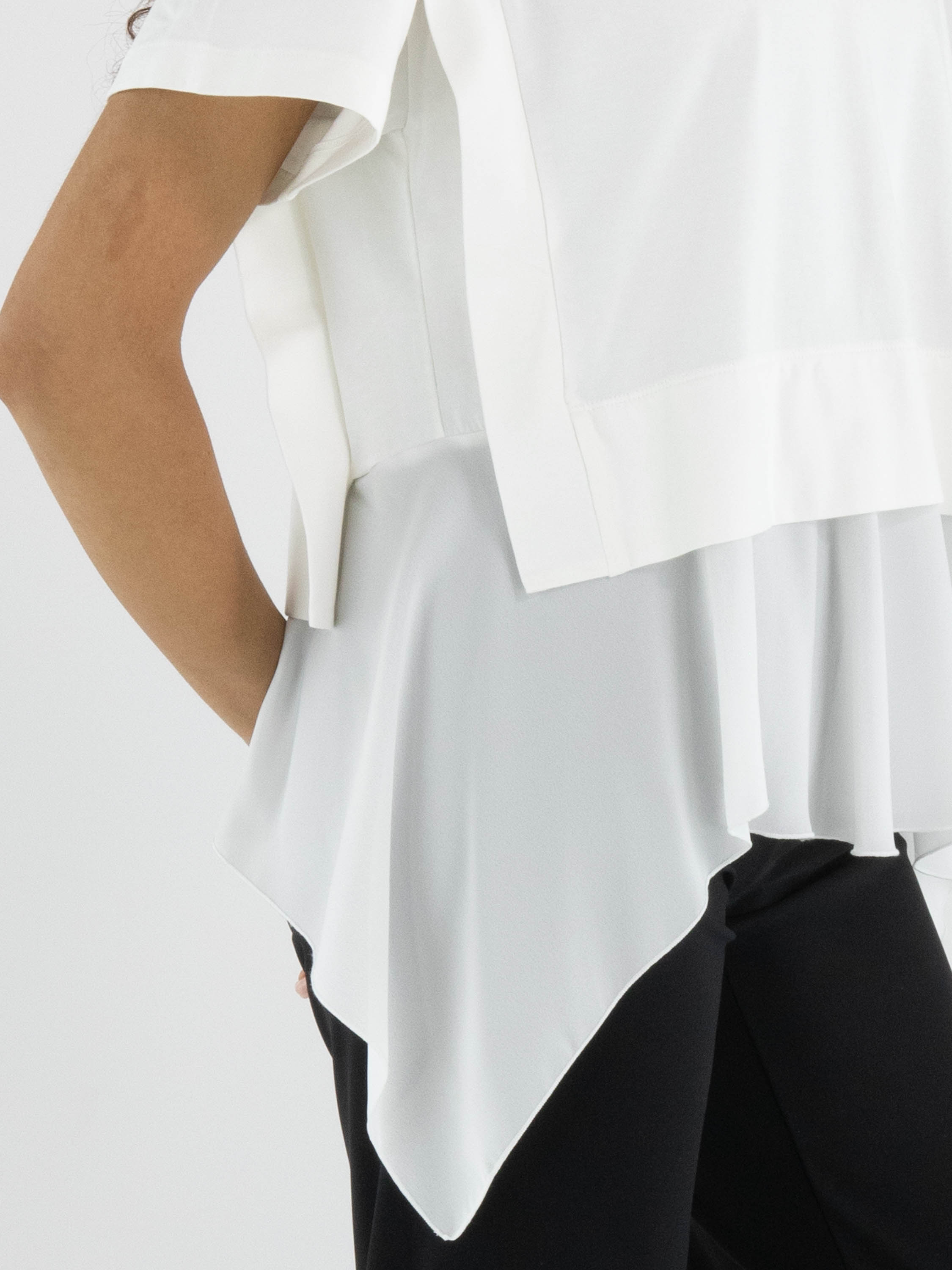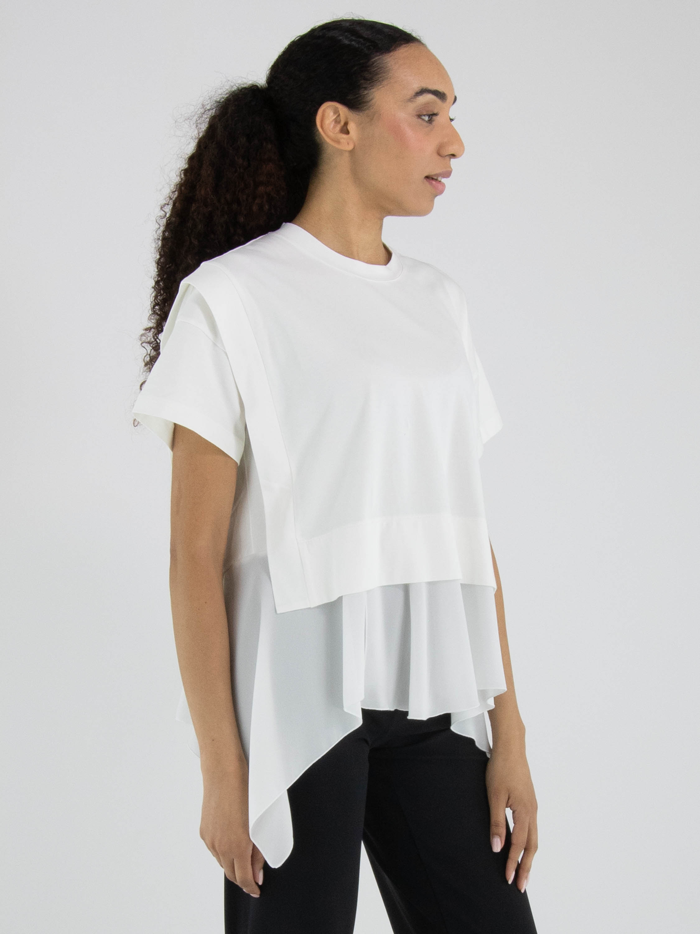 Shirt by High in off-white. Designed with a round neckline and short sleeves, it features a seam along the right side from which the fabric subtly extends, creating a playful and contemporary effect. At the hem, a rounded, pleated voile layer emerges, adding a refined and layered finish. This exclusive designer shirt should be hand-washed.