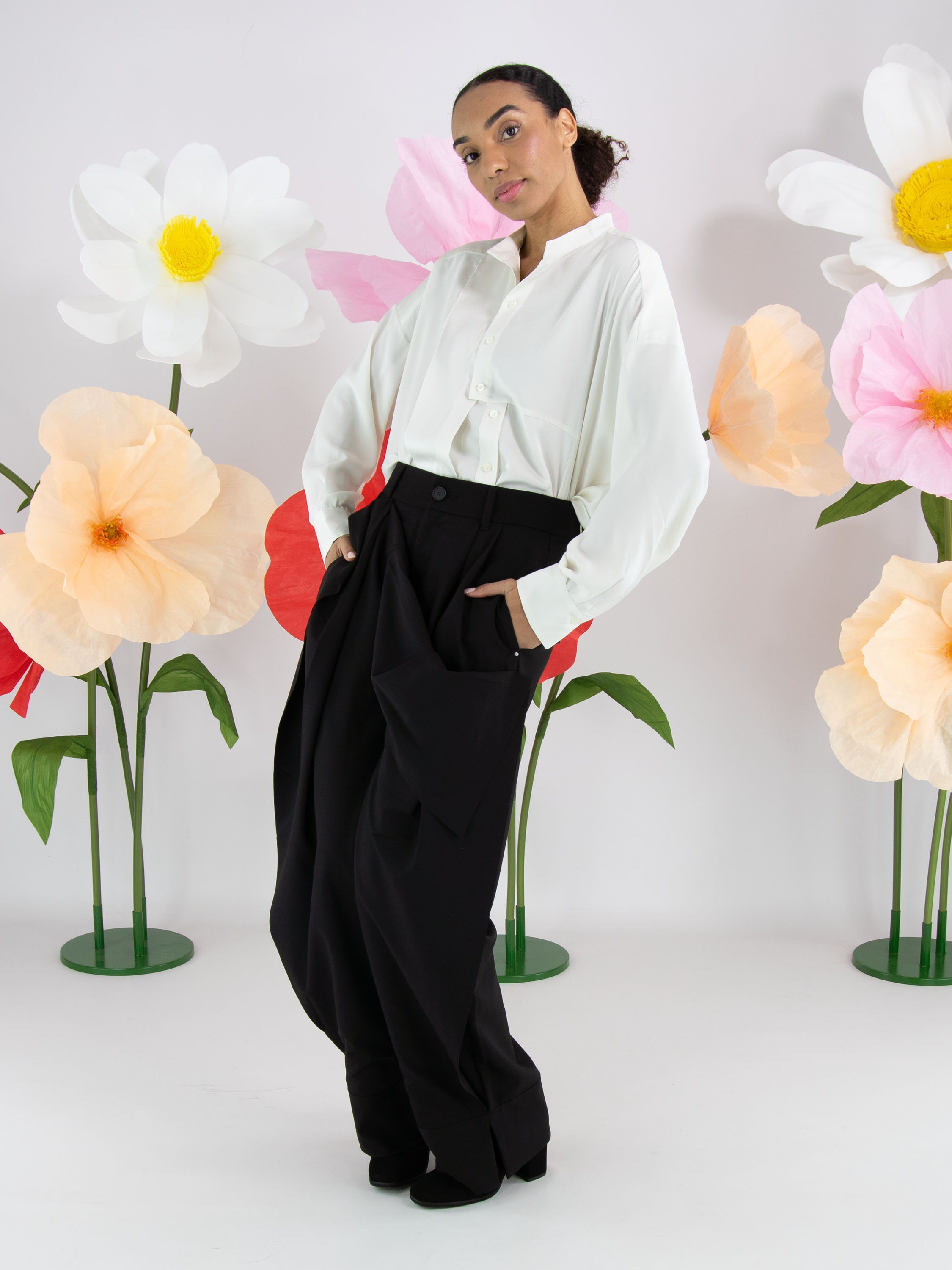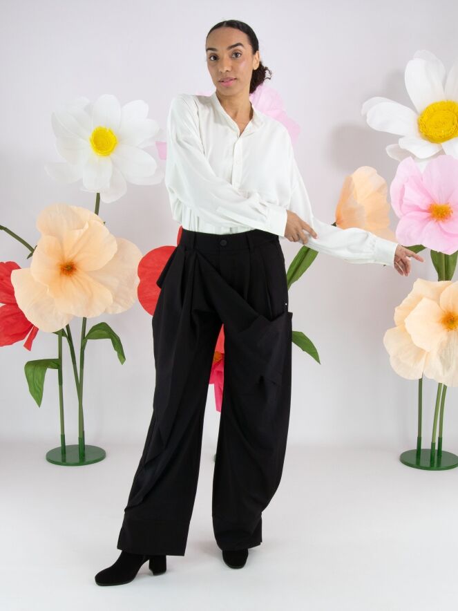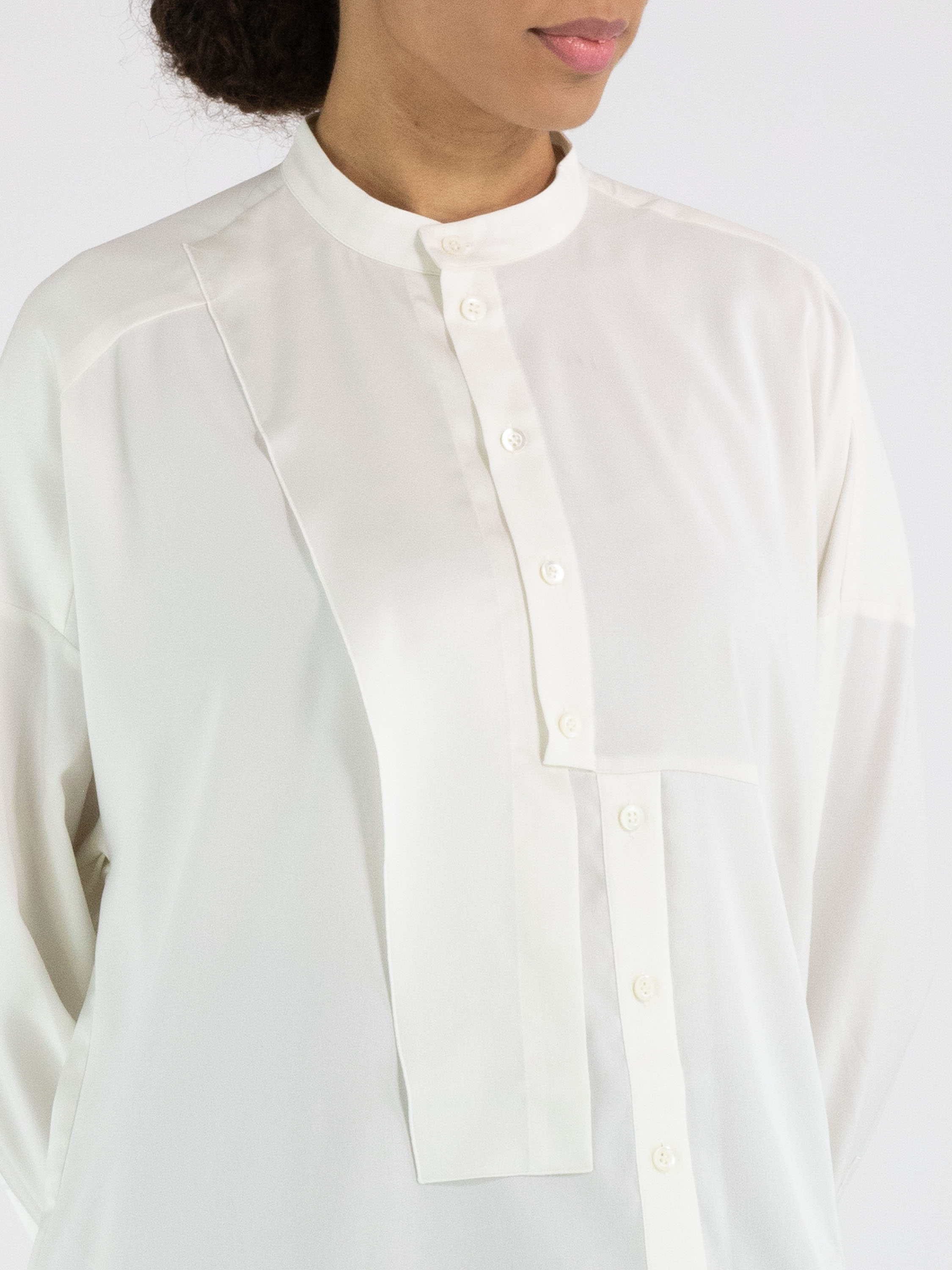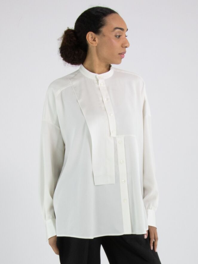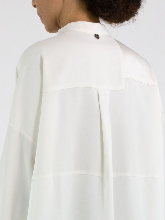 A blouse from High Tech in off-white. The fabric is partly matte and partly matte satin. From the neckline to below the bust, the button fastening is centred. Below the bust, the button fastening shifts a few centimetres to the right, meaning the blouse cannot be fully opened. Along the edges of the cuffs of the long sleeves, the fabric is pleated. This blouse can be hand-washed.