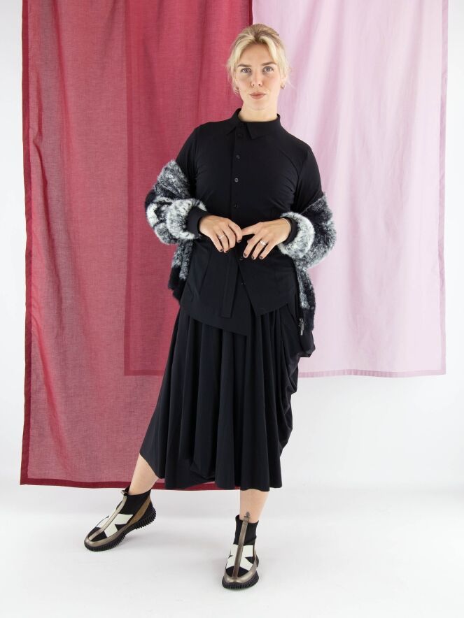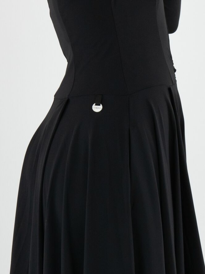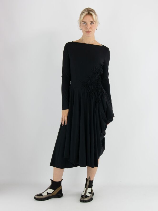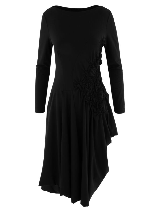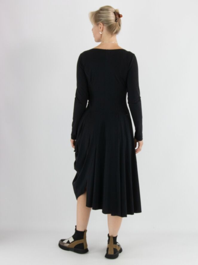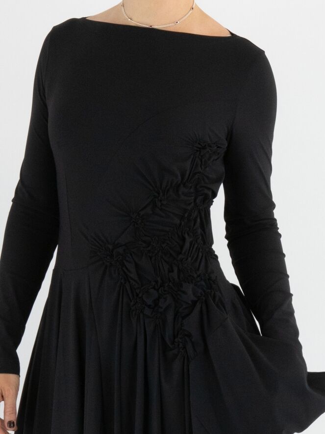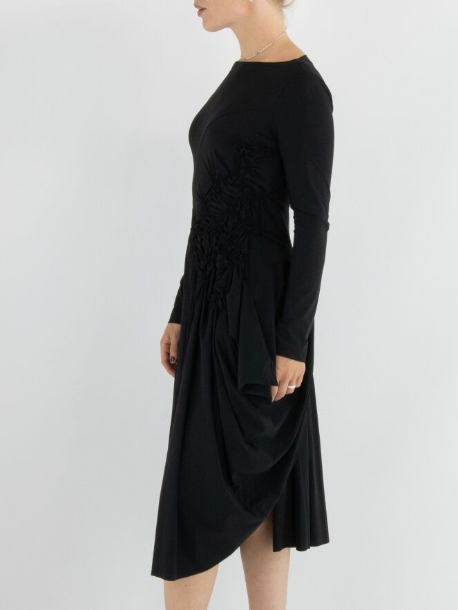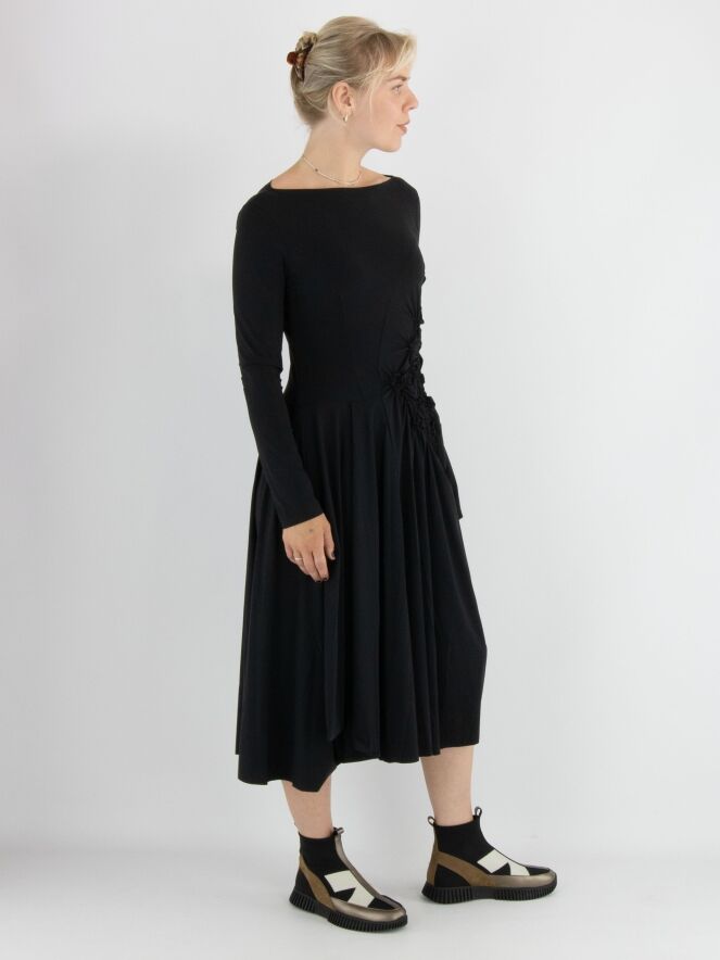 A dress by High in black. The dress features a round neckline and long sleeves. From the left armhole to the waist, the fabric is ruched. Beneath this ruched section, there is a side pocket at waist height. At the back, several pleats from the waist add extra volume. The dress flares out from the waist. This dress should be hand washed.