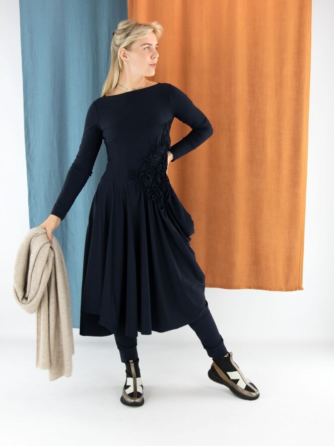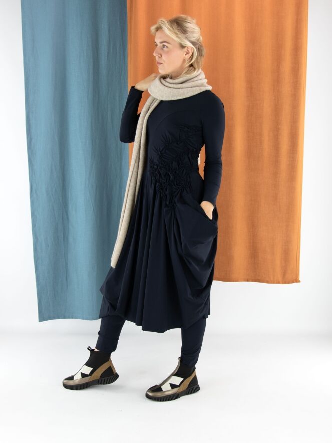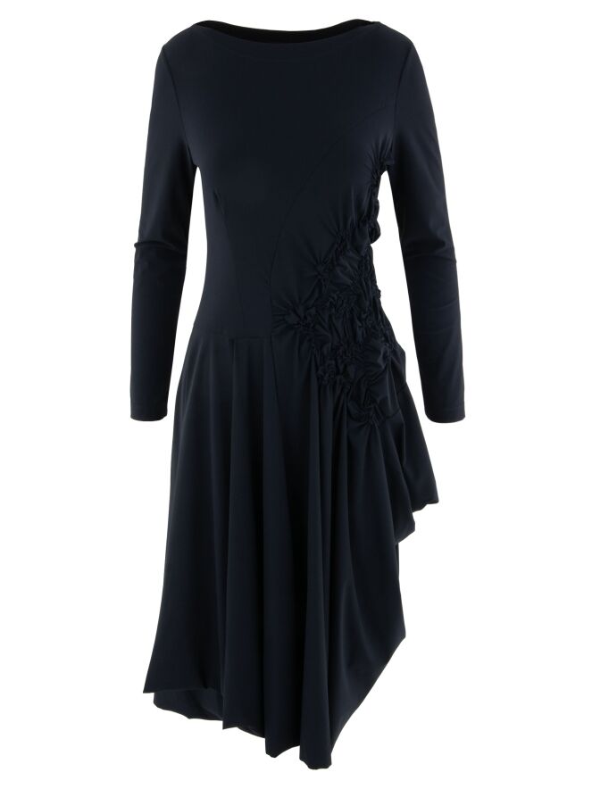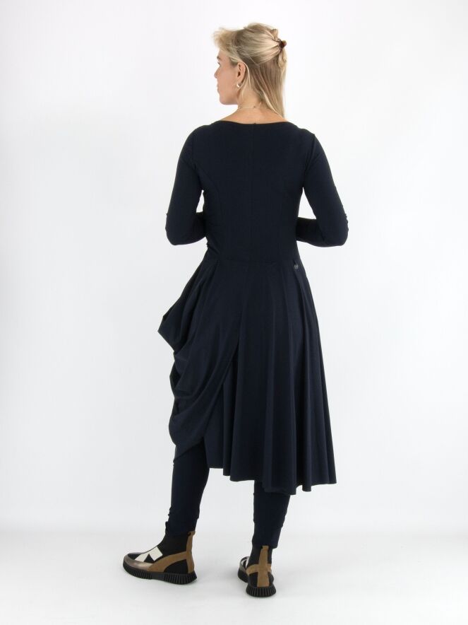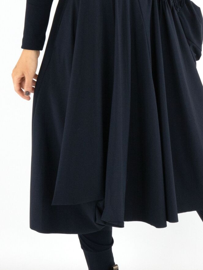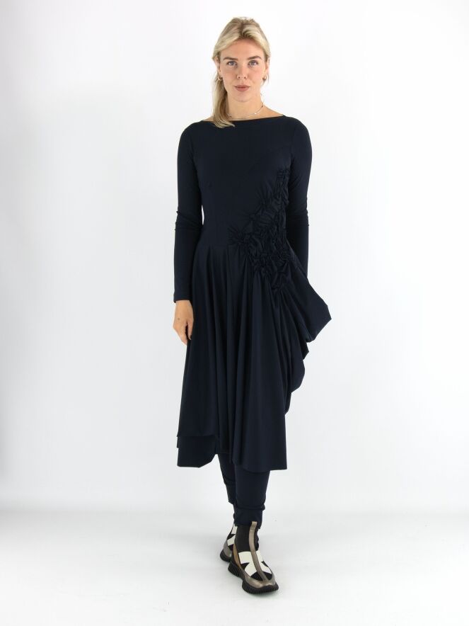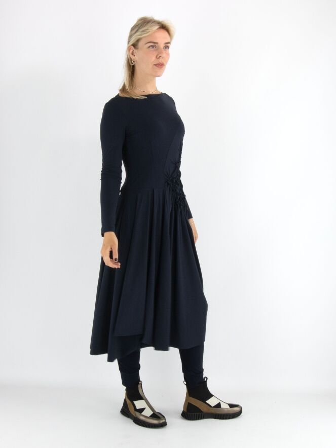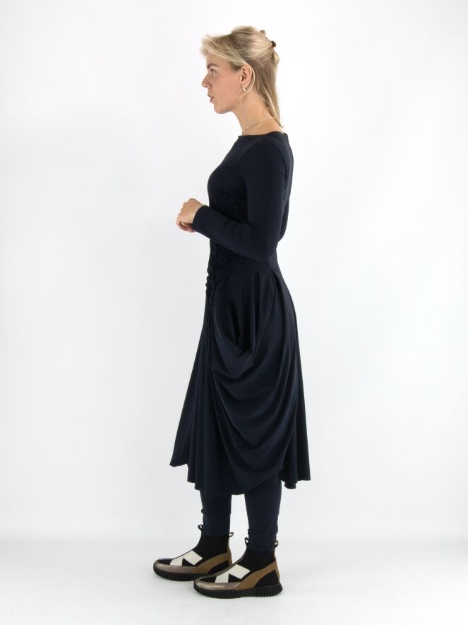 Dress by High in navy blue. It features a round neckline and long sleeves. From the left sleeve seam to the waist, the fabric is ruched. Beneath the ruched detail, there is a side pocket at the waist. At the back, a few pleats from the waist add volume. The dress flares out from the waist. It should be hand-washed.
