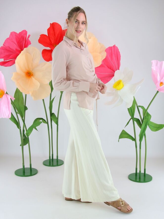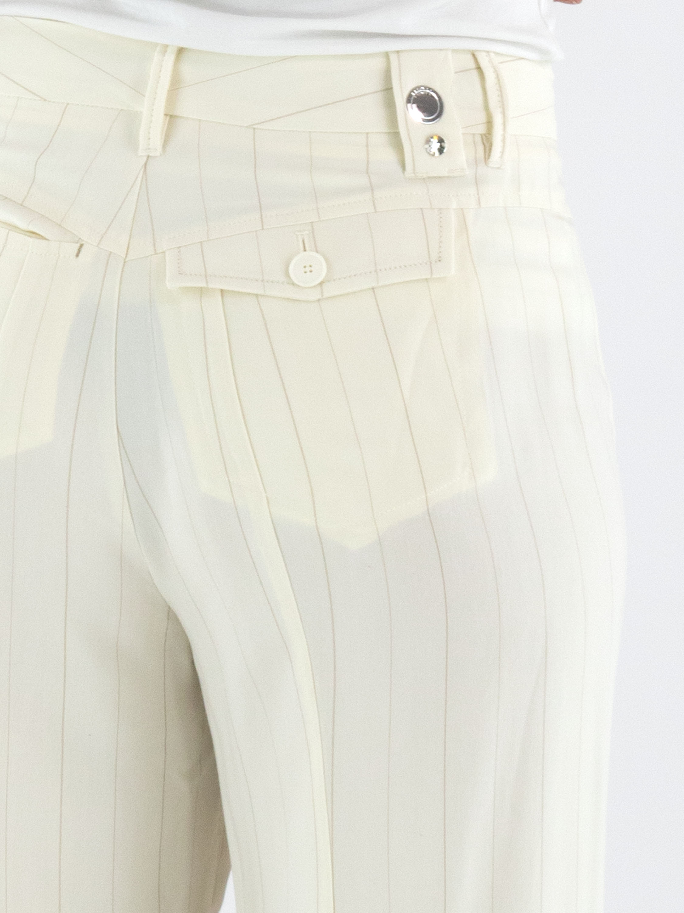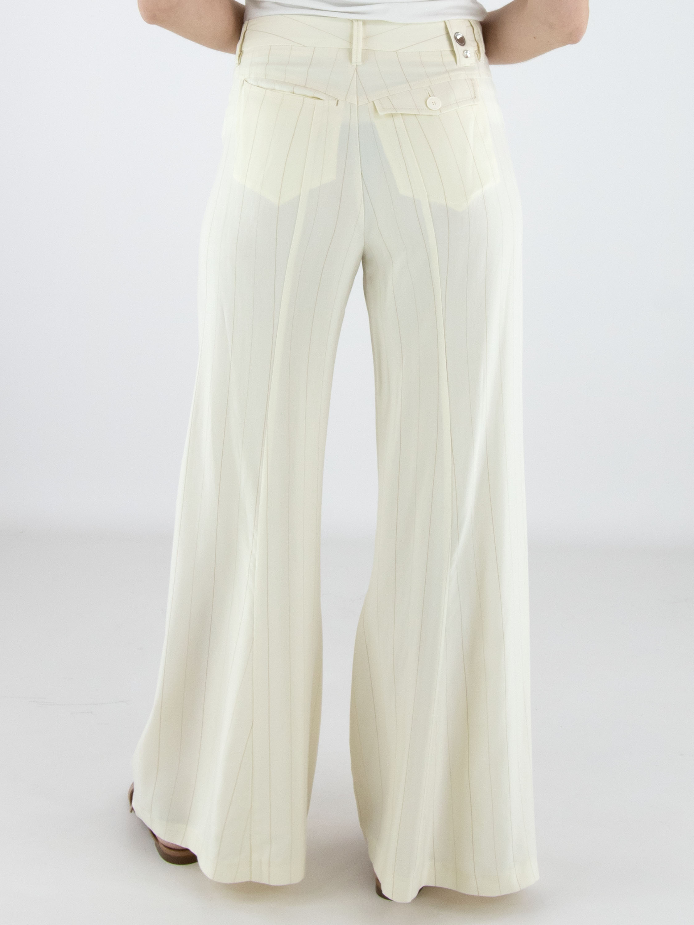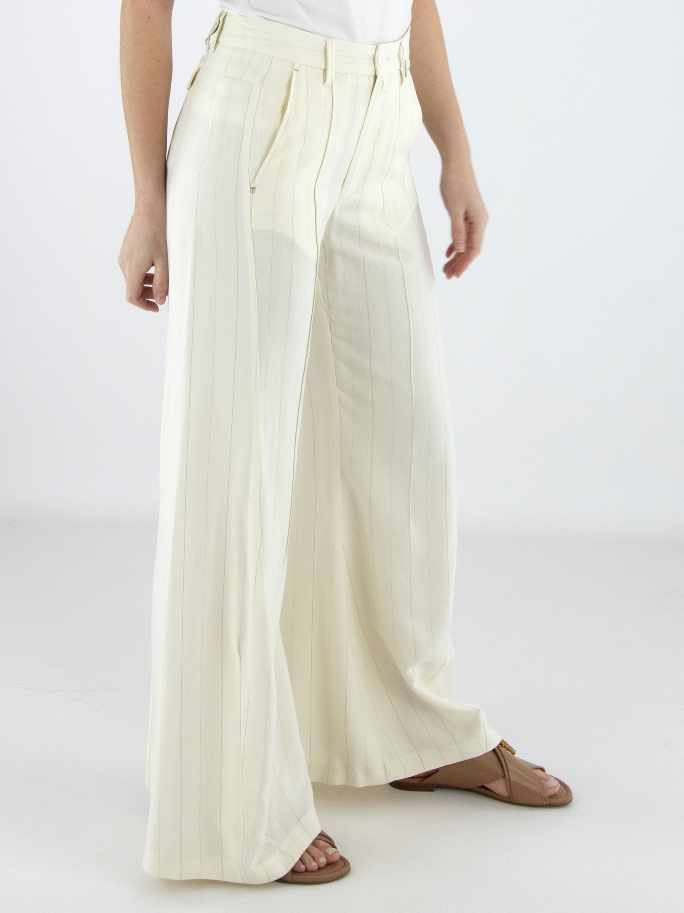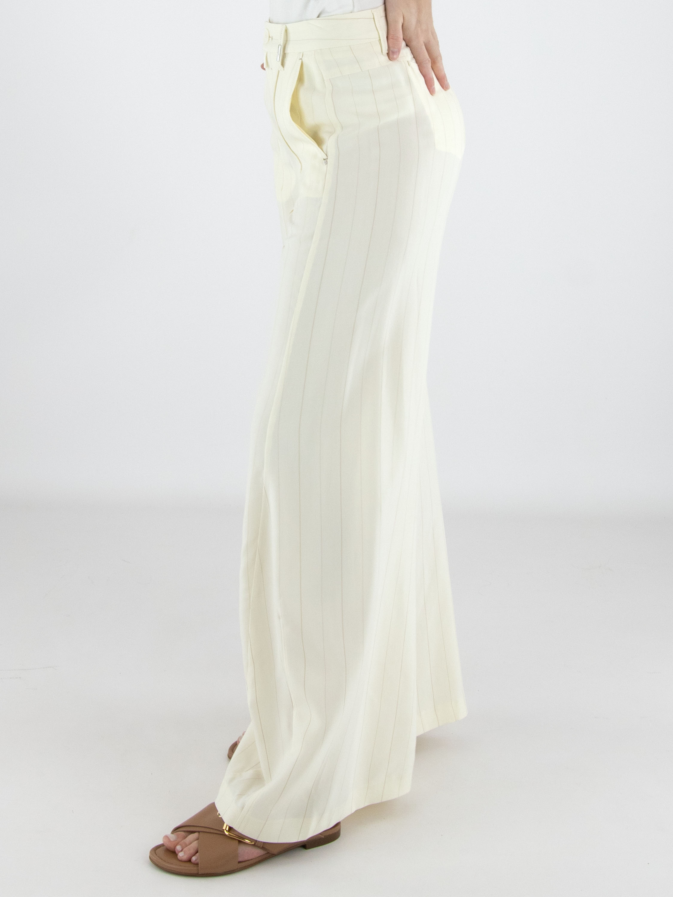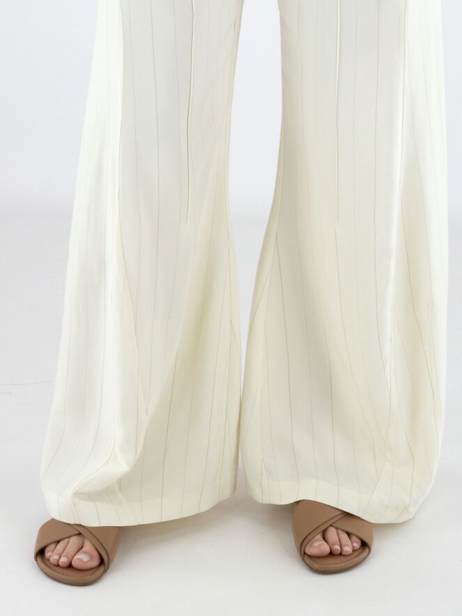 Wide-leg trousers by High in a refined pinstripe pattern in off-white and camel. The legs fall into a subtle flared silhouette, creating a feminine and contemporary look. Featuring side pockets, these exclusive designer trousers should not be washed.
