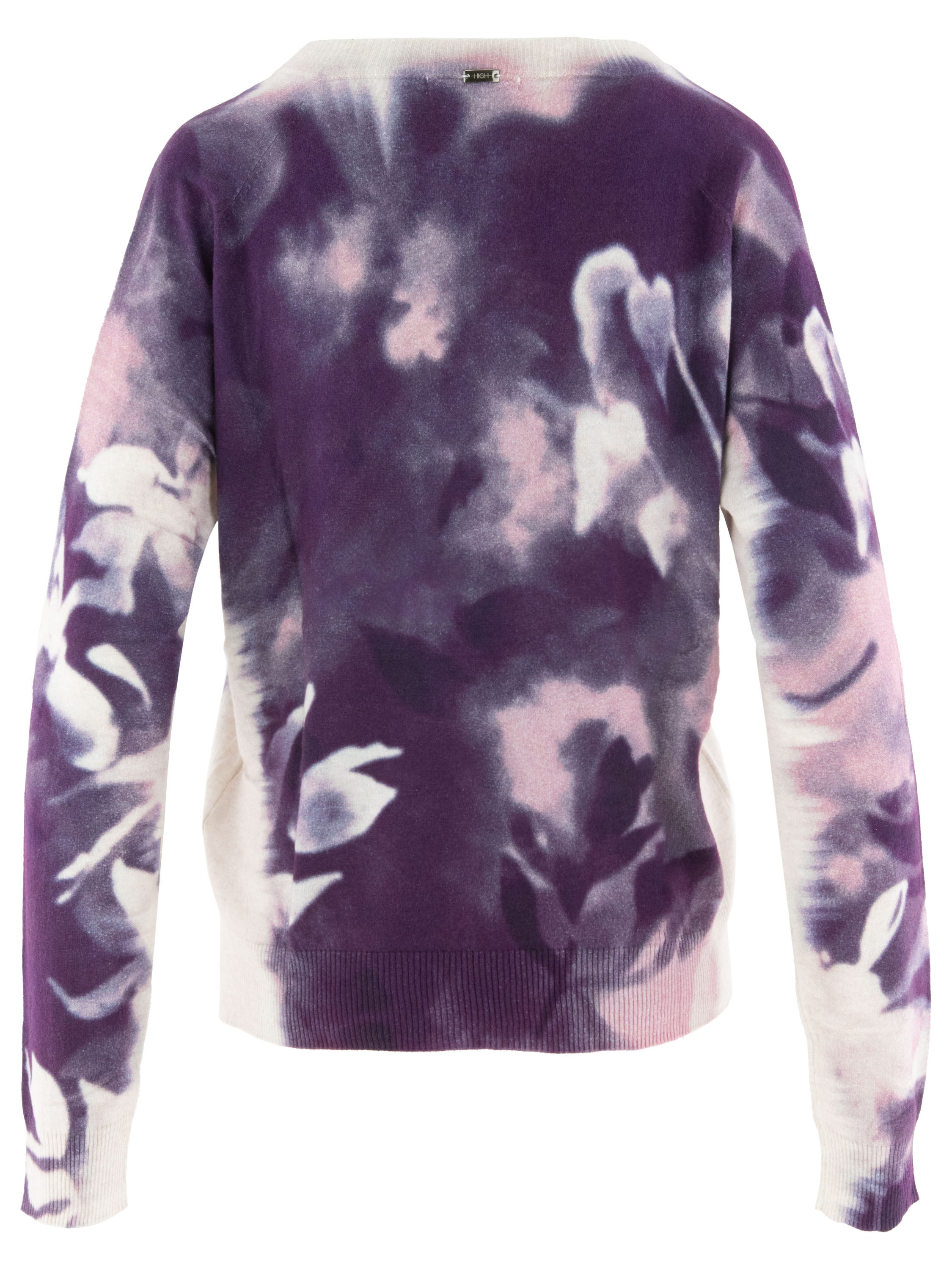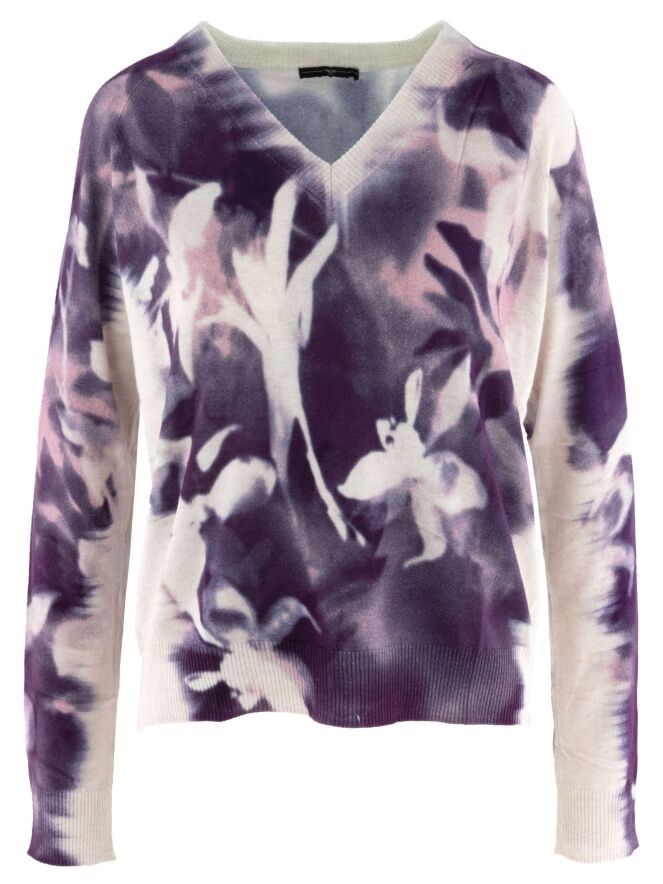 A pullover by High featuring a graphic floral print in various shades of purple and lilac on a cream-white background. The pullover has a V-neckline finished with a finely ribbed knit trim along the edge. This pullover can be hand-washed.