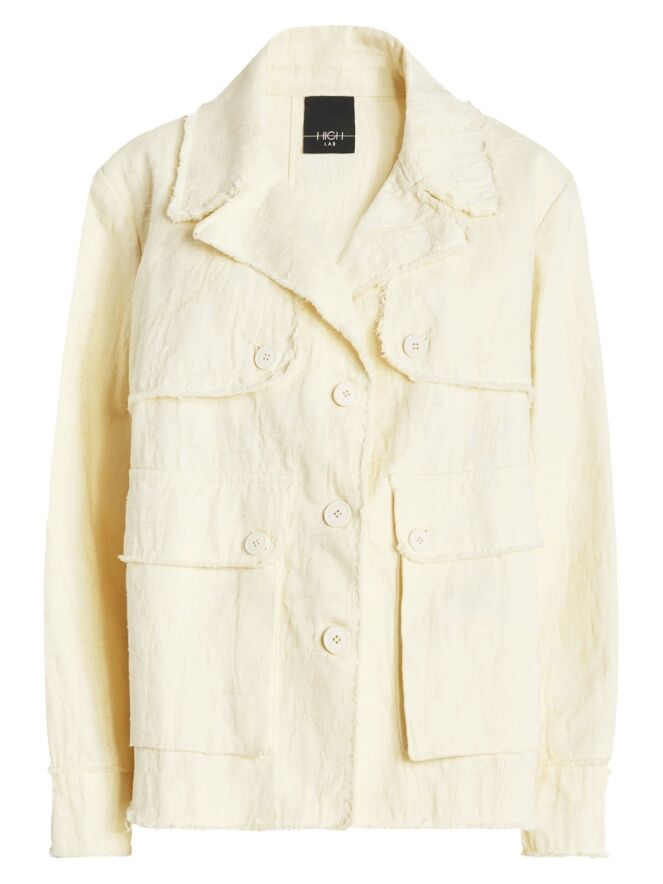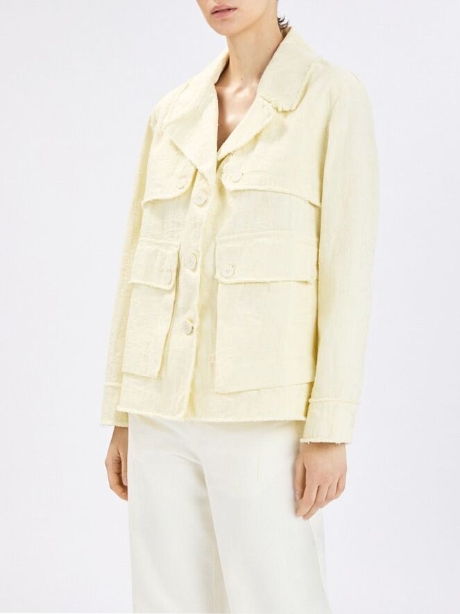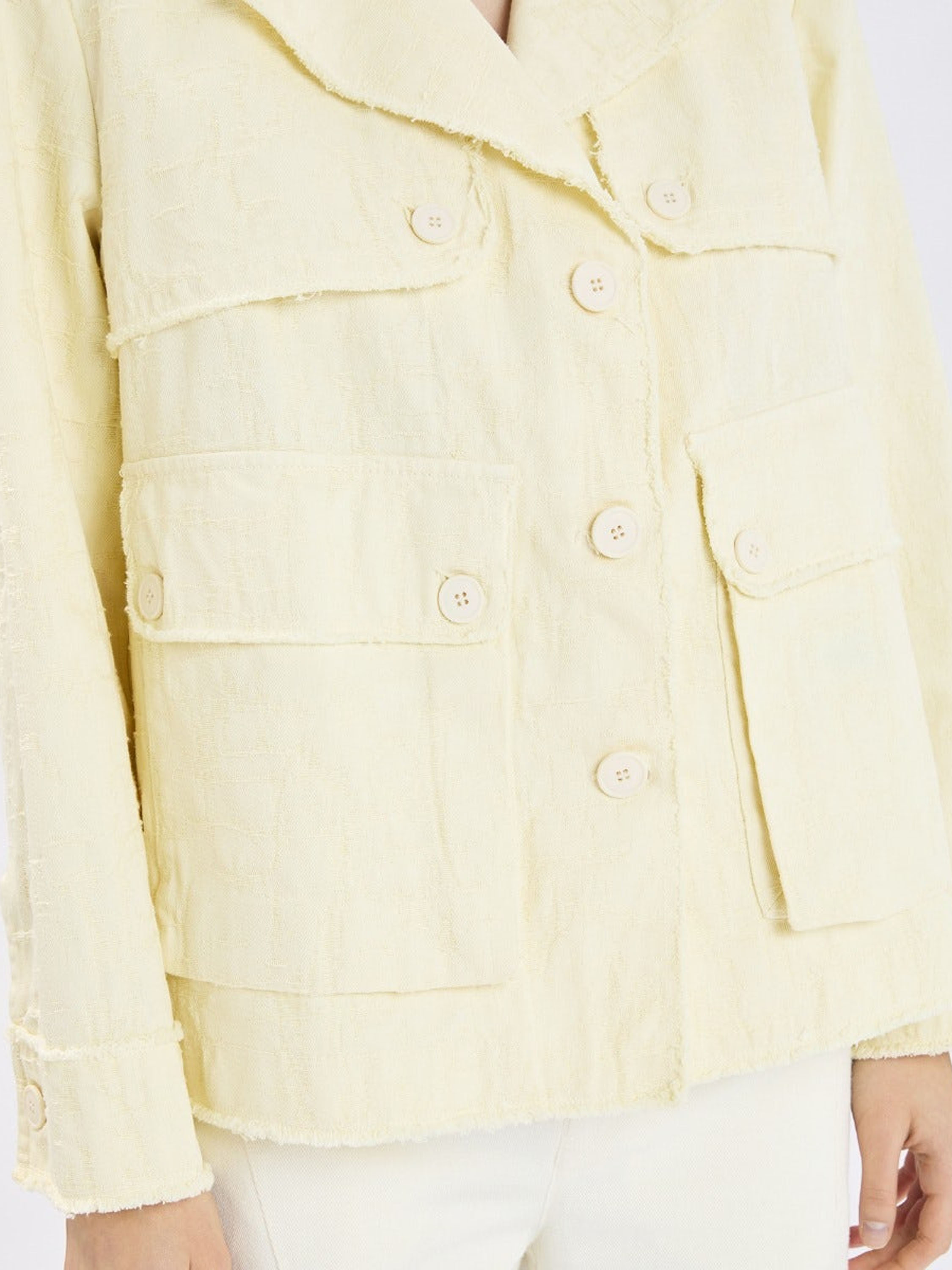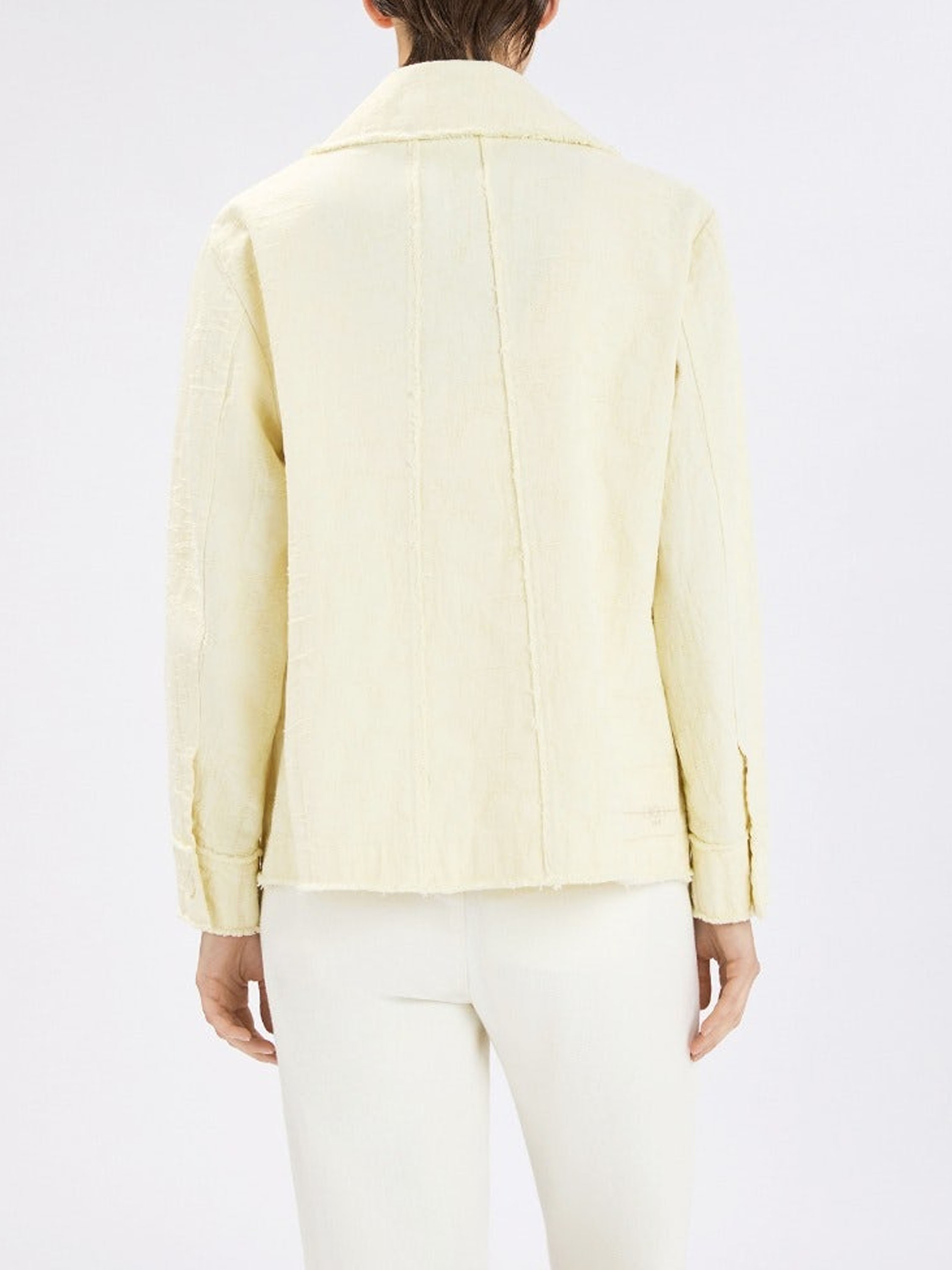 An oversized blazer by High in a pastel yellow shade. The fabric features a visible texture with a gabardine look. All fabric edges are delicately frayed. The blazer has a three-button closure with cream-white buttons, which are also repeated on the chest pockets and as a decorative detail on the gabardine. This blazer can be washed at 30 degrees.