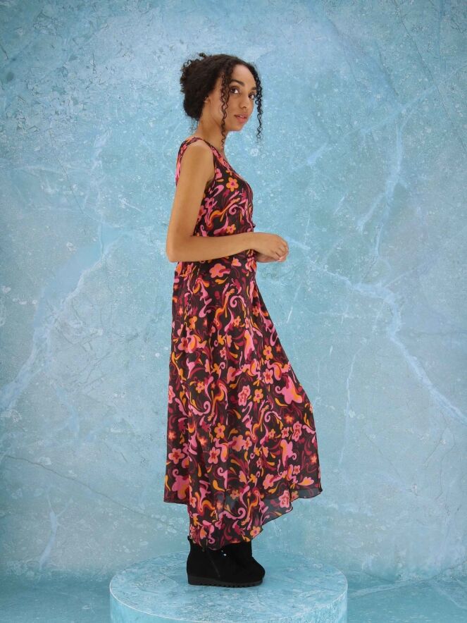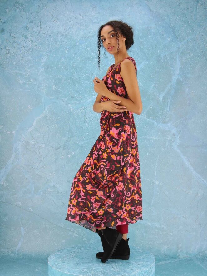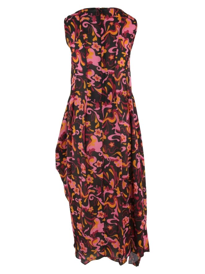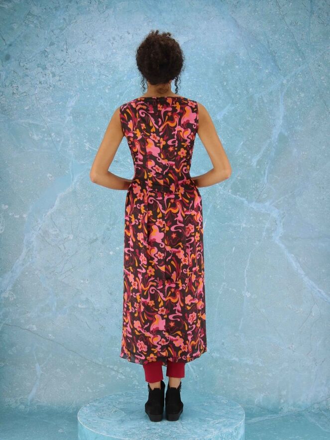 A dress from High in a wavy pop art print with the colors black, fuchsia, orange and pink. To the left of the middle, at the height of the waist, there is a vertical cord in the fabric with which a pleat effect can be created. There are side pockets at the waist and the dress has a balloon effect from the waist. this dress can be hand washed.