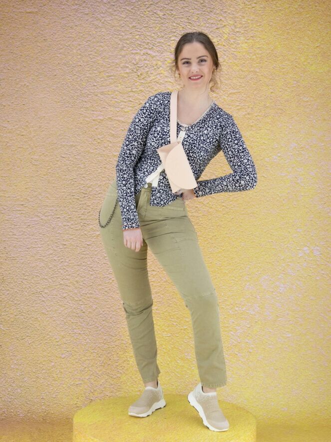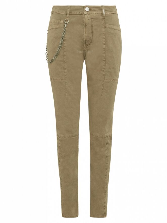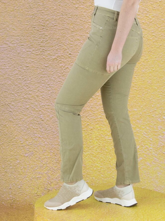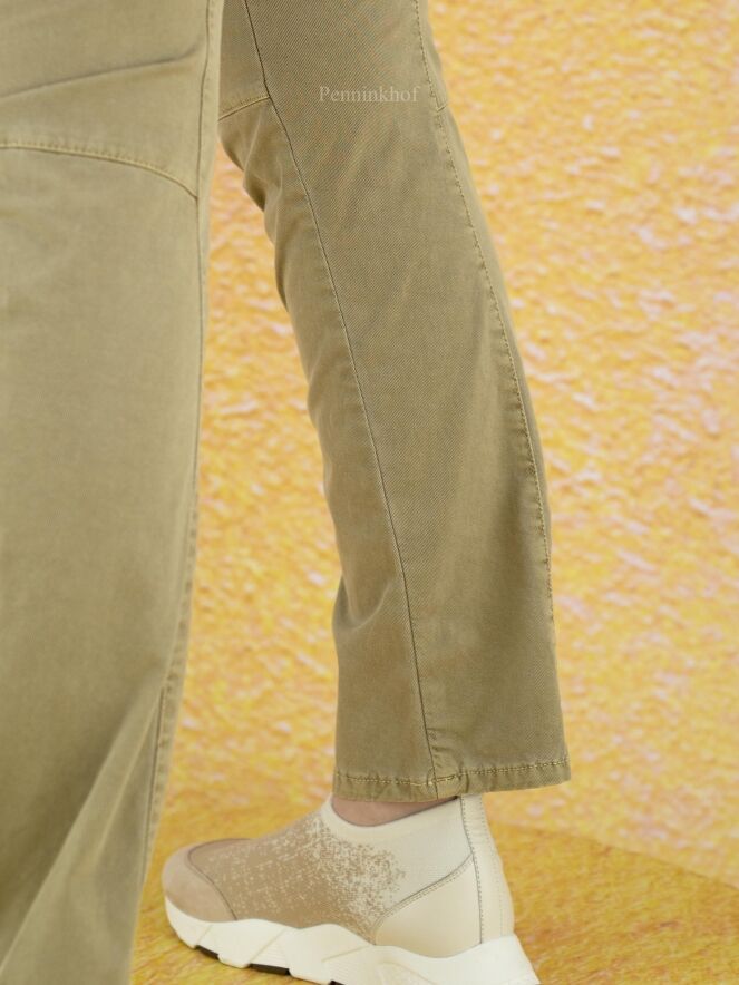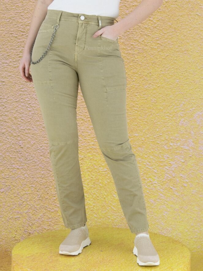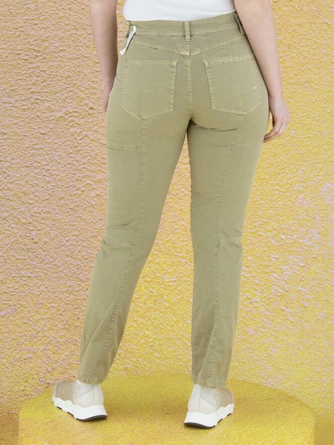 High jeans in a taupe color. The jeans have multiple horizontal and vertical stitching seams. The jeans are in a 5 pocket model and can be washed at 30 degrees.