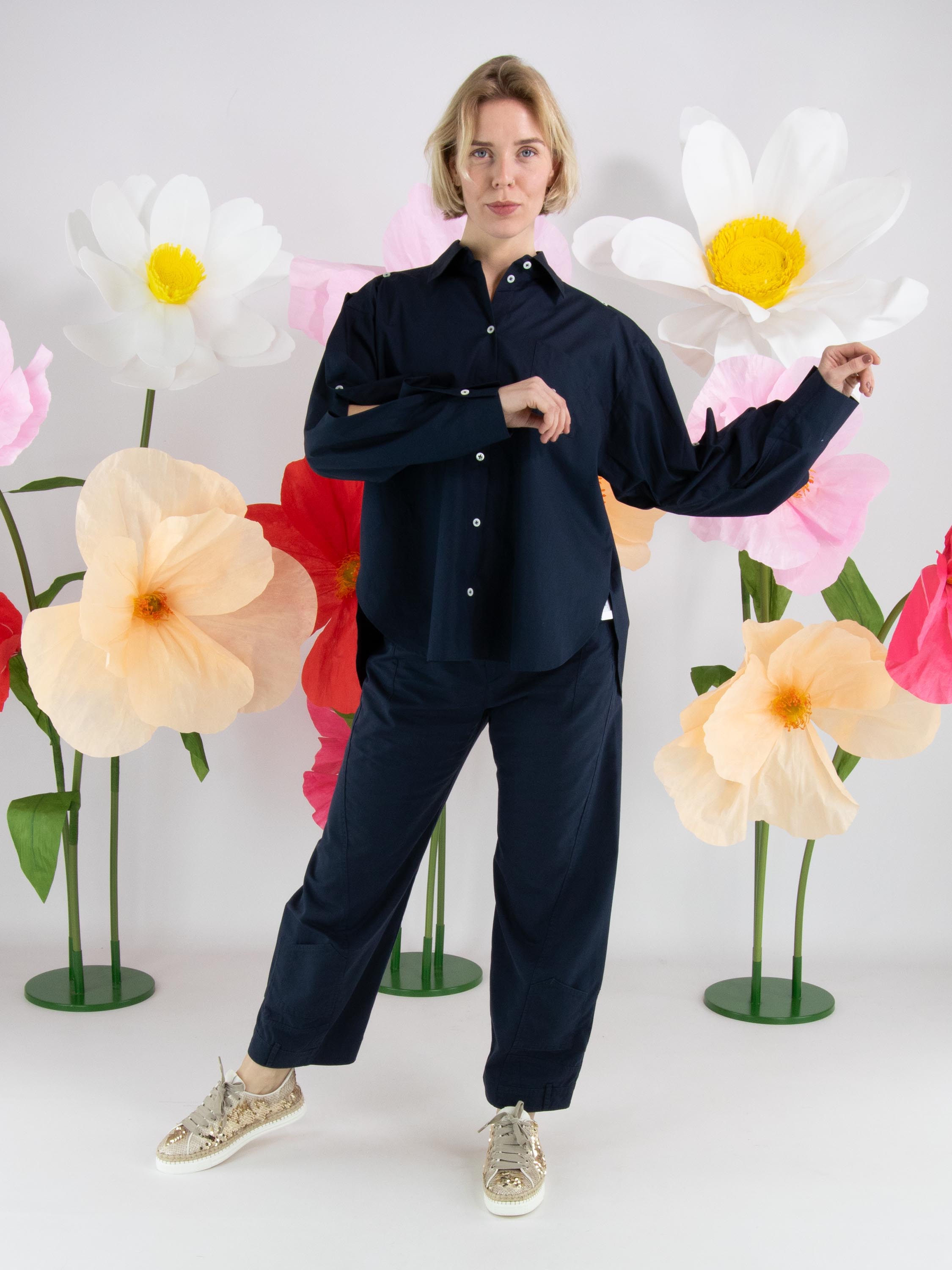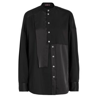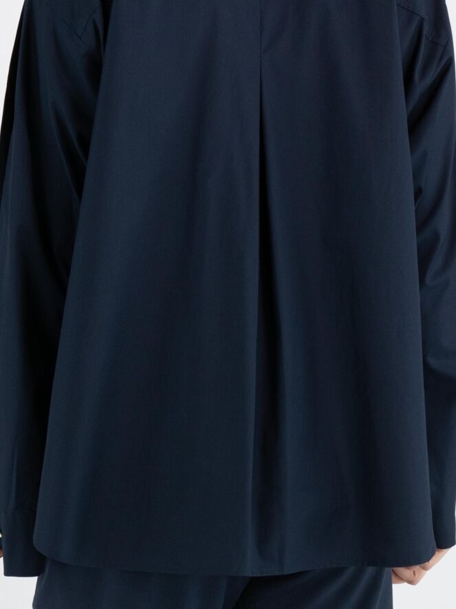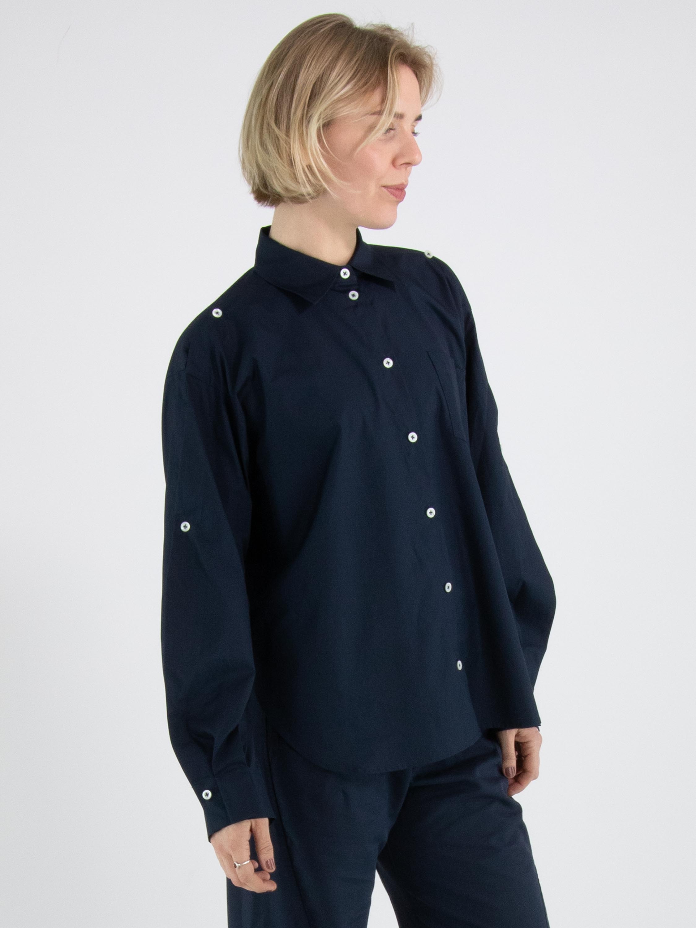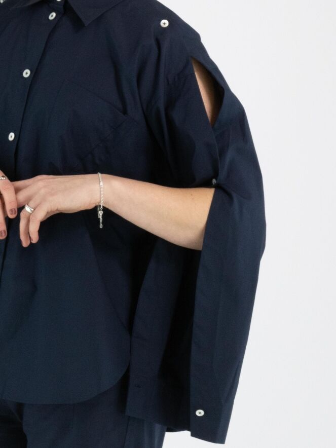 A blouse from High in a midnight blue colour. The chest pocket features a double asymmetric seam. The upper part of the long sleeves is open from the shoulder and partially closed with button fastenings. This blouse can be hand-washed.