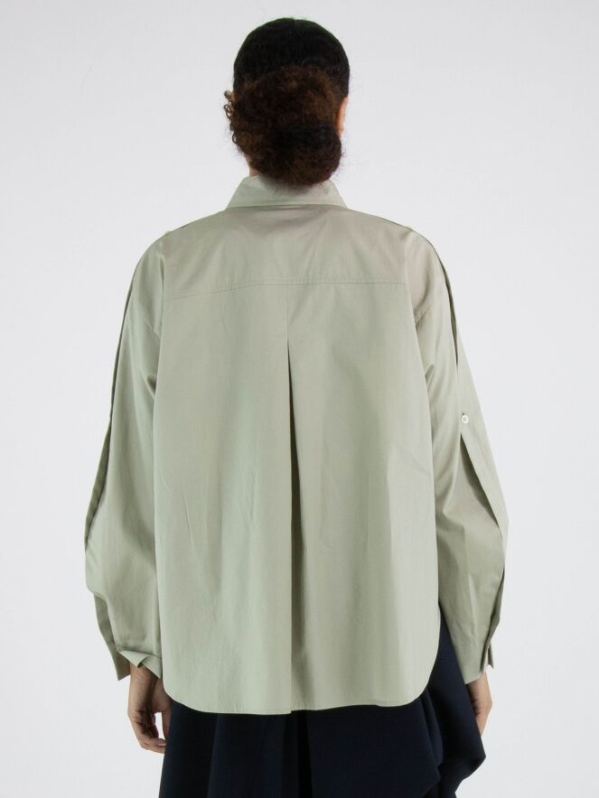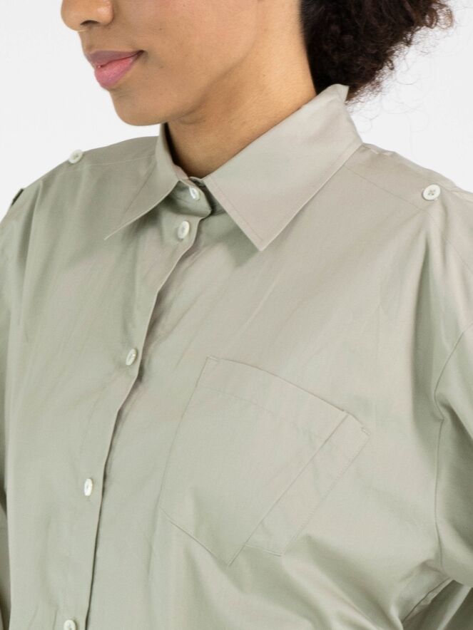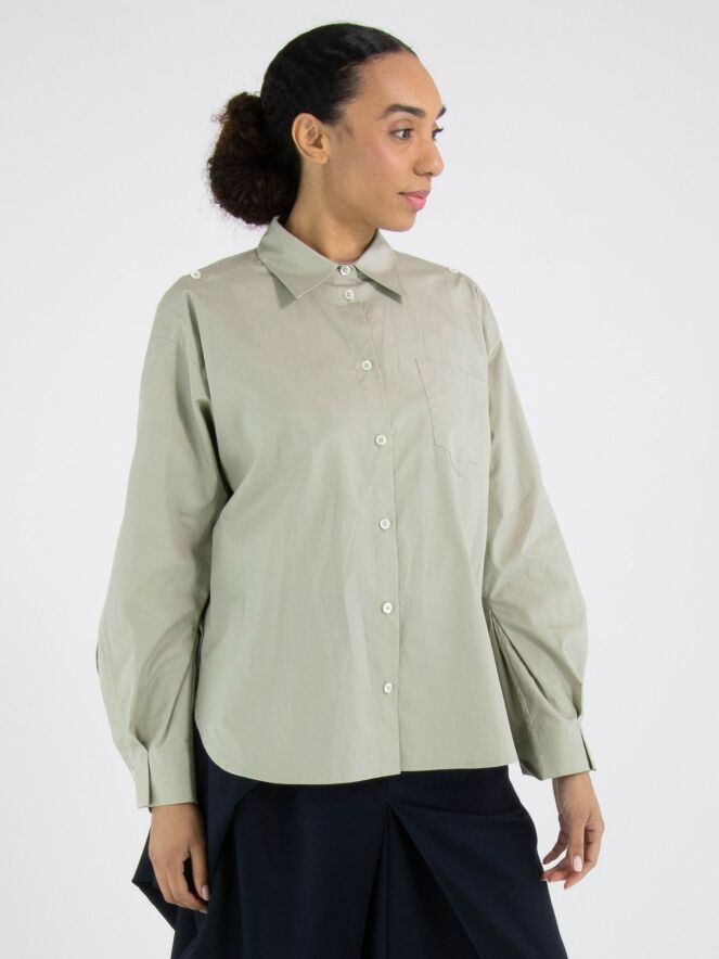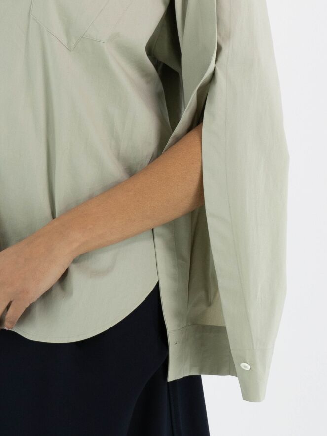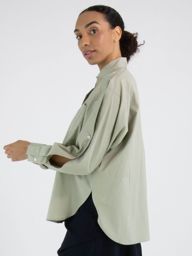 A blouse from High in a soft olive green colour. The chest pocket features a double asymmetric seam. The upper part of the long sleeves is open from the shoulder and partially closed with button fastenings. This blouse can be hand-washed.