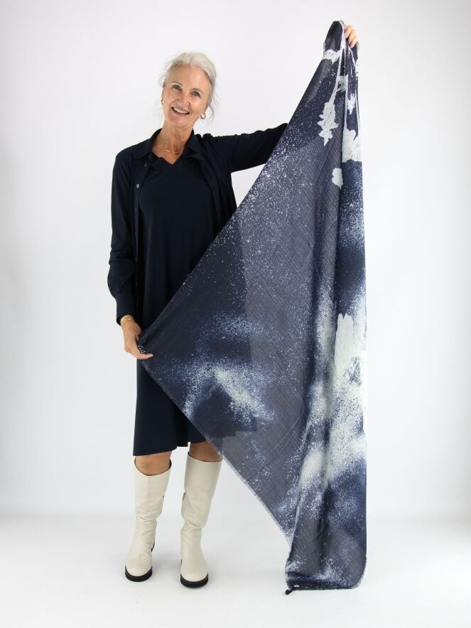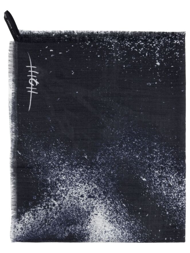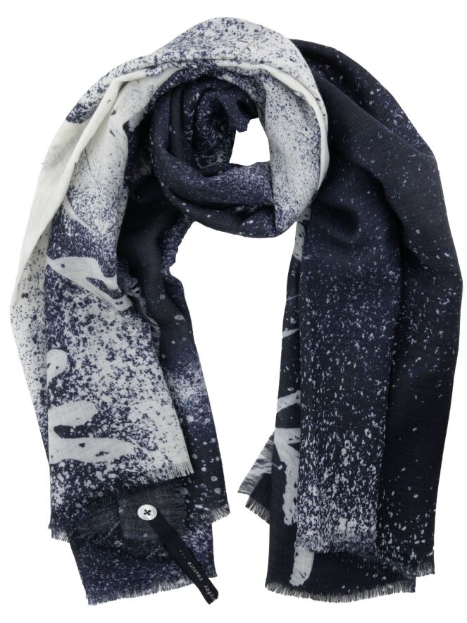 A scarf by High in a mottled dégradé from navy blue to off-white. The edges at the ends are finely frayed. This scarf should not be washed.