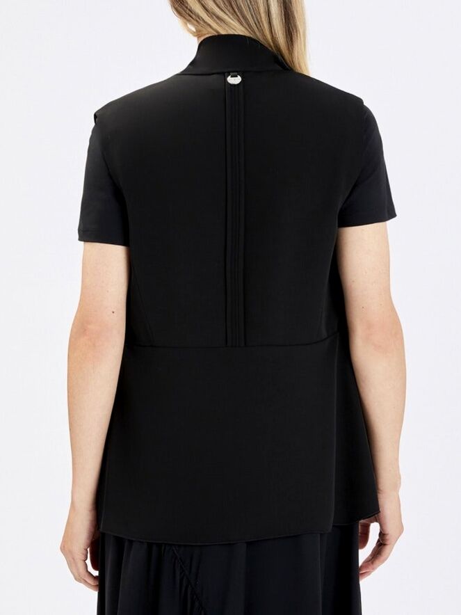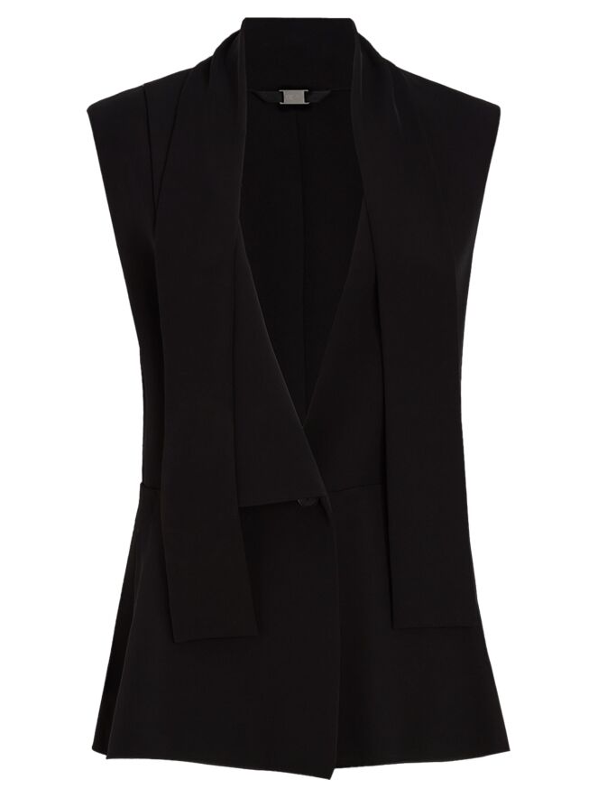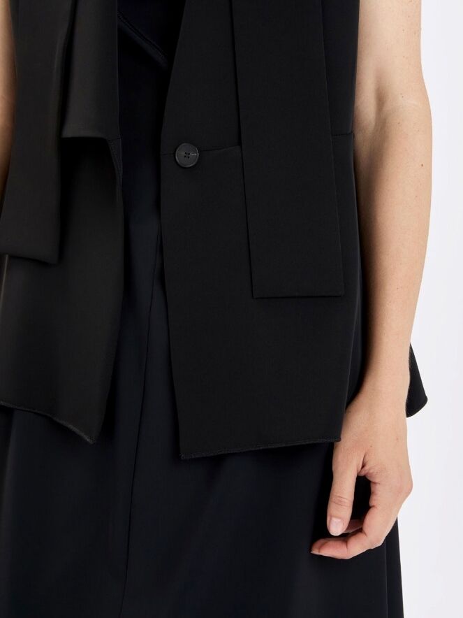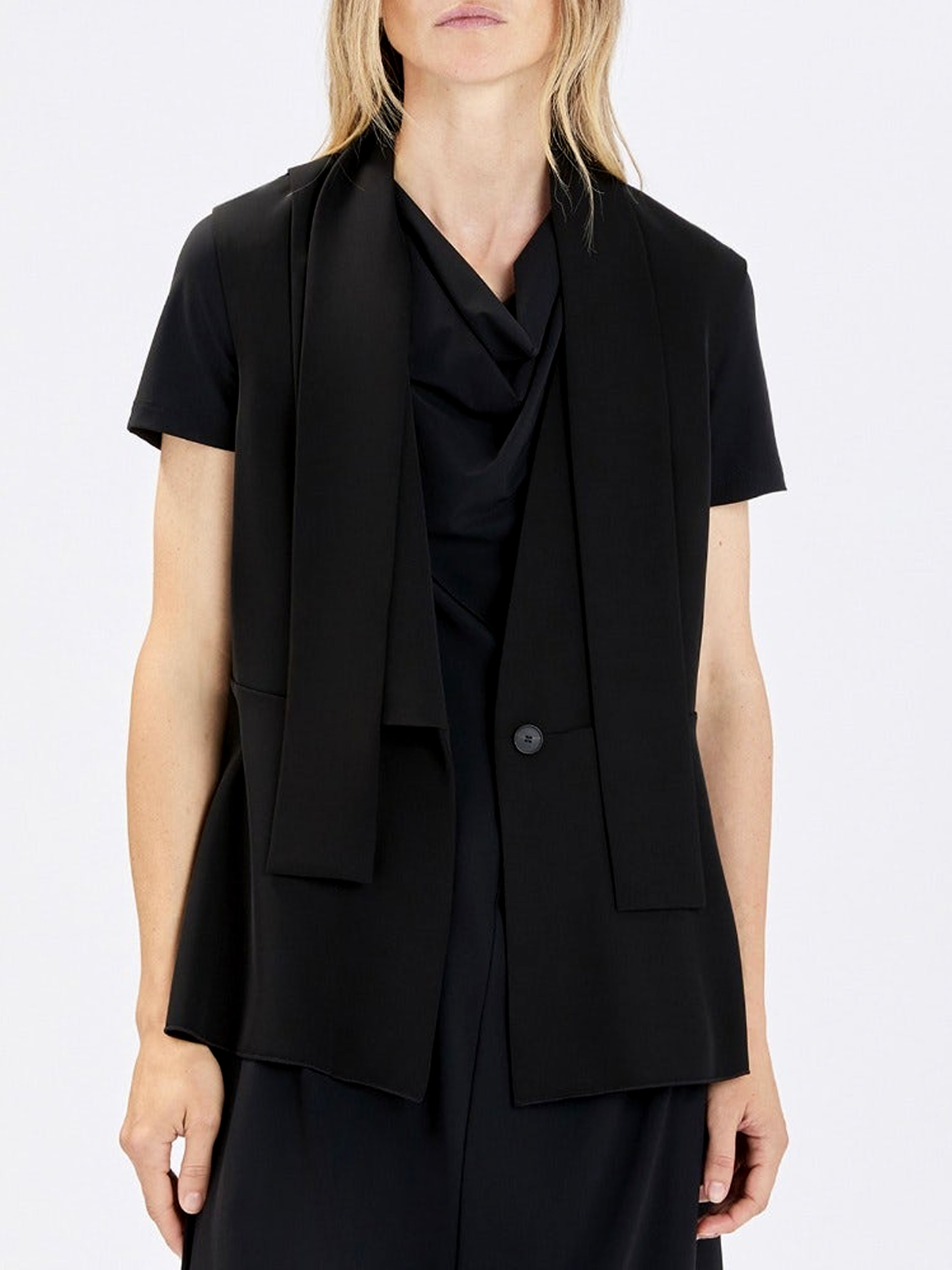 Gilet by High in black. The right side features a collar, while the left side remains collarless, creating an asymmetrical and contemporary look. From the shoulders, two long fabric ties drape down, visually forming a shawl-collar effect. The gilet fastens with a single button at the waist. Side slits extend up to the waistline for added movement. This exclusive designer gilet can be washed at 30 degrees.