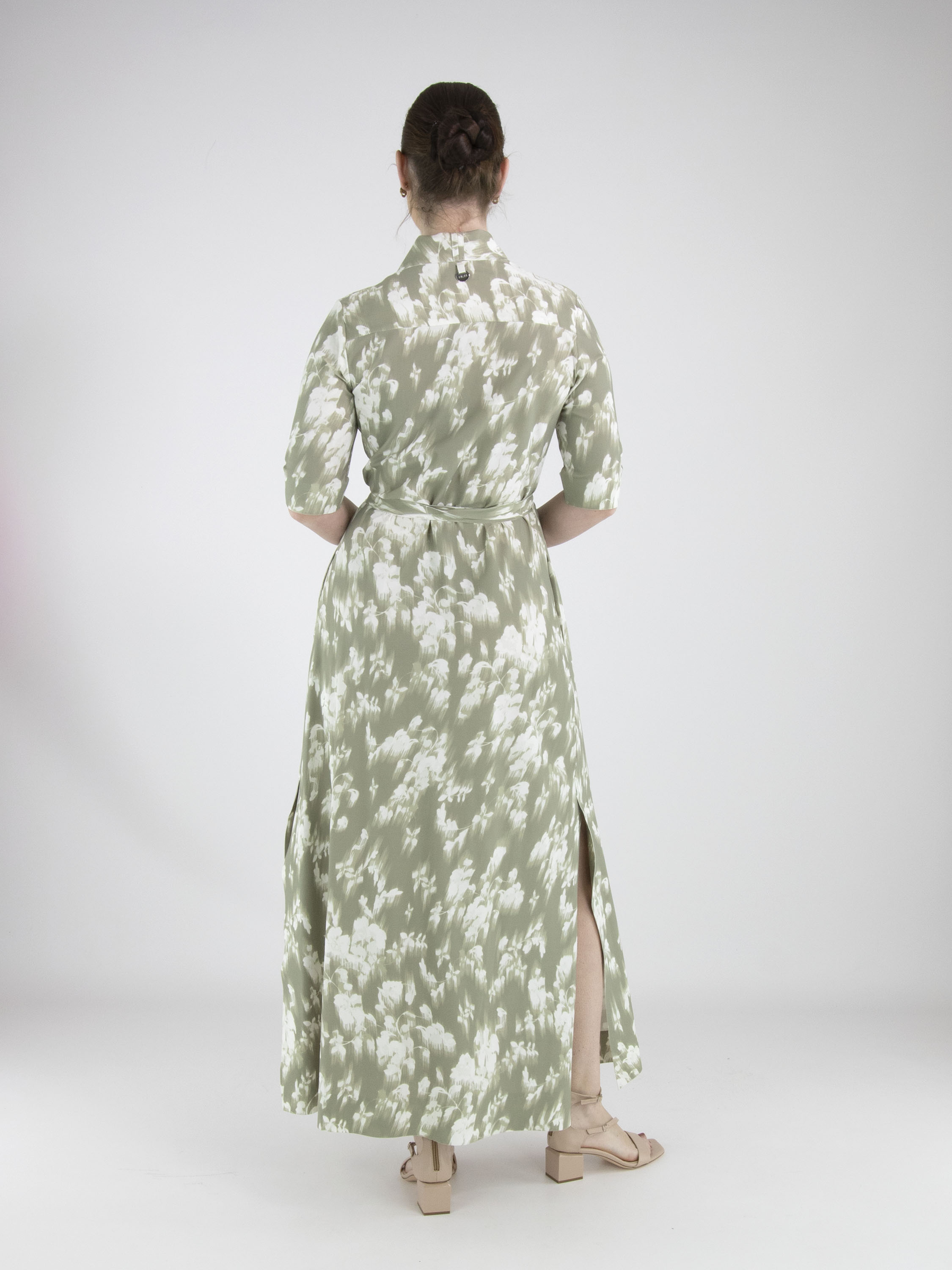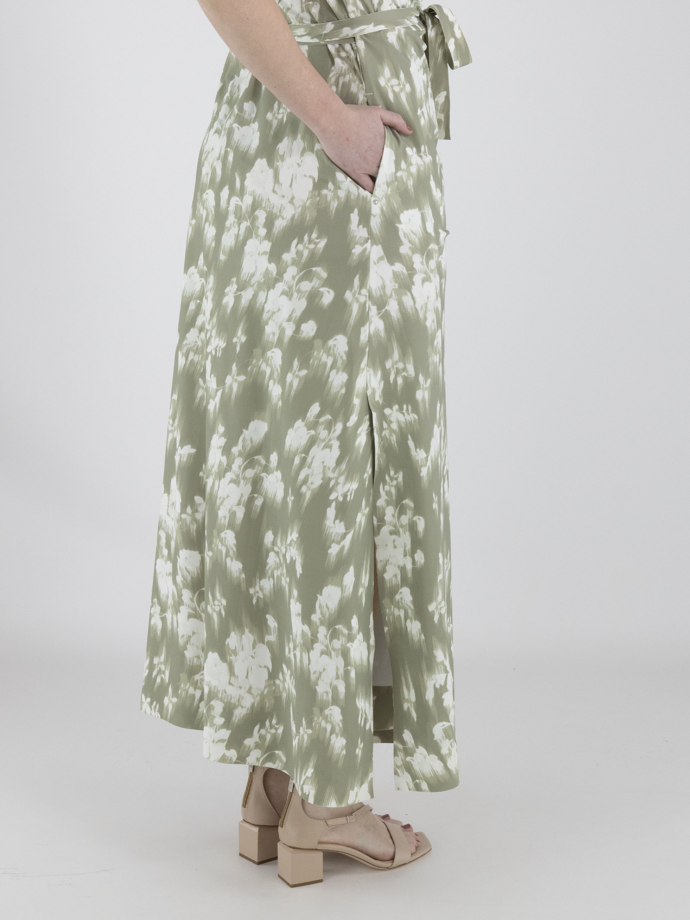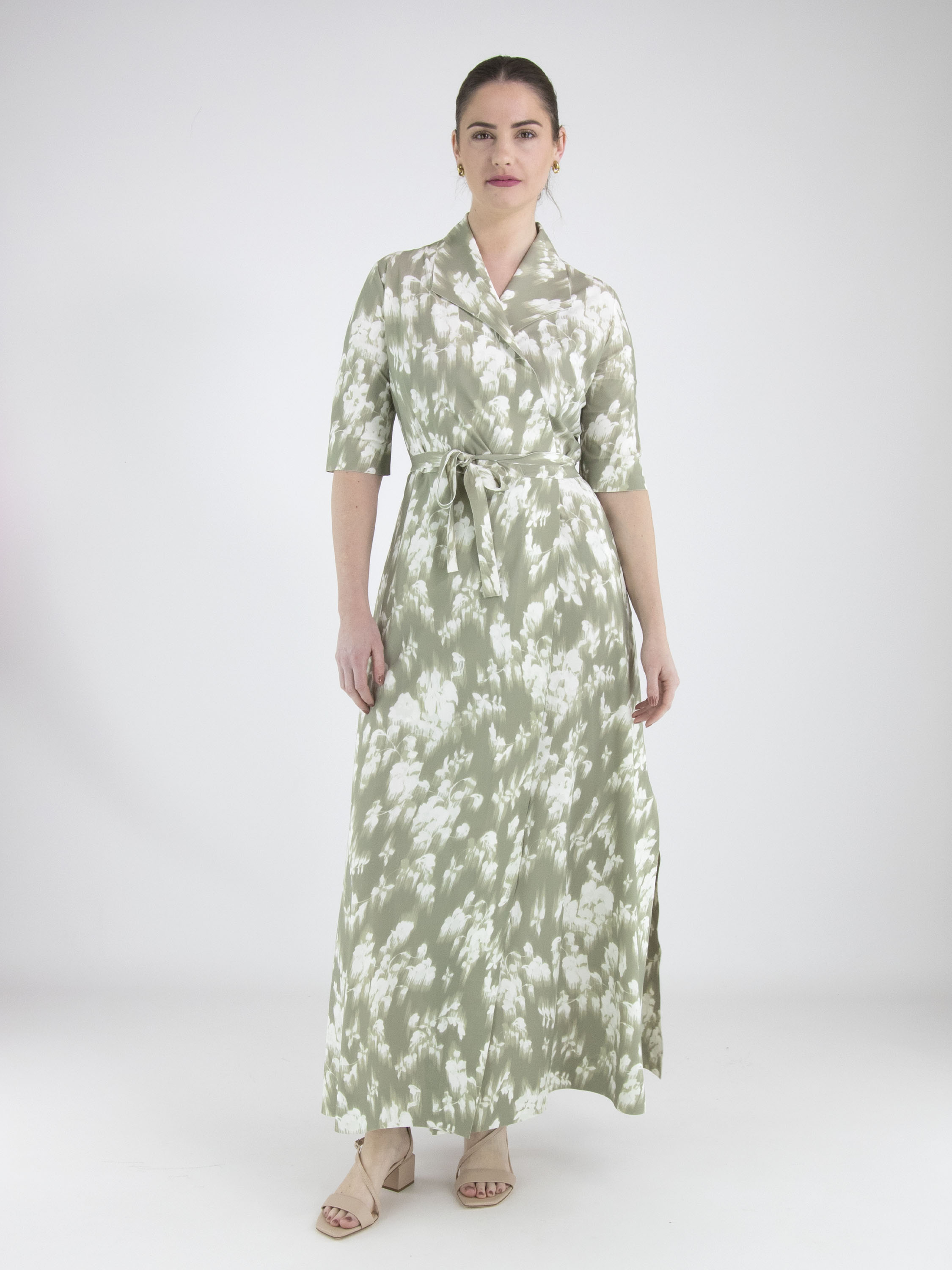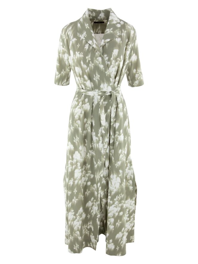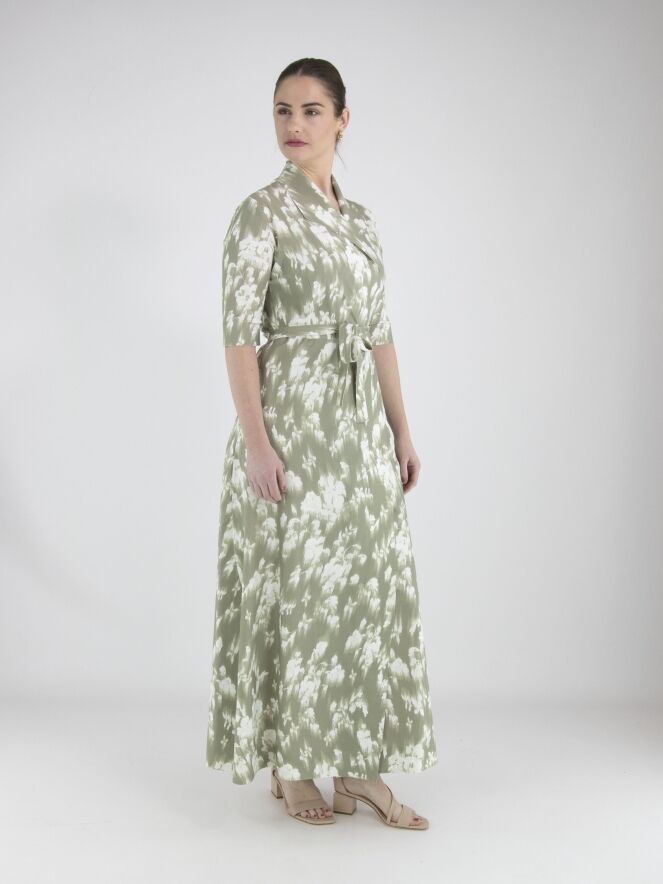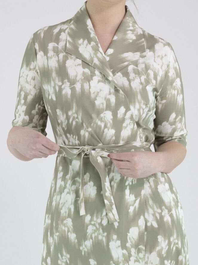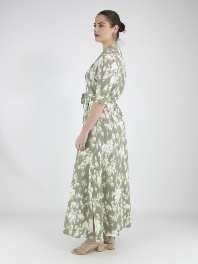 A wrap dress from High Tech with a brushed floral print in various shades of pastel olive green on an off-white background. The dress has short sleeves. At the hem, there is a slit on both sides. This dress can be hand-washed.