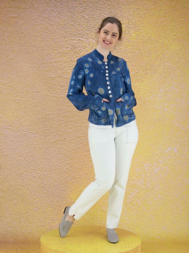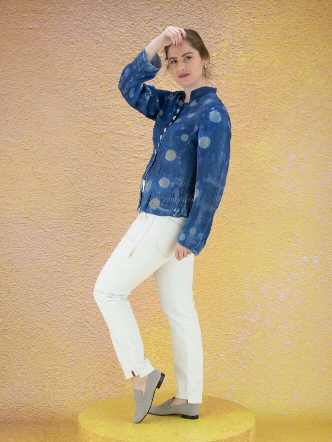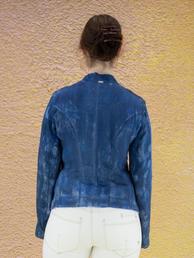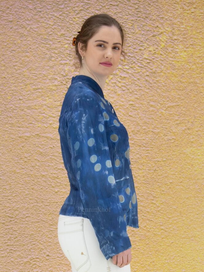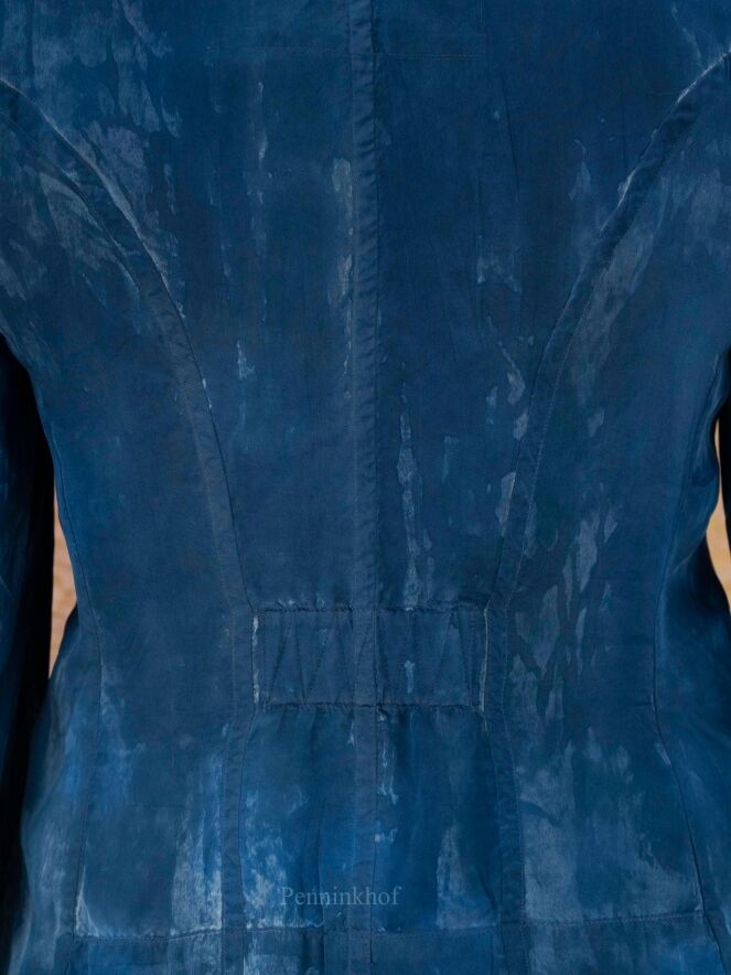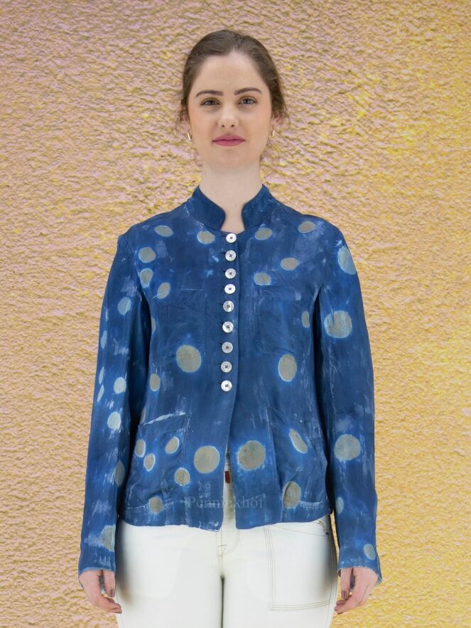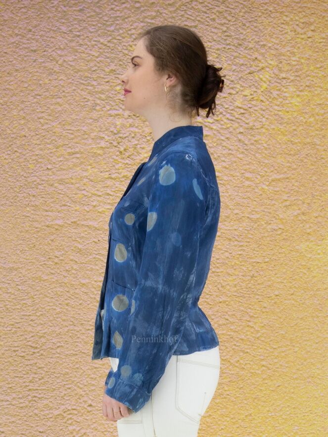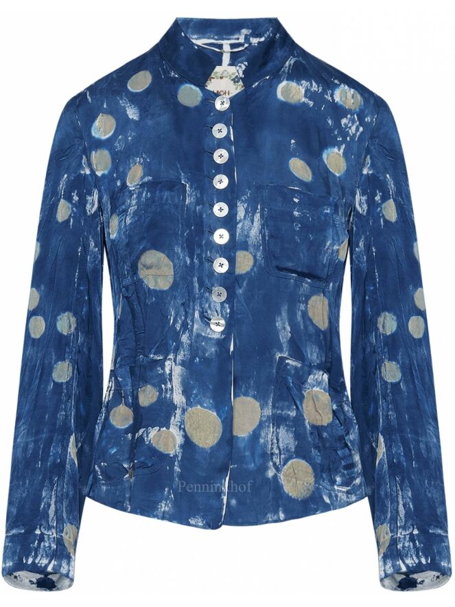 A creased blazer from High in a batik-like print in multiple shades of blue with random circles in the color taupe. The blazer is unlined and can be washed by hand.
