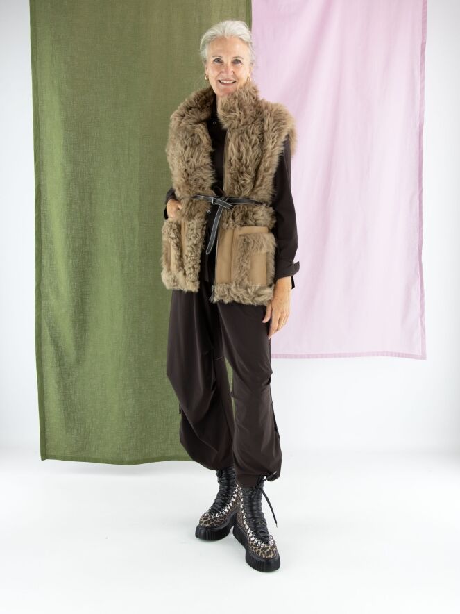A bodywarmer by High in a camel colour. The fur is left unshorn, except at the lower back and around the pockets. At the waist, there is a leather belt. This bodywarmer must not be washed.
