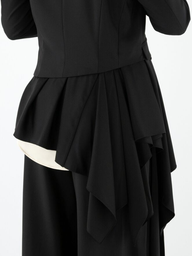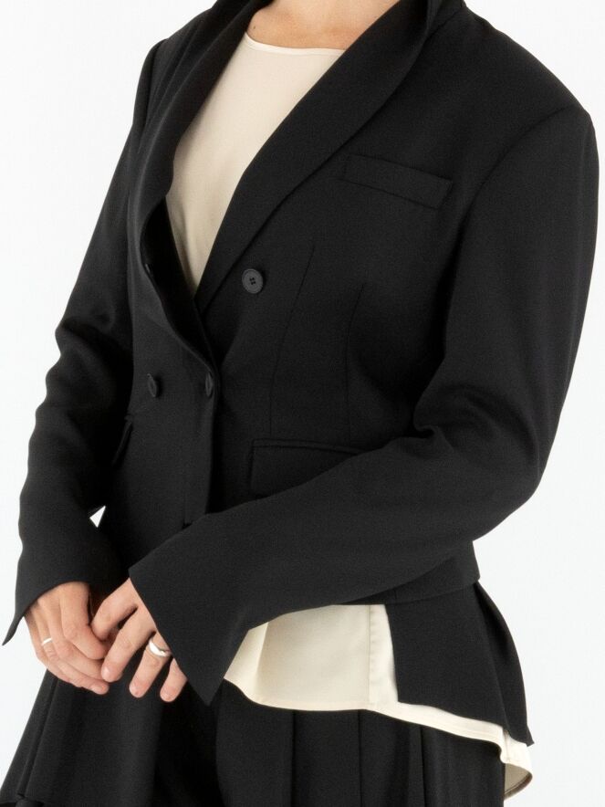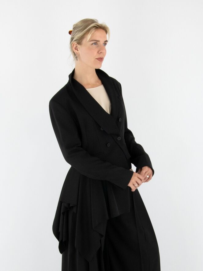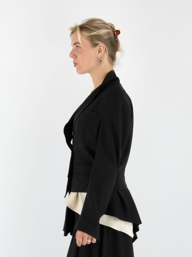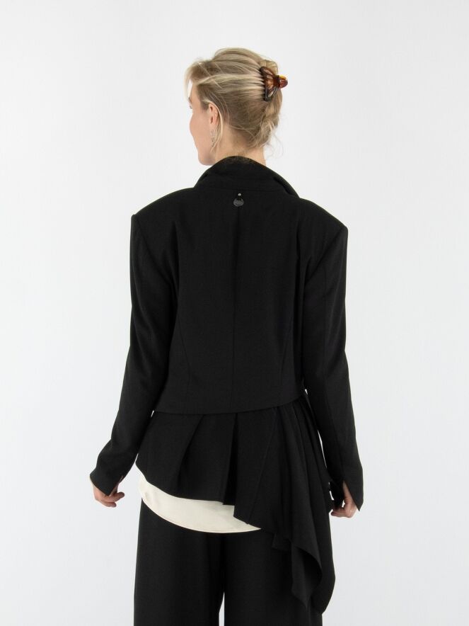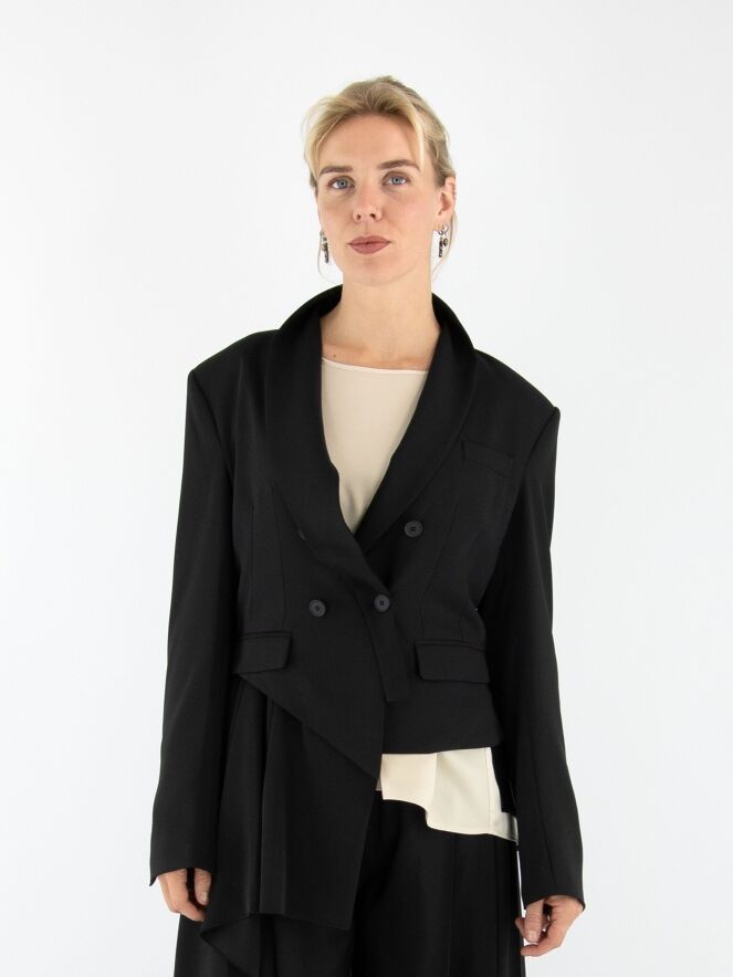 Short double-breasted blazer by High in black. The right lapel of the collar is partially detached from the blazer and secured at the double-breasted fastening. At the lower right side, a matte satin panel runs diagonally from the right side of the blazer across the back to the left side. The blazer is fully lined and should not be washed.