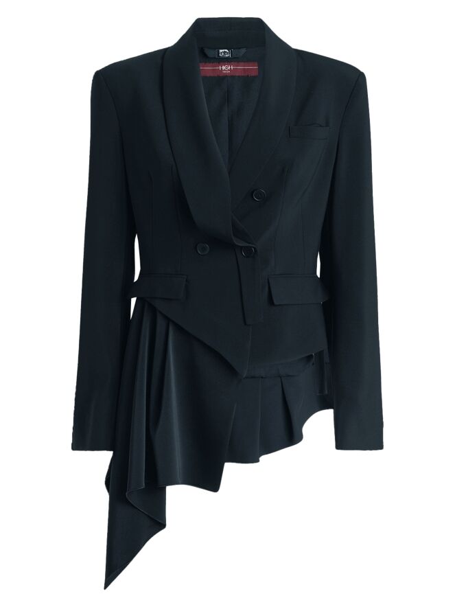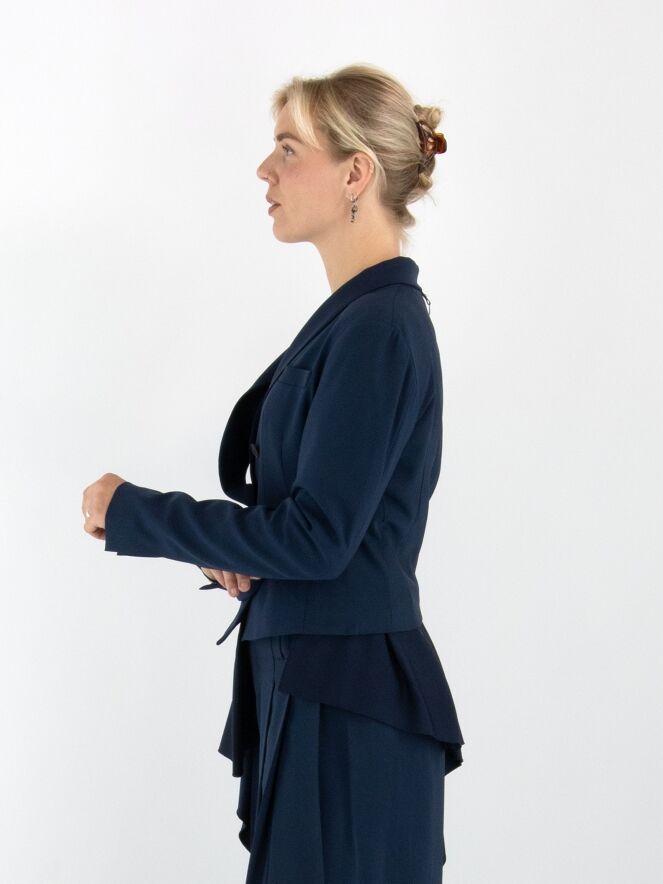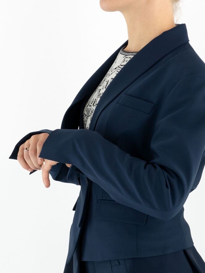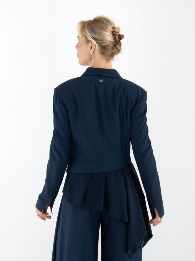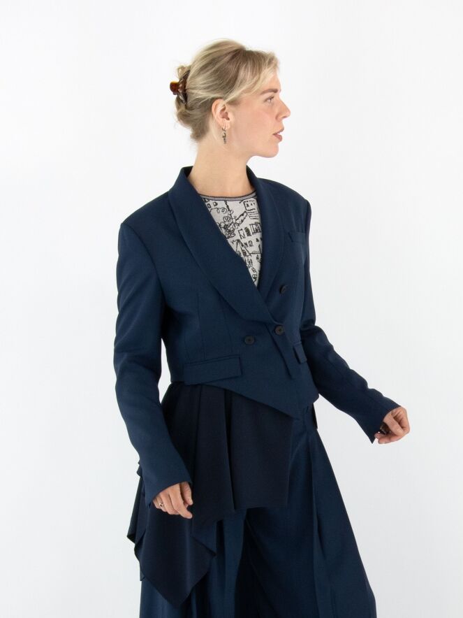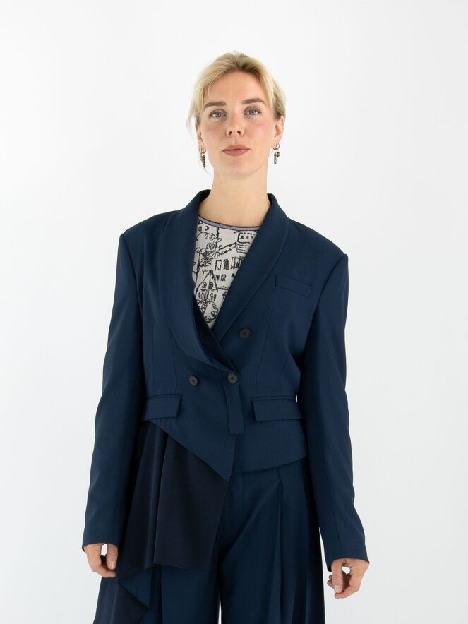 A short double-breasted blazer by High in midnight blue. The right lapel of the collar is partially detached and secured at the closure, creating a unique design effect. At the lower right side, a matte satin insert runs diagonally from the right side across the back to the left side. The blazer is fully lined and cannot be washed.