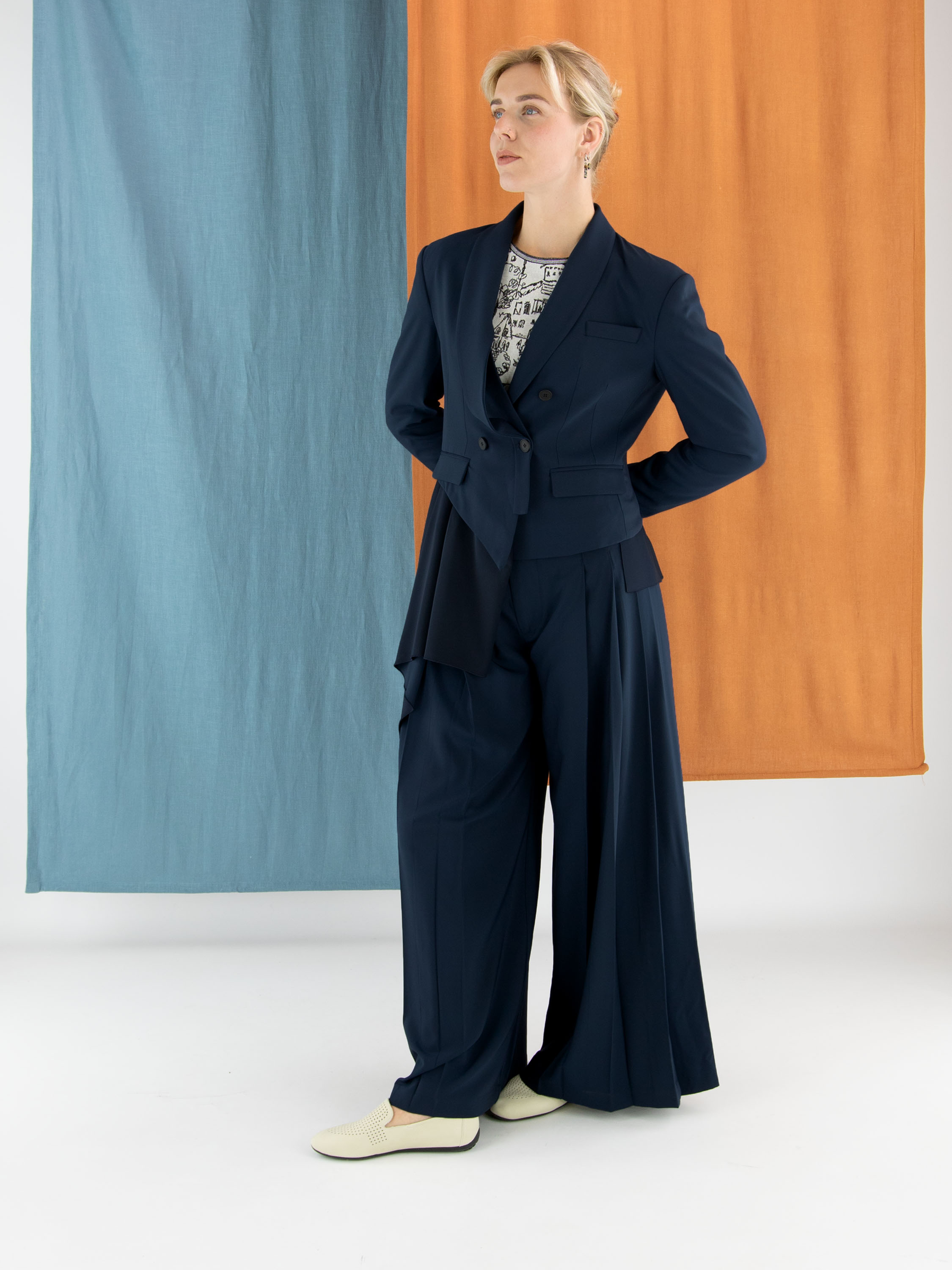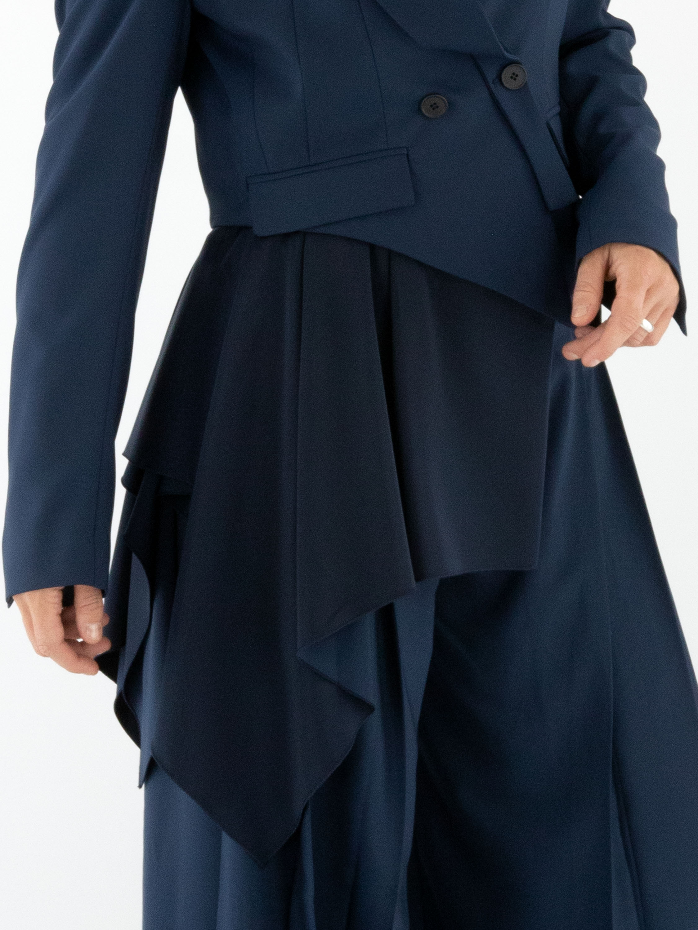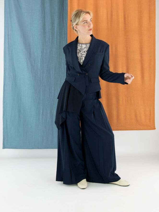 A short double-breasted blazer by High in midnight blue. The right lapel of the collar is partially detached and secured at the closure, creating a unique design effect. At the lower right side, a matte satin insert runs diagonally from the right side across the back to the left side. The blazer is fully lined and cannot be washed.