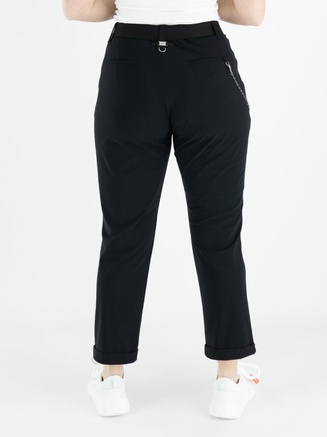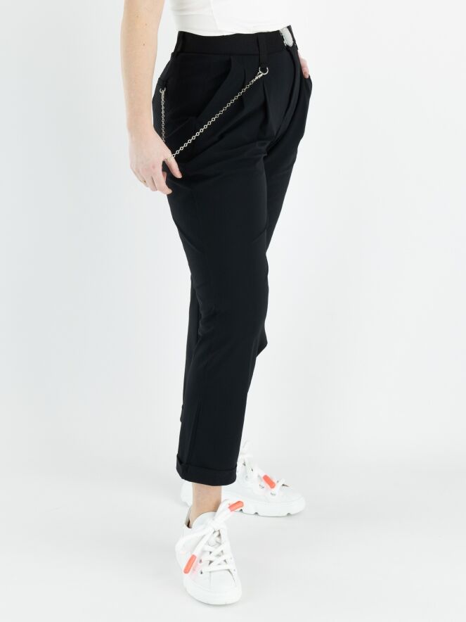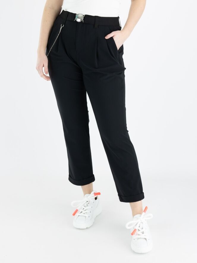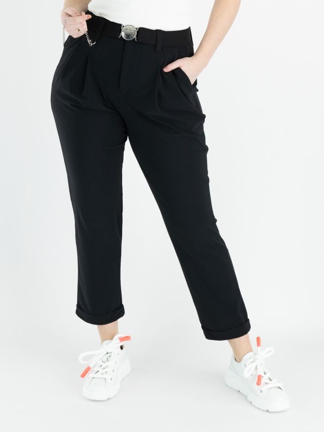 High trousers in black. There is an elastic belt at the waist with a silver round buckle. Multiple pleats extend from the waist. There is a short cuff at the bottom of the legs. The trousers have side pockets and can be washed at 30 degrees.