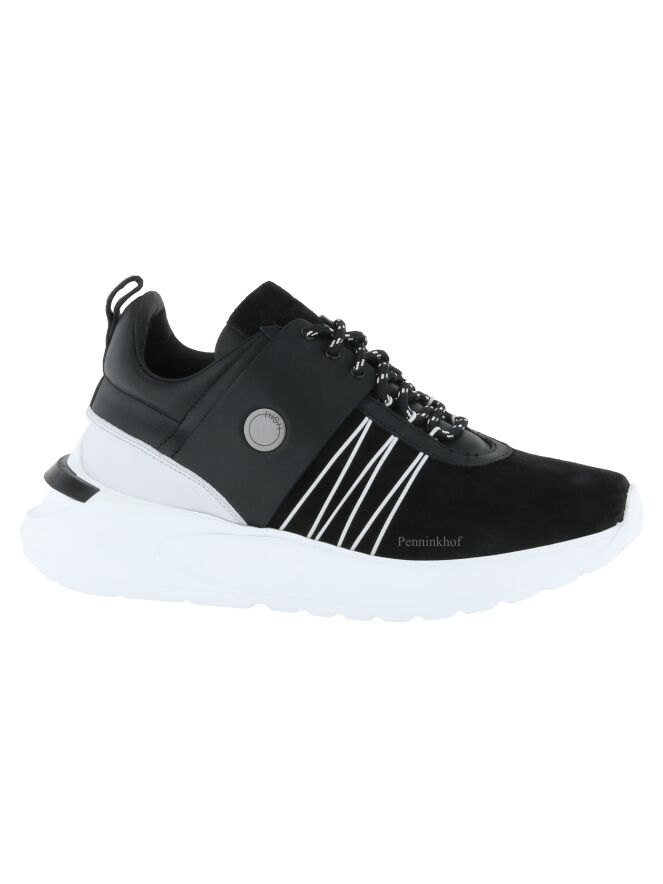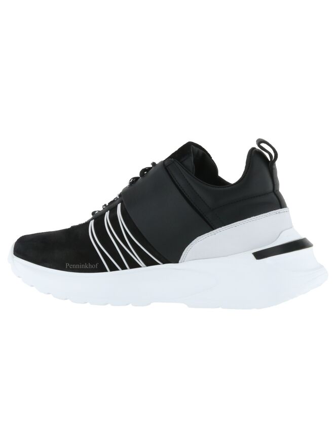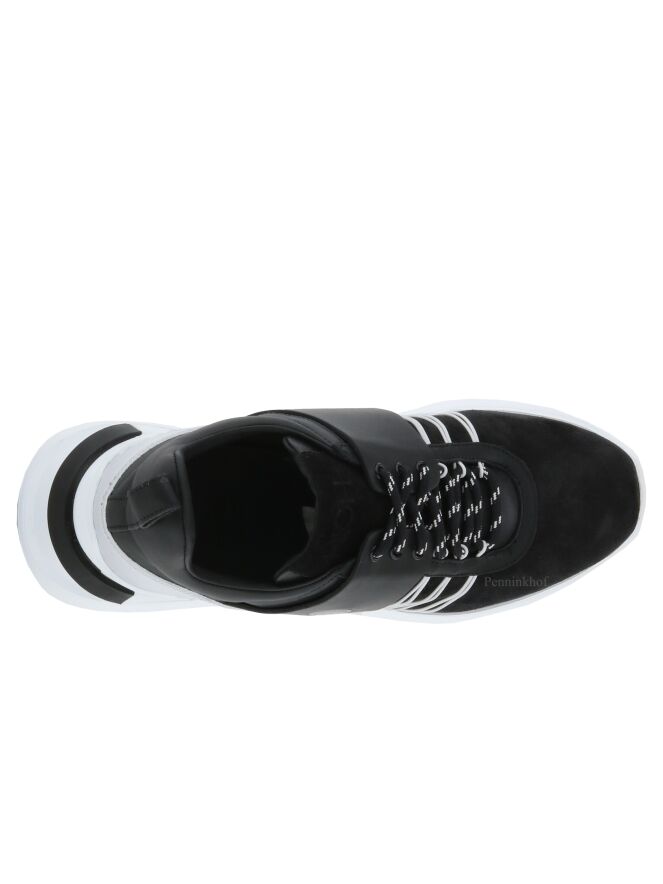 A sneaker from High in a black color. The forefoot is in suede and from the sides to the heel, the sneaker is in leather. Along the sides are decorative cords in a white color. The sole in a light diagonal line is in a white color with a white stripe on the heel. The inside is lined with leather.